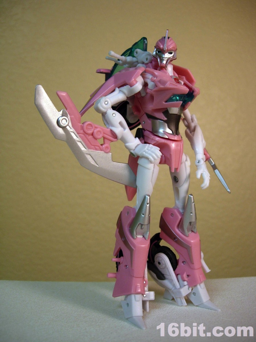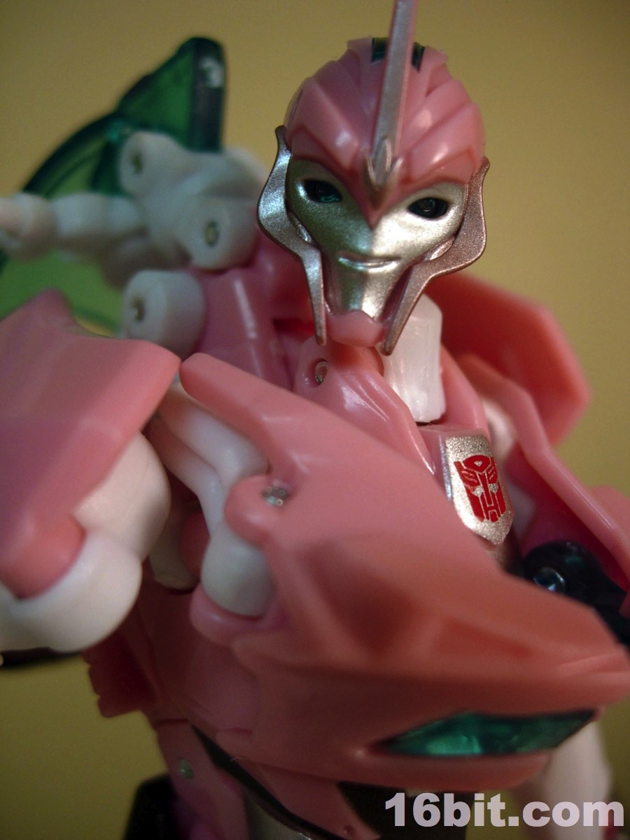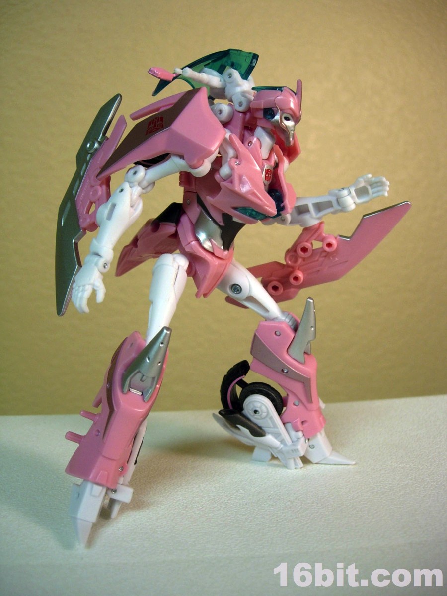 I don't know why, but Hasbro seems intent on delaying Transformers Prime at retail shelves-- at least they've been nice enough to trickle out a few prepaints of figures like Arcee so you can enjoy something before the line launches properly! The pink Autobot is actually blue on the TV show, but pink-- girly pink-- scratches a G1 itch and will no doubt delight most of the adult fans who wished she were pink in the first place. The blue version just came out days ago, but this came out first and is therefore awesomer.