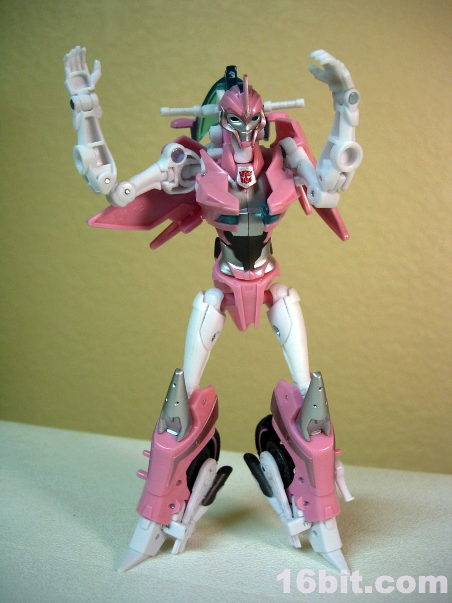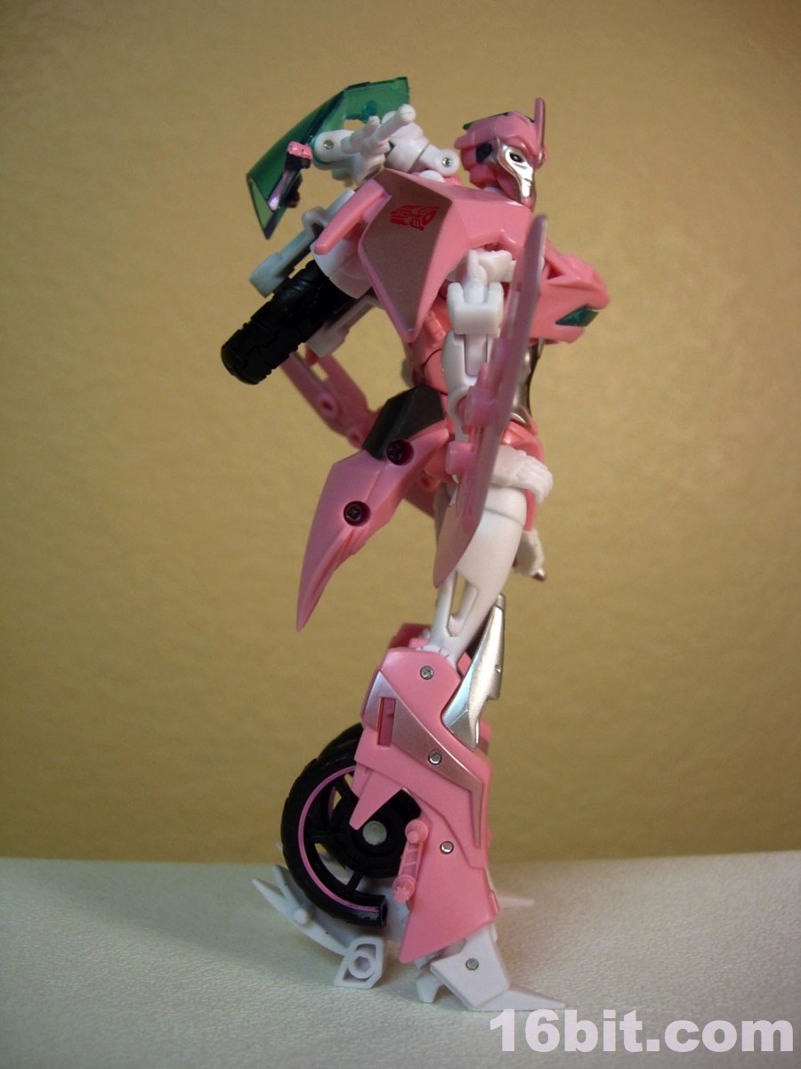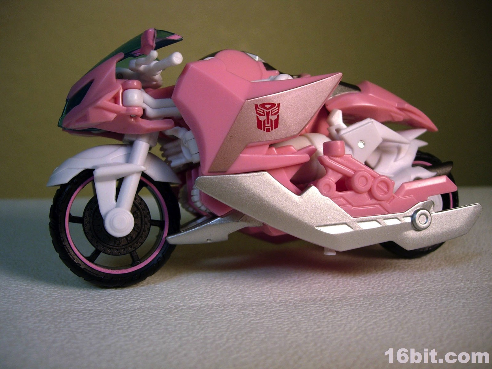 I don't know why, but Hasbro seems intent on delaying Transformers Prime at retail shelves-- at least they've been nice enough to trickle out a few prepaints of figures like Arcee so you can enjoy something before the line launches properly! The pink Autobot is actually blue on the TV show, but pink-- girly pink-- scratches a G1 itch and will no doubt delight most of the adult fans who wished she were pink in the first place. The blue version just came out days ago, but this came out first and is therefore awesomer.