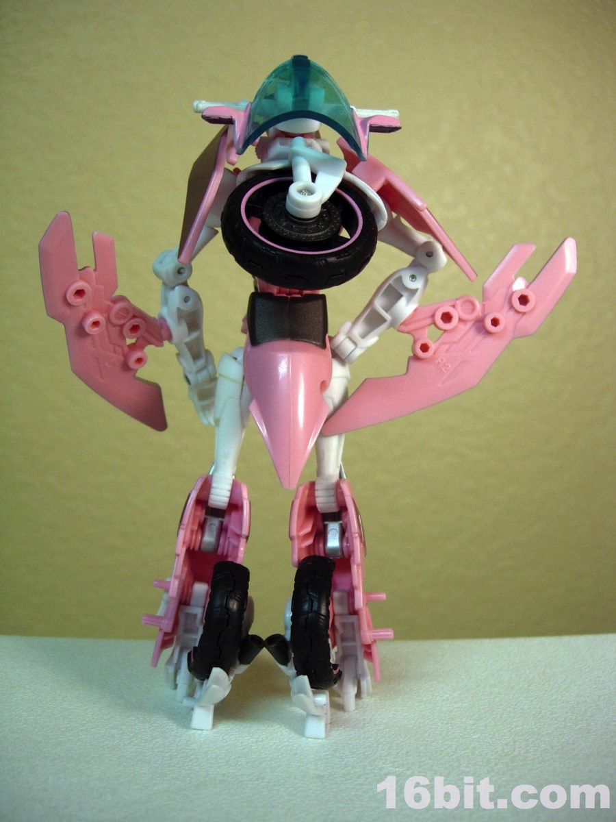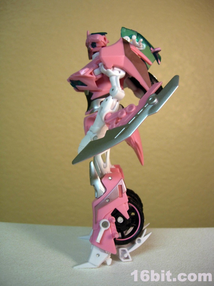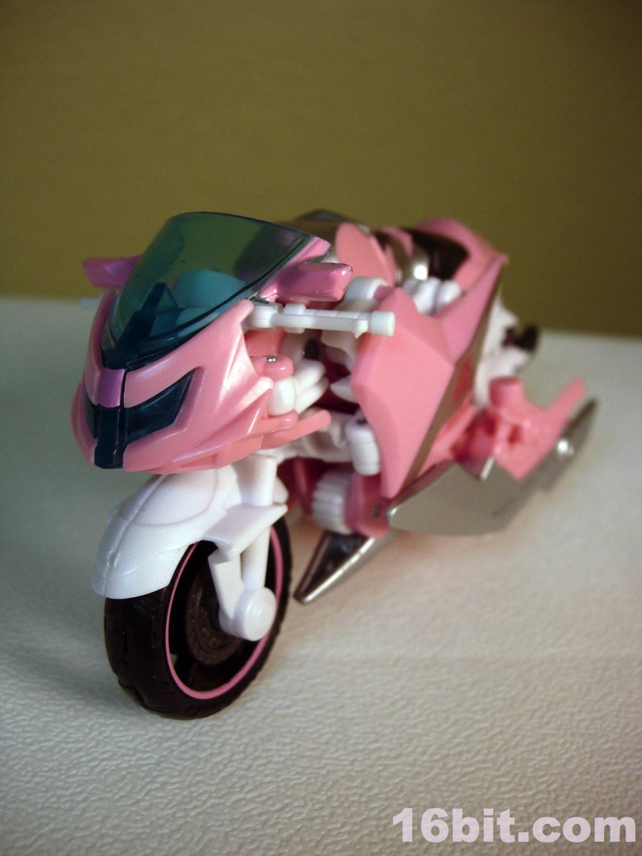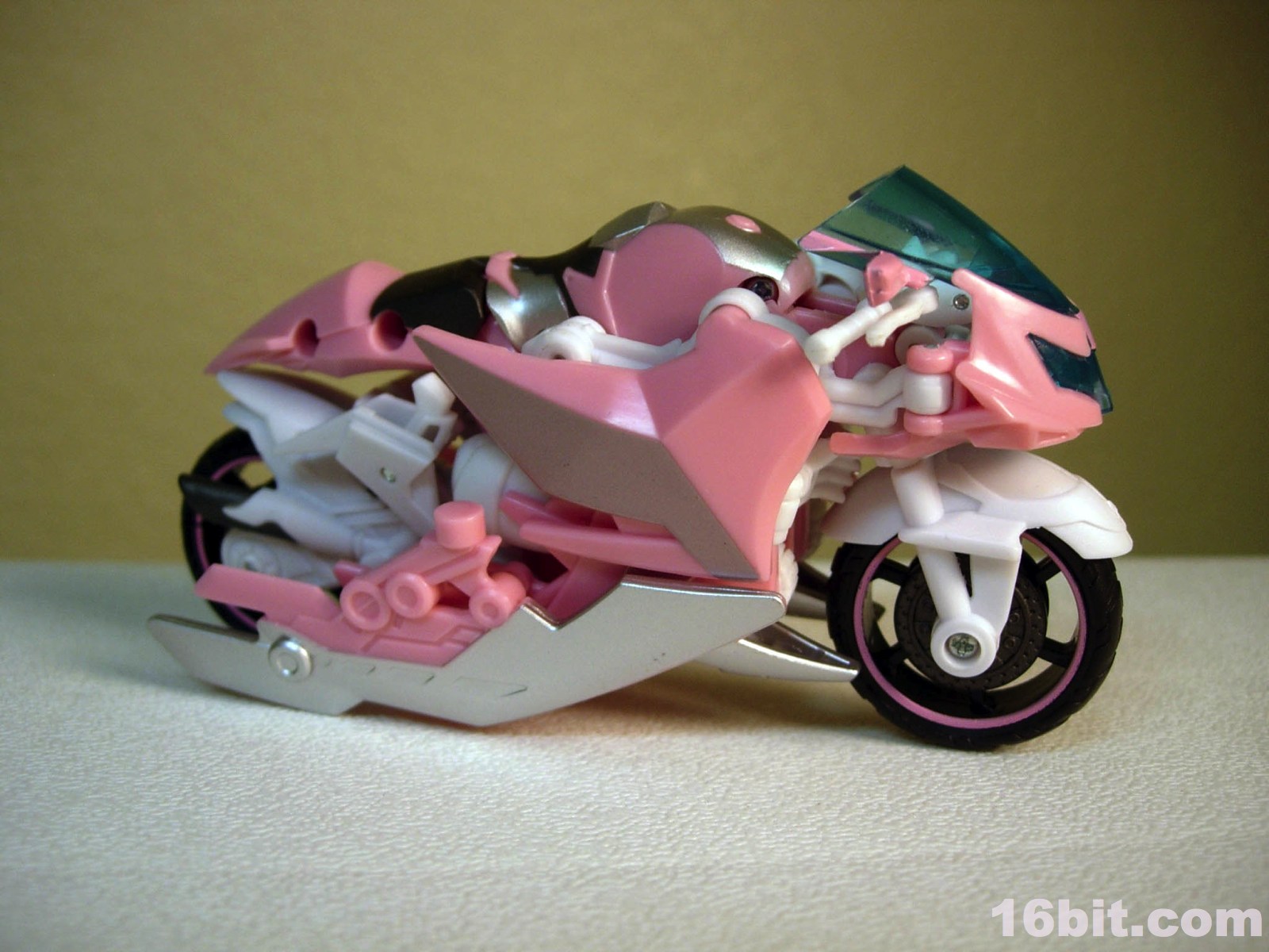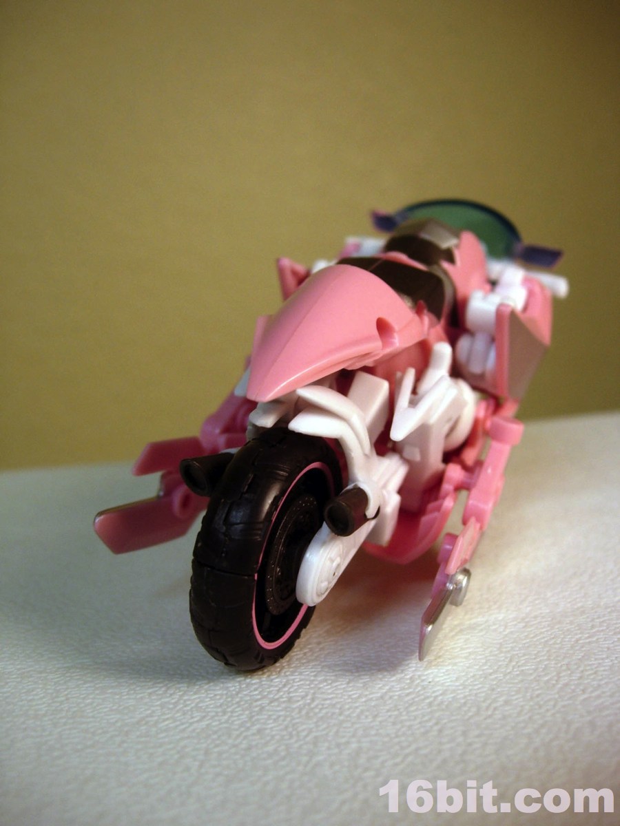 In vehicle mode, she's a bike. There's a kickstand which doesn't add much support, as her blade weapons tend to provide most of her stability. Balance is an issue due to the shape of the tires, but again, she was designed to lean. The pink bike is a throwback to several previous Arcees, meaning those who were hoping for or expecting a "classic" version are going to be left wanting for at least another year or two at this rate. The wheels spin nicely, and it almost feels like a figure could be able to ride her-- but Hasbro opted not to go that route for this one. (Hey, it worked for Kicker!)