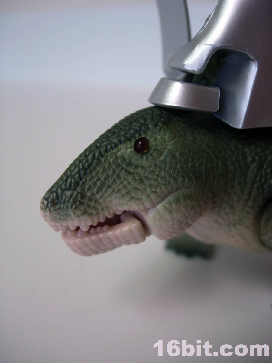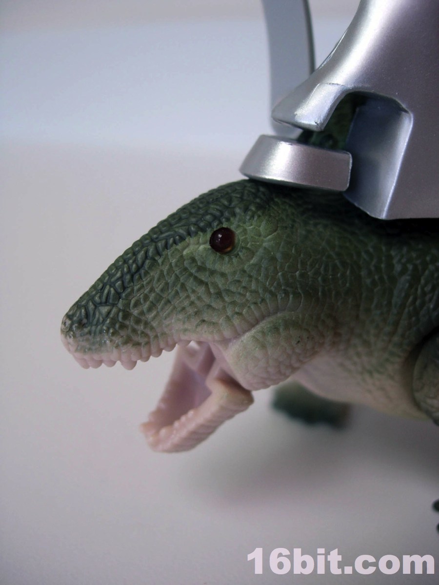 The idea of this figure set is that the dinosaur had the ability to hide his secret on the other side of his fin. Basically, all the gear could be (mostly) placed on one side, so it would just look like a prehistoric beast and then BLAMMO, here are some pop-out guns and a cherry-picker seat thing with more guns on it. Logically it doesn't really work, but as a toy? This is fantastic. The swing-out chair is really fun, and the pop-out guns are a satisfying play feature. The only way they could possibly be better would be to make them activated by a spring-loaded button, or to add firing rockets. The set feels like it was designed more for displaying and collectors than it was as a toy in this respect, because most of the play comes from posing the creature. Well, except for his spring-loaded button-activated jaws. I can just sit here pushing that switch all day, it's a ton of fun. (And no I am not abusing any substances at the moment. It's just a fantastic and simple mechanism.)