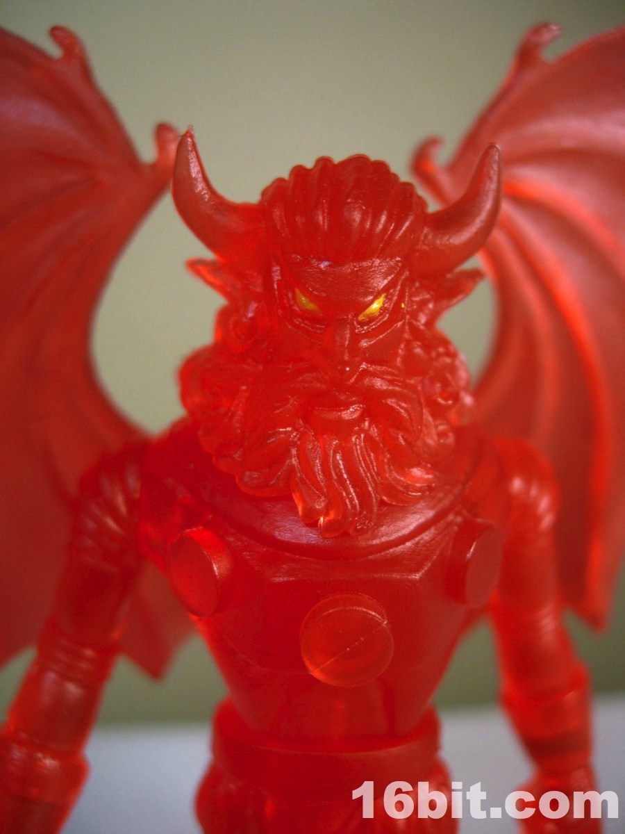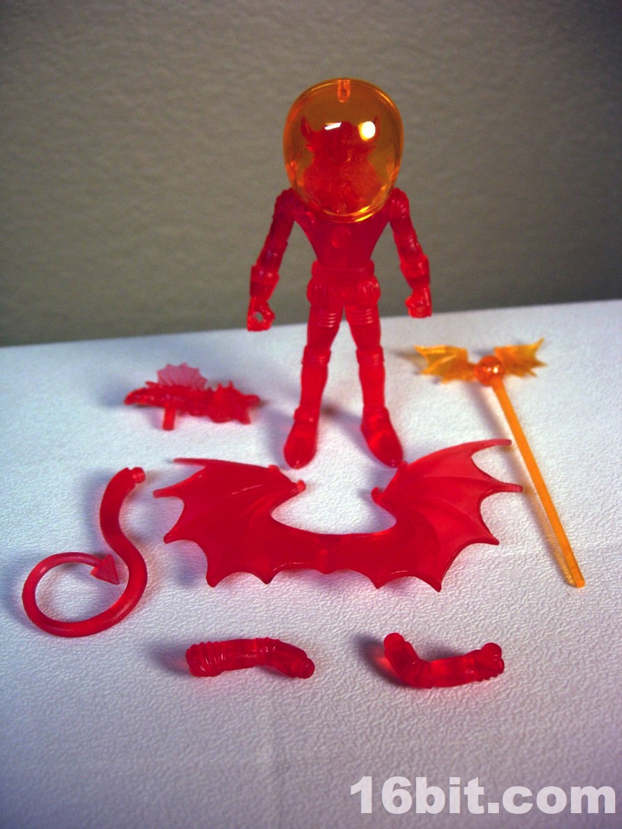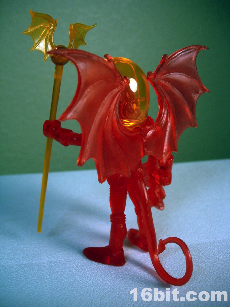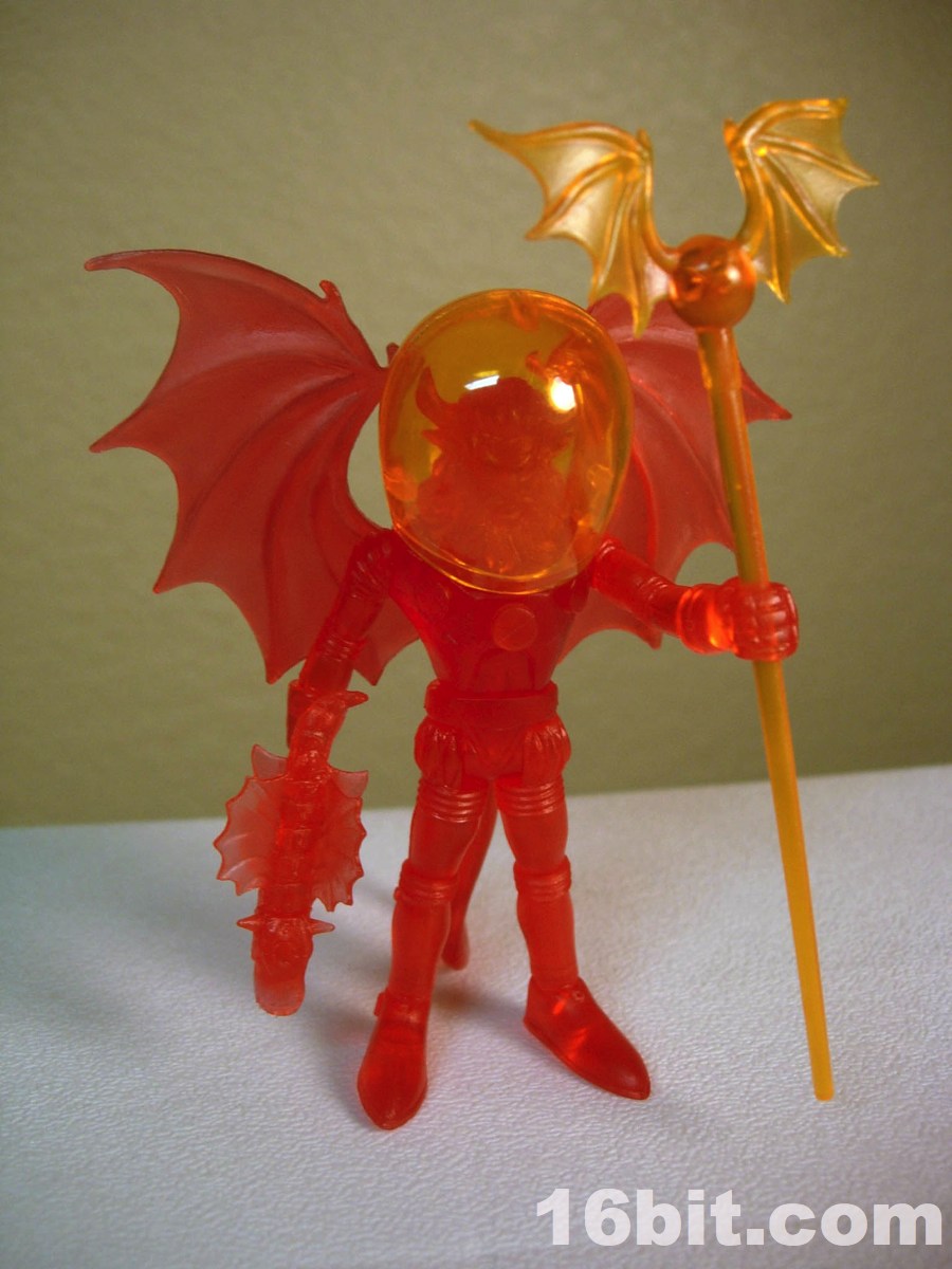 The gargoyle gun is back, as is the winged orb staff, both of which are neat and would be neater if painted. The 2-piece helmet is cast in clear orange ABS plastic, and pops off fairly easily if you want it to-- but mine hugs the head nicely, so that's a plus. The figure is cast in red, with yellow eyes painted to give him a menacing, yet Micronauts-esque visage.