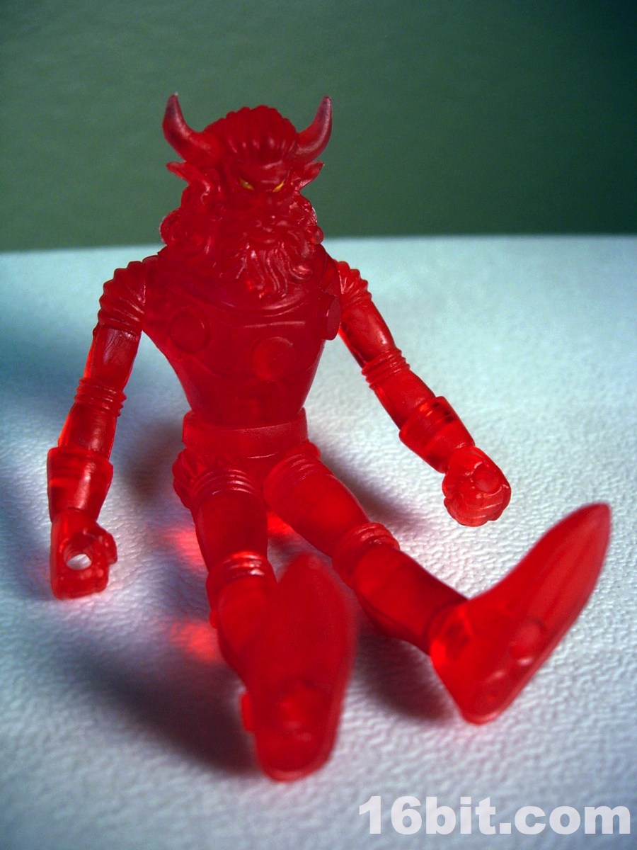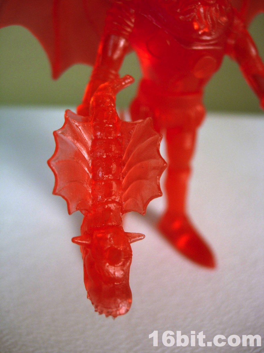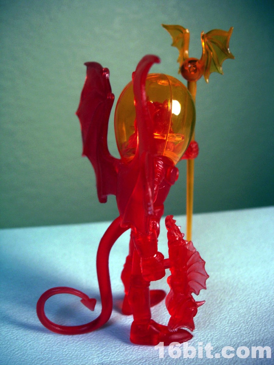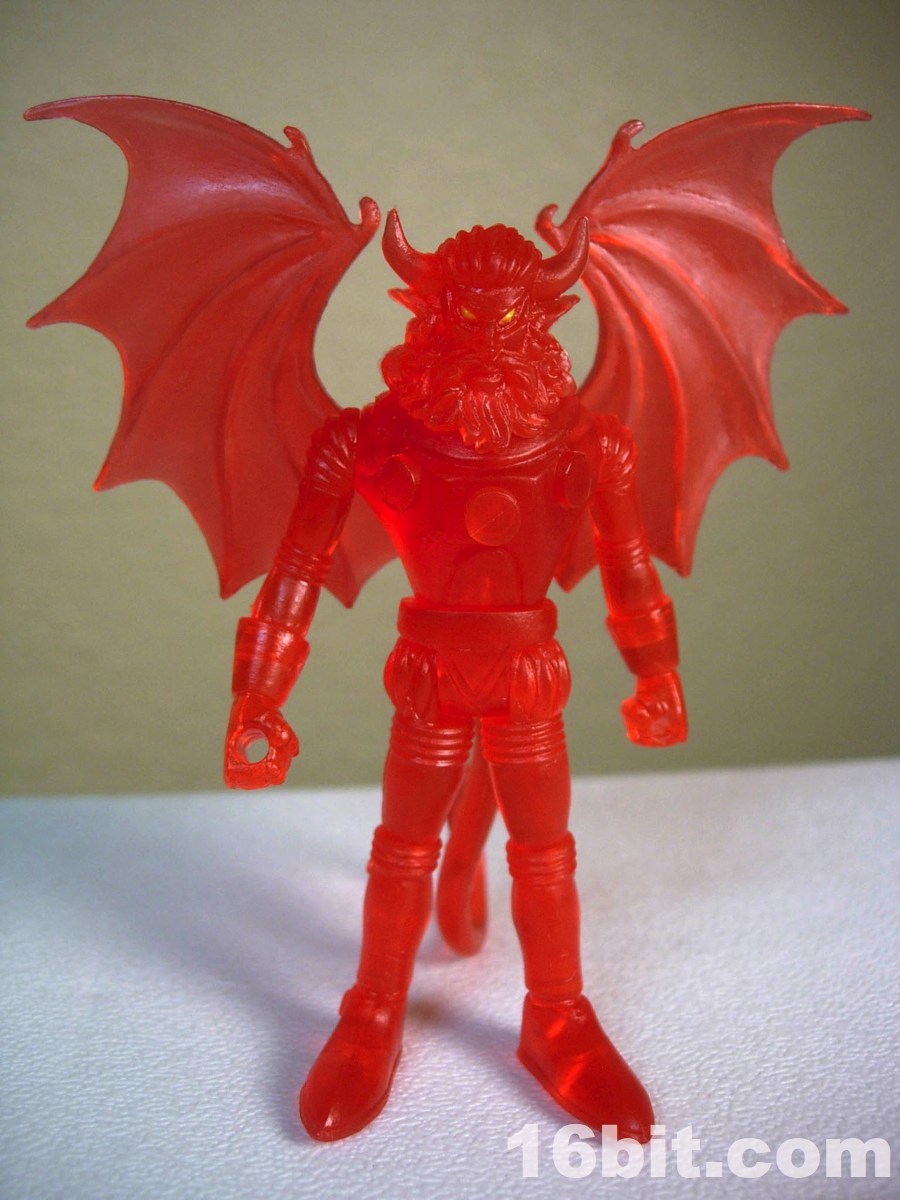 The gargoyle gun is back, as is the winged orb staff, both of which are neat and would be neater if painted. The 2-piece helmet is cast in clear orange ABS plastic, and pops off fairly easily if you want it to-- but mine hugs the head nicely, so that's a plus. The figure is cast in red, with yellow eyes painted to give him a menacing, yet Micronauts-esque visage.
