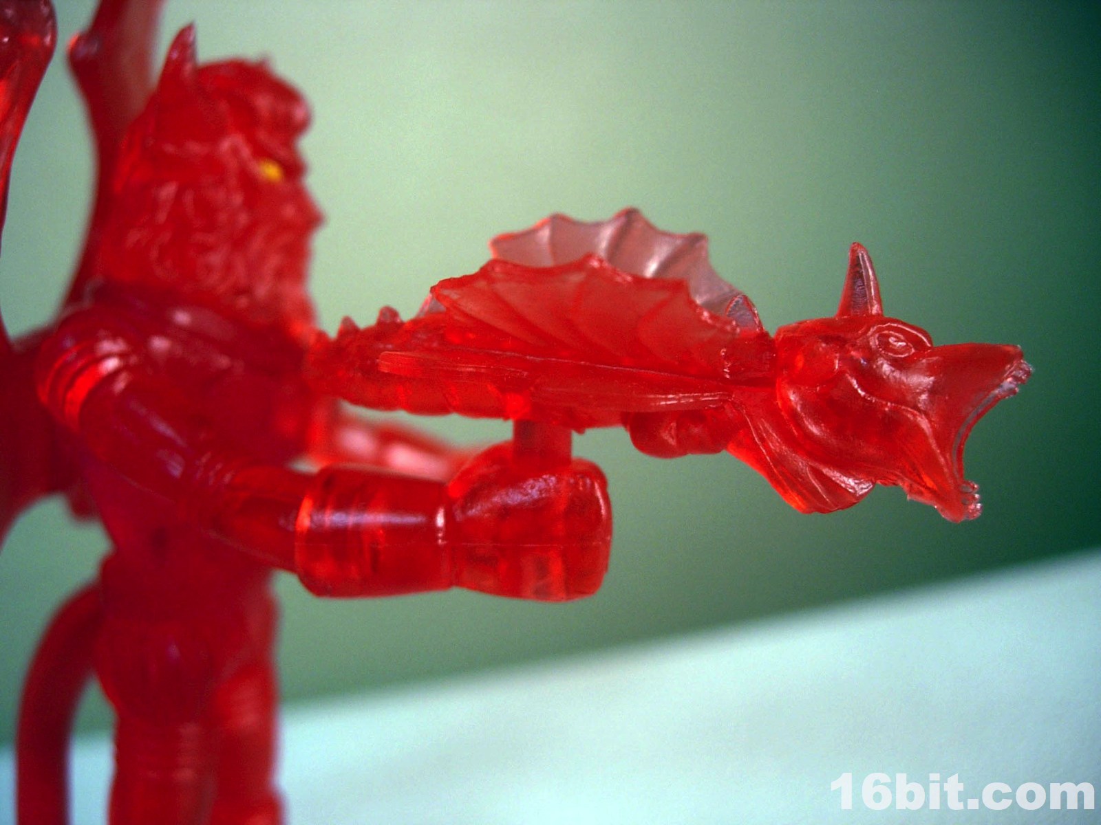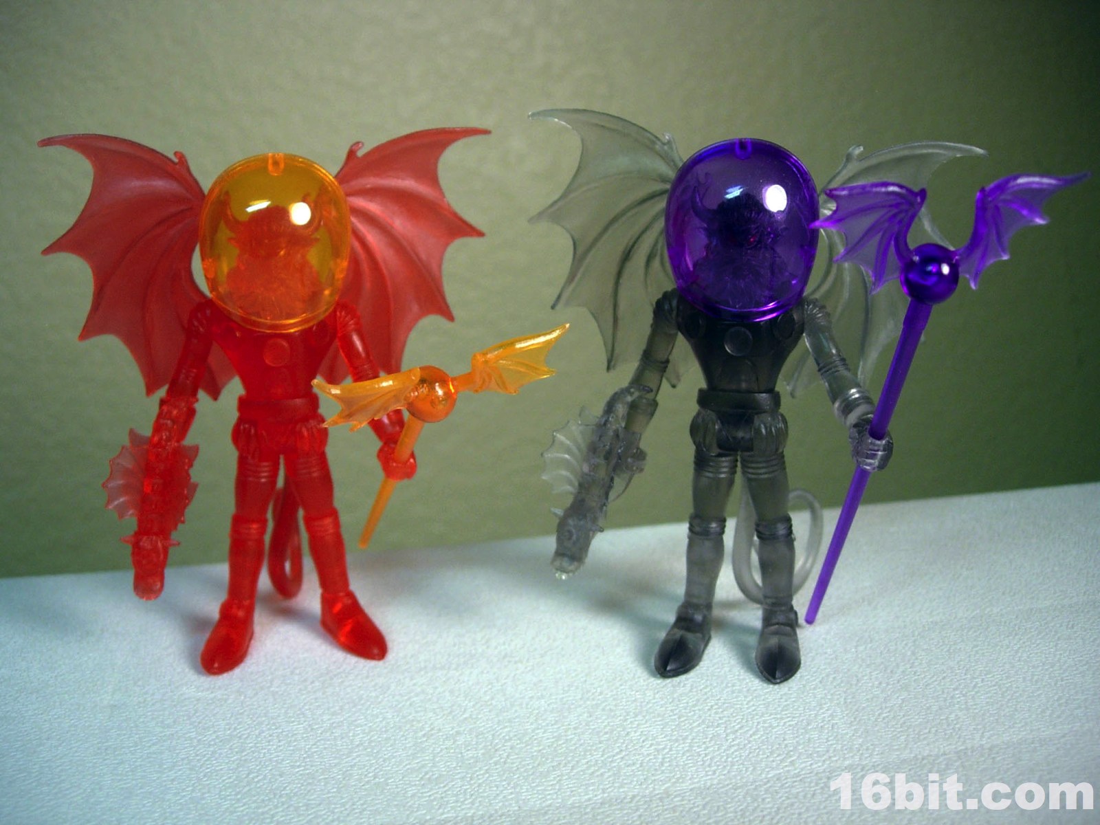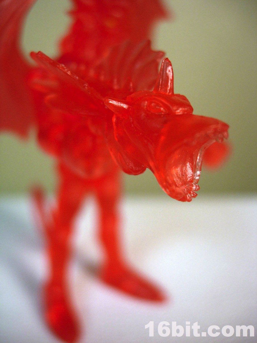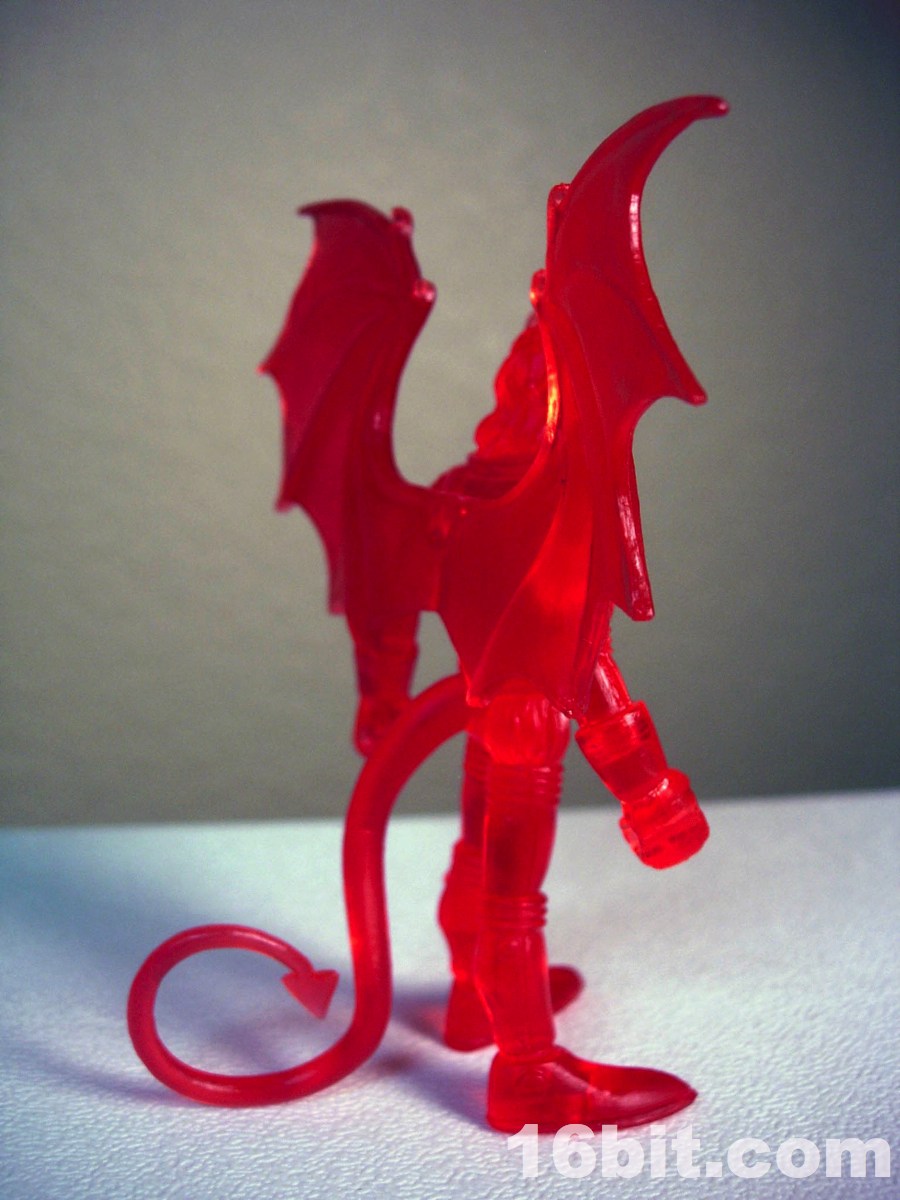 The gargoyle gun is back, as is the winged orb staff, both of which are neat and would be neater if painted. The 2-piece helmet is cast in clear orange ABS plastic, and pops off fairly easily if you want it to-- but mine hugs the head nicely, so that's a plus. The figure is cast in red, with yellow eyes painted to give him a menacing, yet Micronauts-esque visage.