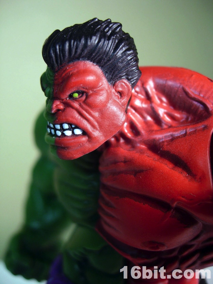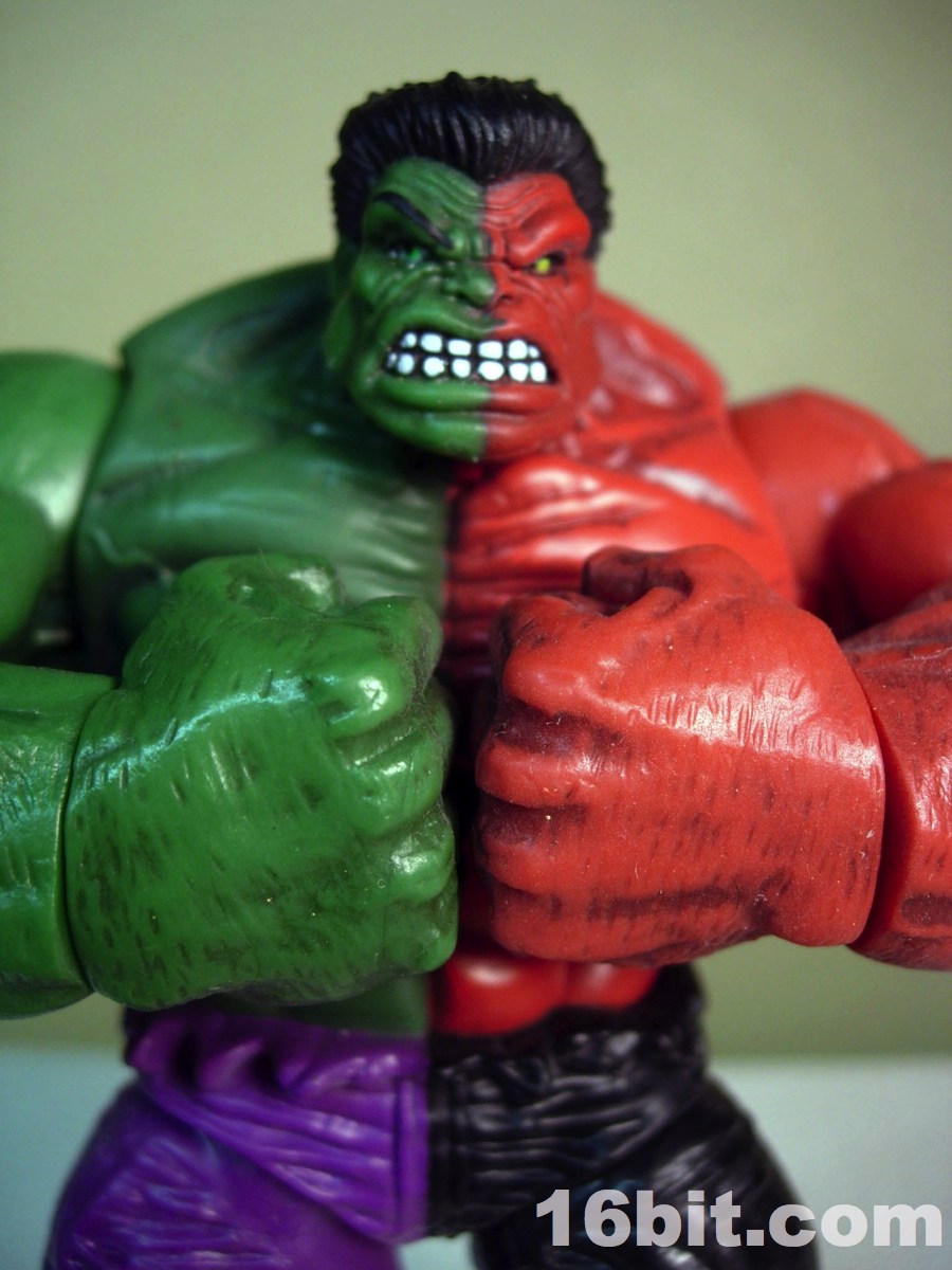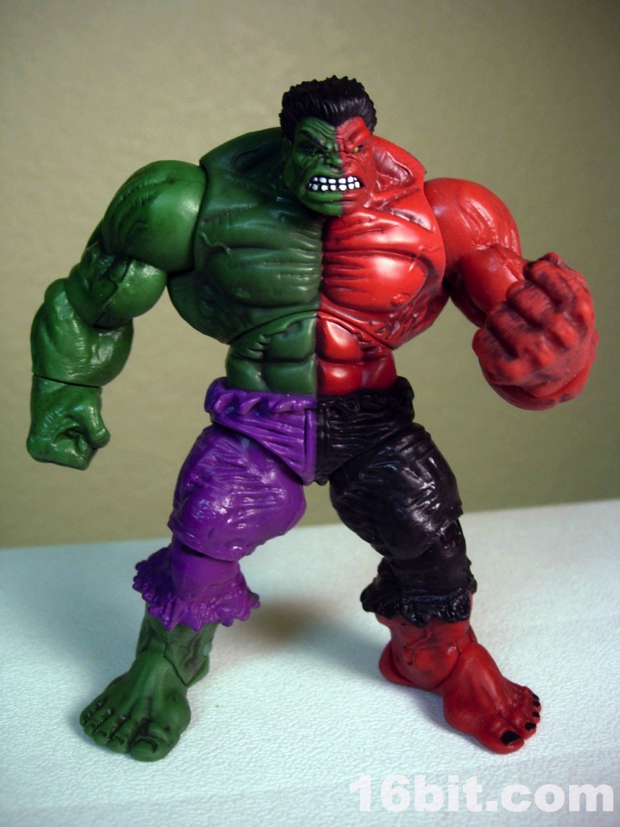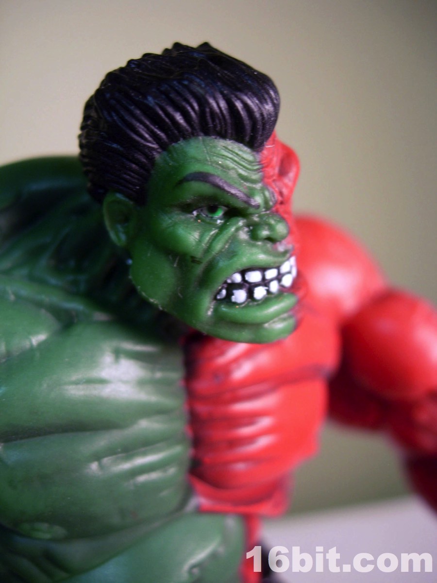 I can only imagine how excited Hasbro and Mattel get when Marvel or DC introduce new color costumes for their hit characters. The Compound Hulk takes this a step further, by fusing regular green Hulk and the meaner red Hulk, and combining them into a single figure-- never mind both versions were sold individually for a few years now, because you can get both at once. By using the Red Hulk version of the mold, this figure has a very angry face plus fists-- other Hulks have different expressions and in some cases, other hands.