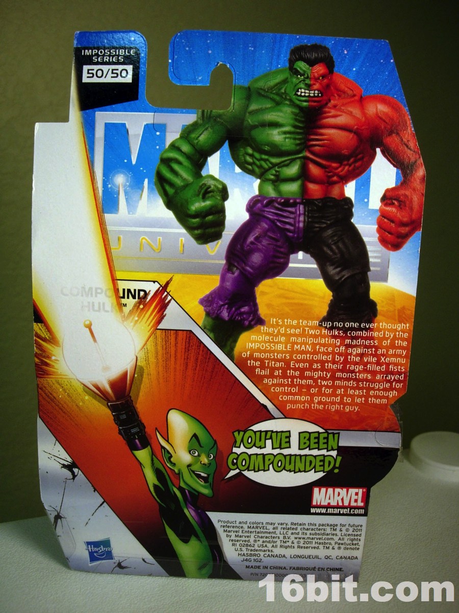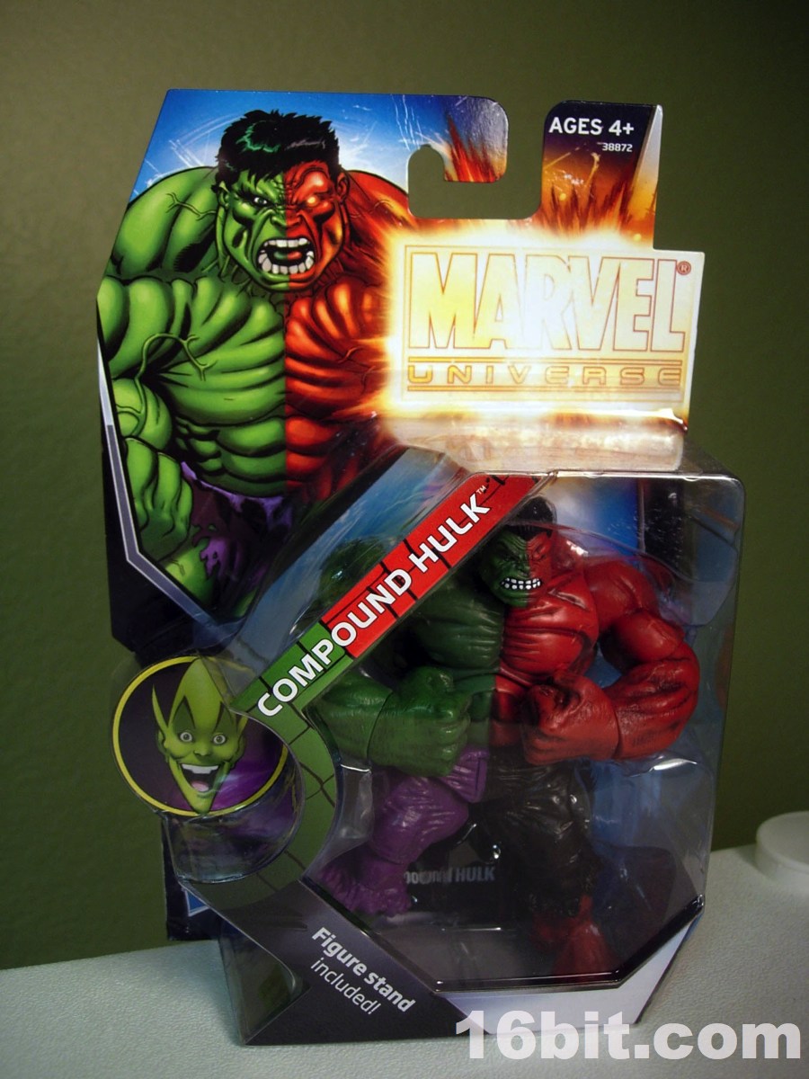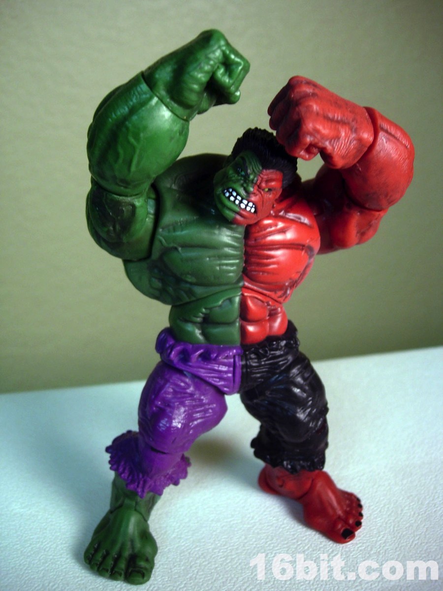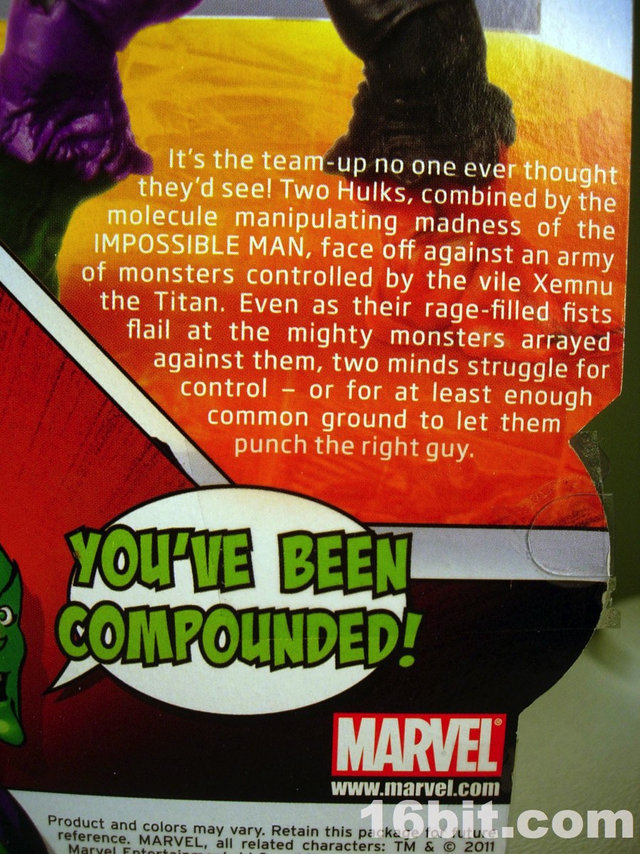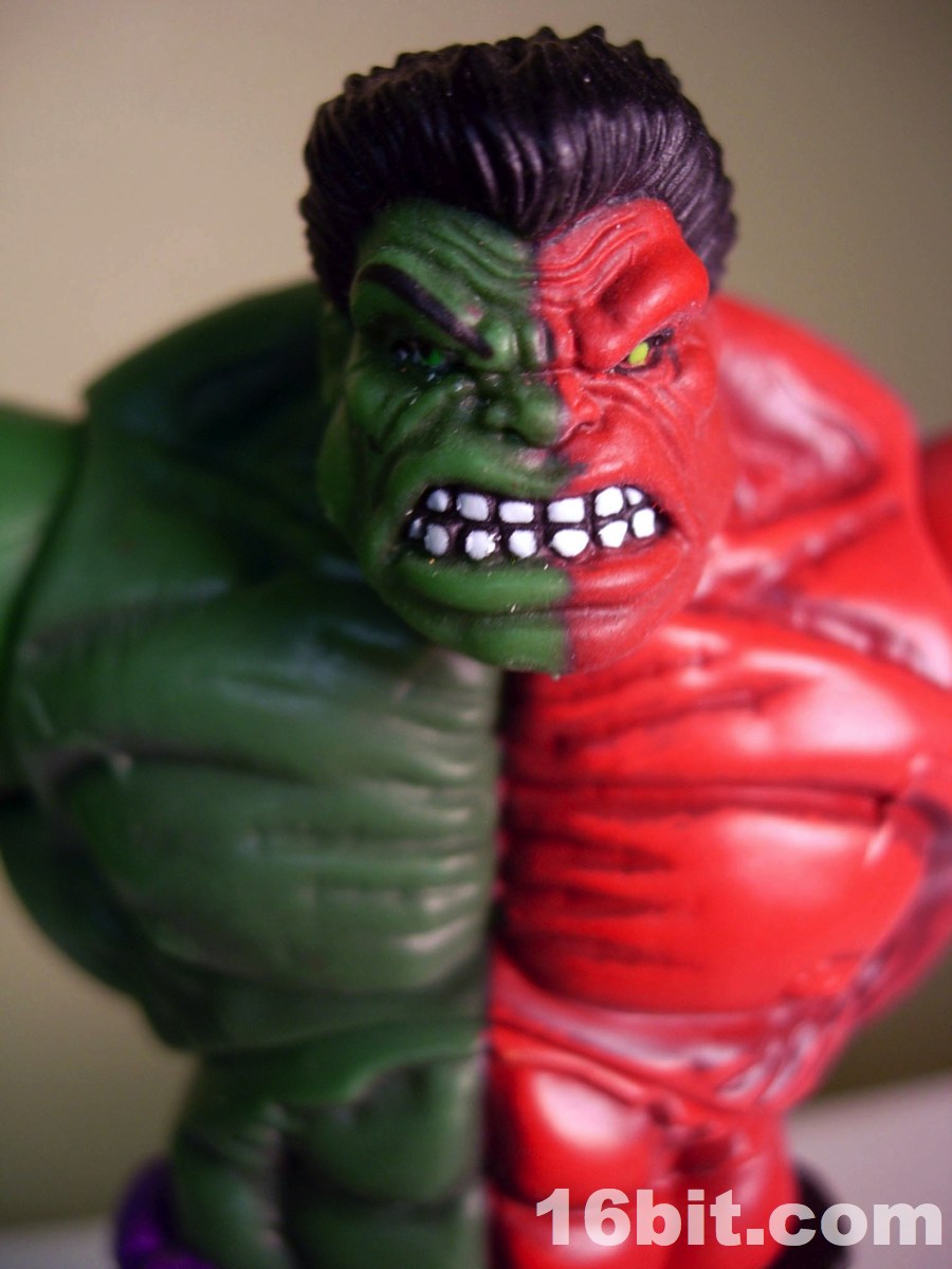 I can only imagine how excited Hasbro and Mattel get when Marvel or DC introduce new color costumes for their hit characters. The Compound Hulk takes this a step further, by fusing regular green Hulk and the meaner red Hulk, and combining them into a single figure-- never mind both versions were sold individually for a few years now, because you can get both at once. By using the Red Hulk version of the mold, this figure has a very angry face plus fists-- other Hulks have different expressions and in some cases, other hands.