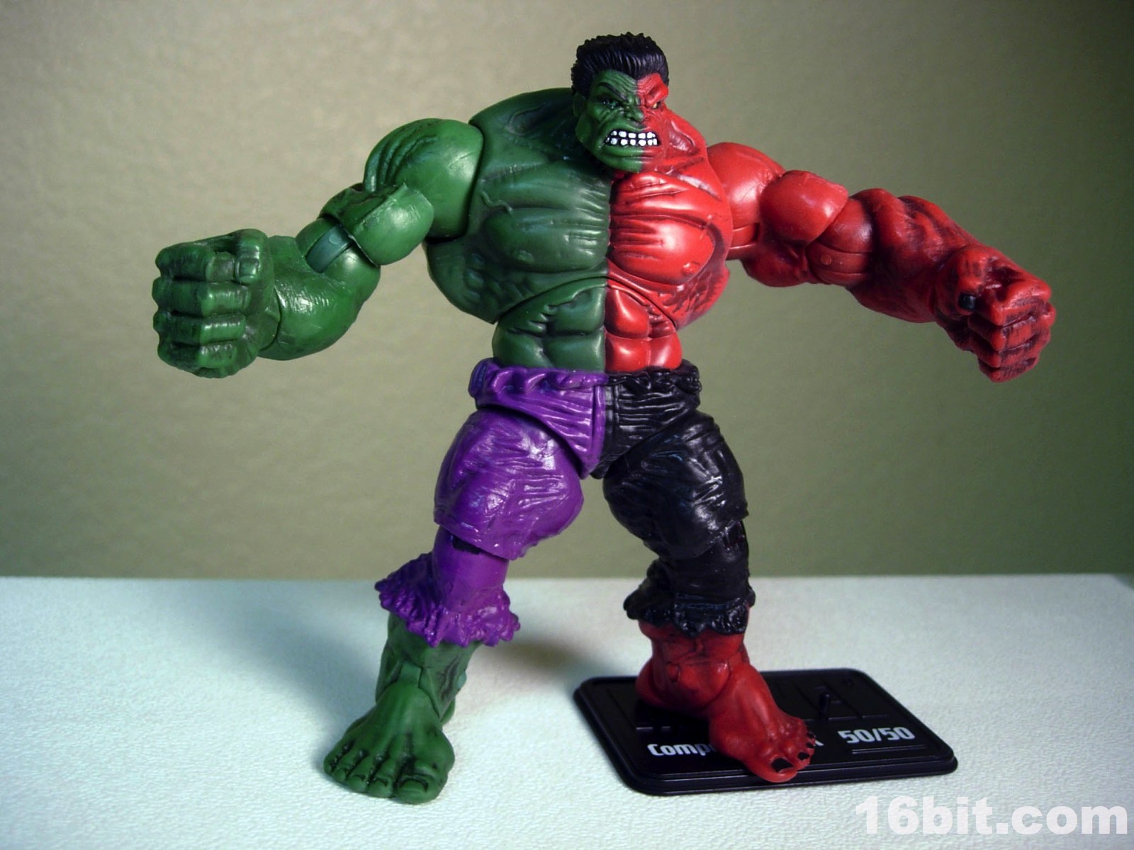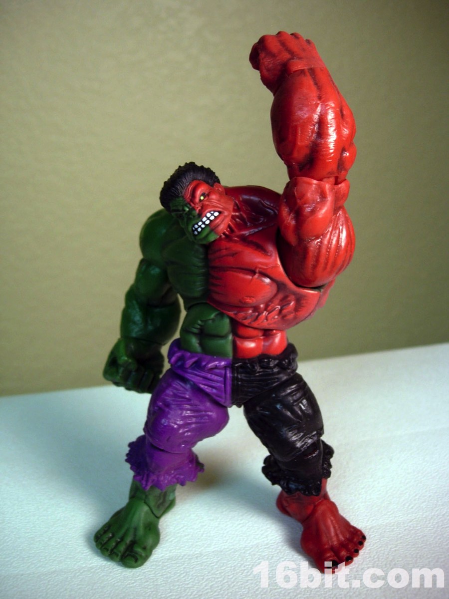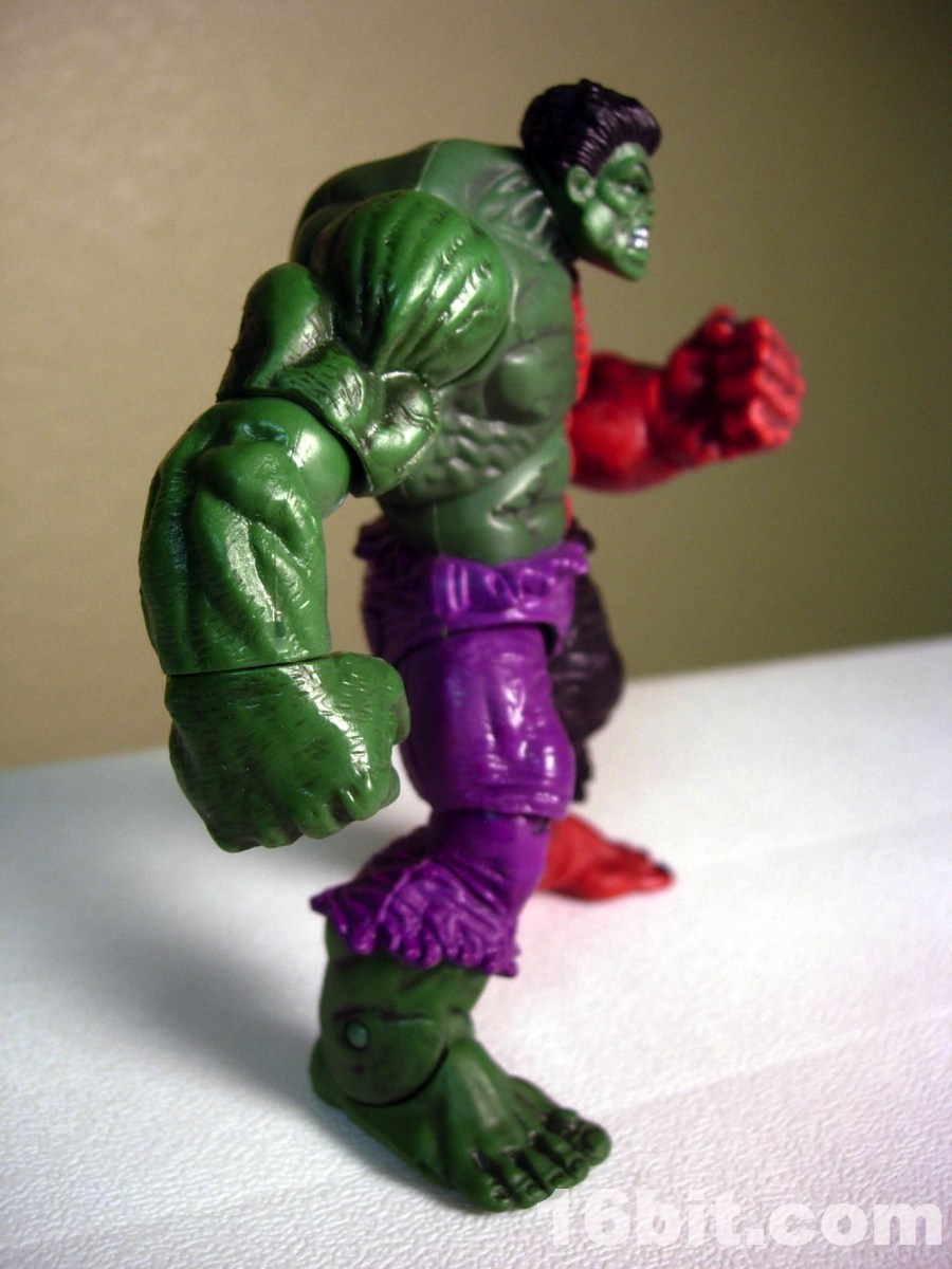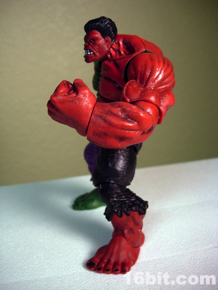 What's particularly interesting about this guy is how he was molded-- his left-hand side is molded (mostly) in red plastic, with the head and torso molded in green and painted over in red. The colors match quite nicely, although the painted red "pops" a bit more. The green half is, of course, molded green and looks green. The figure has the same giant feet and torn pants as the original mold, plus sports about 14 points of articulation. Most of the joints work well, but it's worth noting that on this figure, like the Iron Monger from the comic figure line, the hip joints don't allow the figure to sit. They merely rotate. The arms are quite posable and are fantastic for assuming any of a number of menacing poses, so you can get him into a brawl with your other toys and he's just going to look amazing.