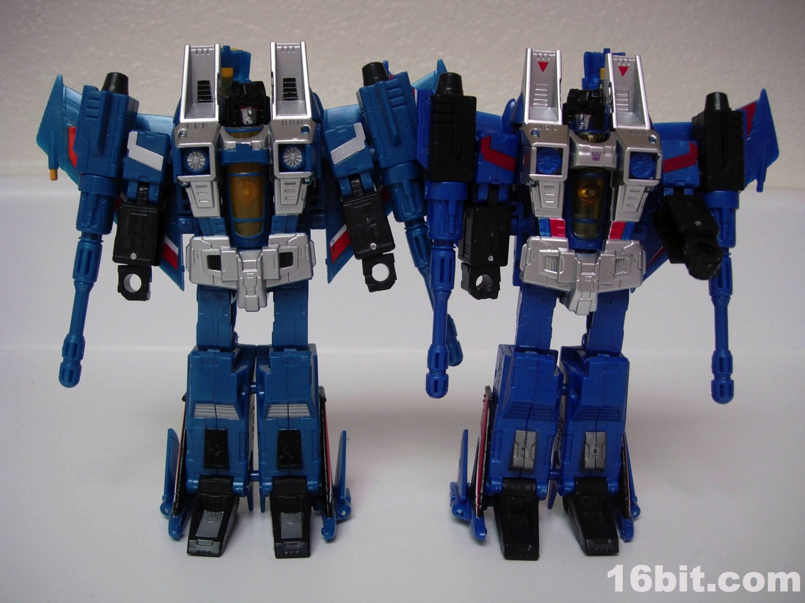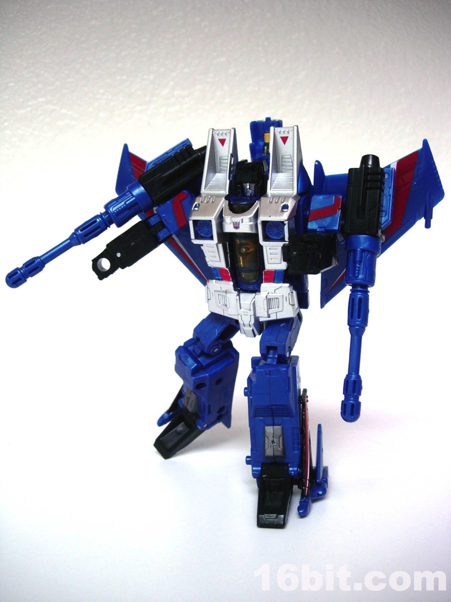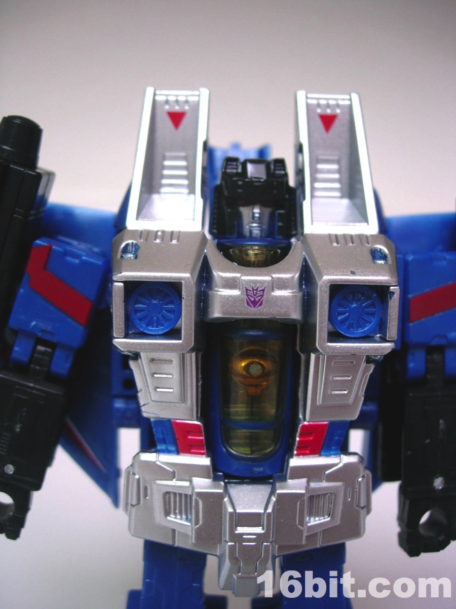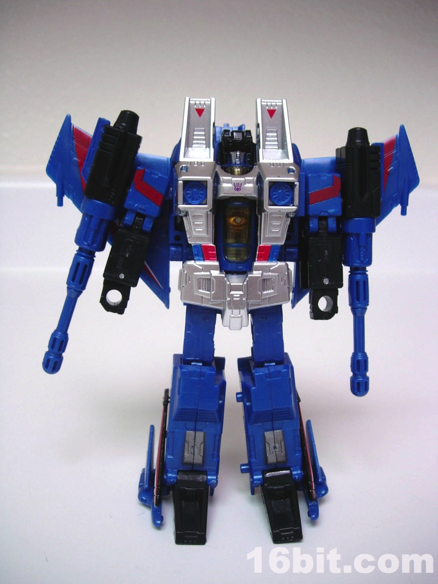 This was the first non-exclusive Thundercracker in this "classic" style, plus it managed to roll out at a time when Transformers fever was riding high due to a new movie. Interest in it quickly cooled, but it's still a fine toy and you should probably get it. I would say that the Botcon Thundercracker (pictured below) may be the best version as it's a pinch closer to the original toy from 1984. The 2011 Generations release seems to be more in line with other interpretations as he has Decepticon logos on his wings as well as just below his neck, which is a design trait introduced to the Seekers around 2010. (See also Dirge.) I don't care for it, but considering the difference between Botcon Thundercracker and Generations Thundercracker is at least $100 most of the time... I think I can let it slide.