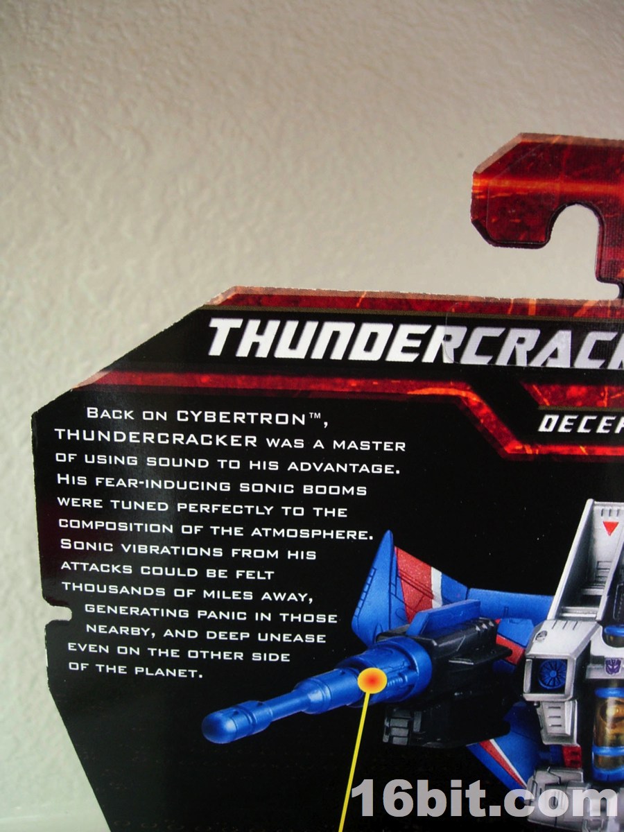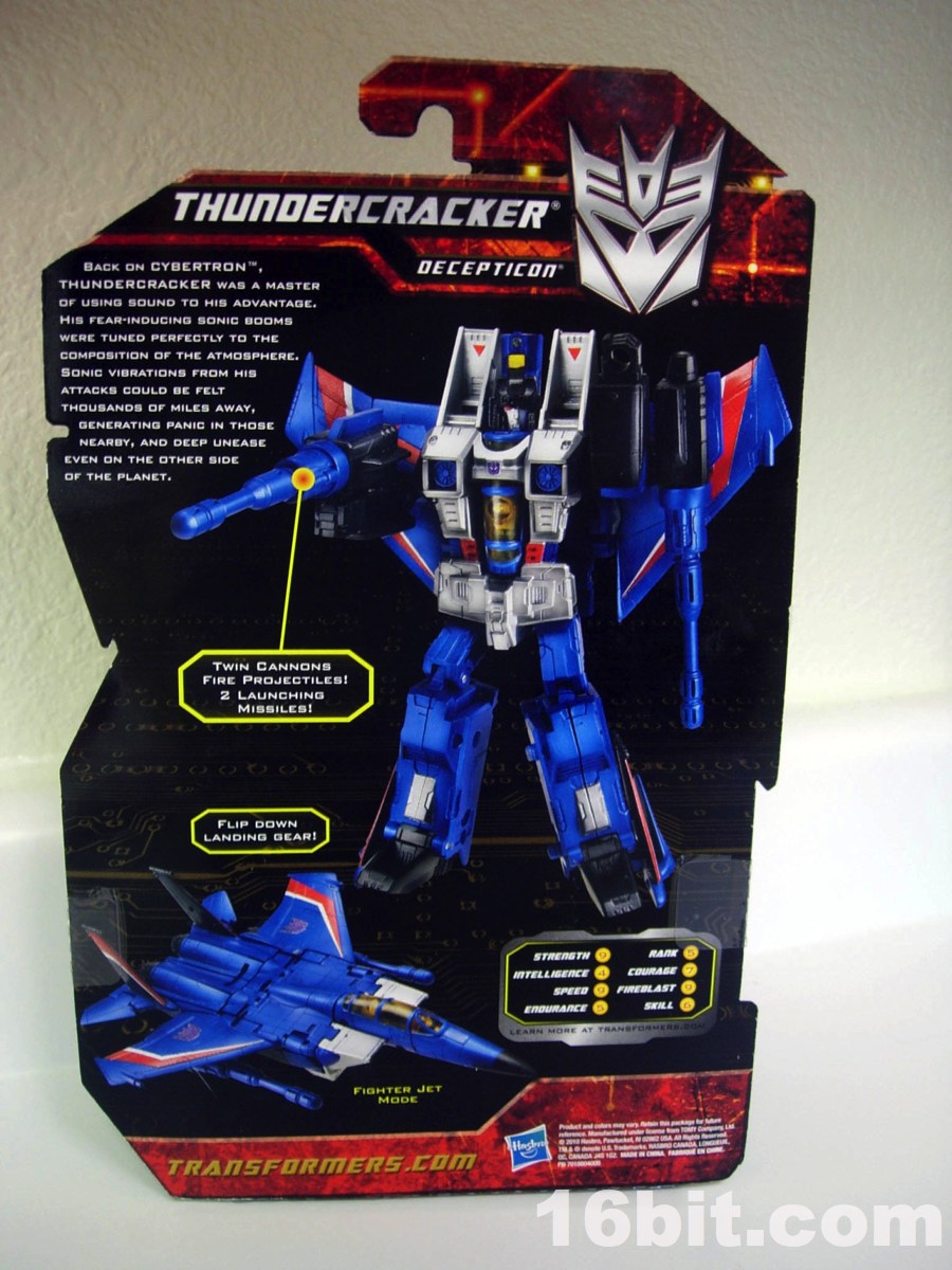 Item No.: Asst. 98452 No. 28594 Manufacturer:Hasbro Includes:Two cannons, two projectiles which fire Action Feature:Turns into plane Retail:$11.99 Availability: Spring 2011 Other: One of at least four Thundercrackers based on this mold