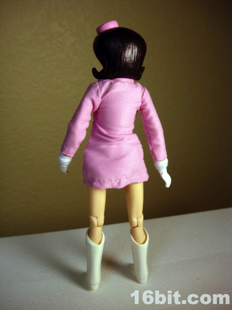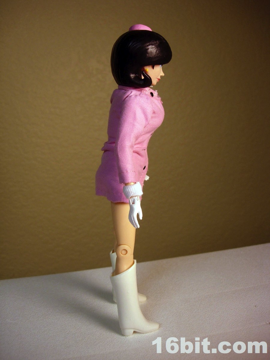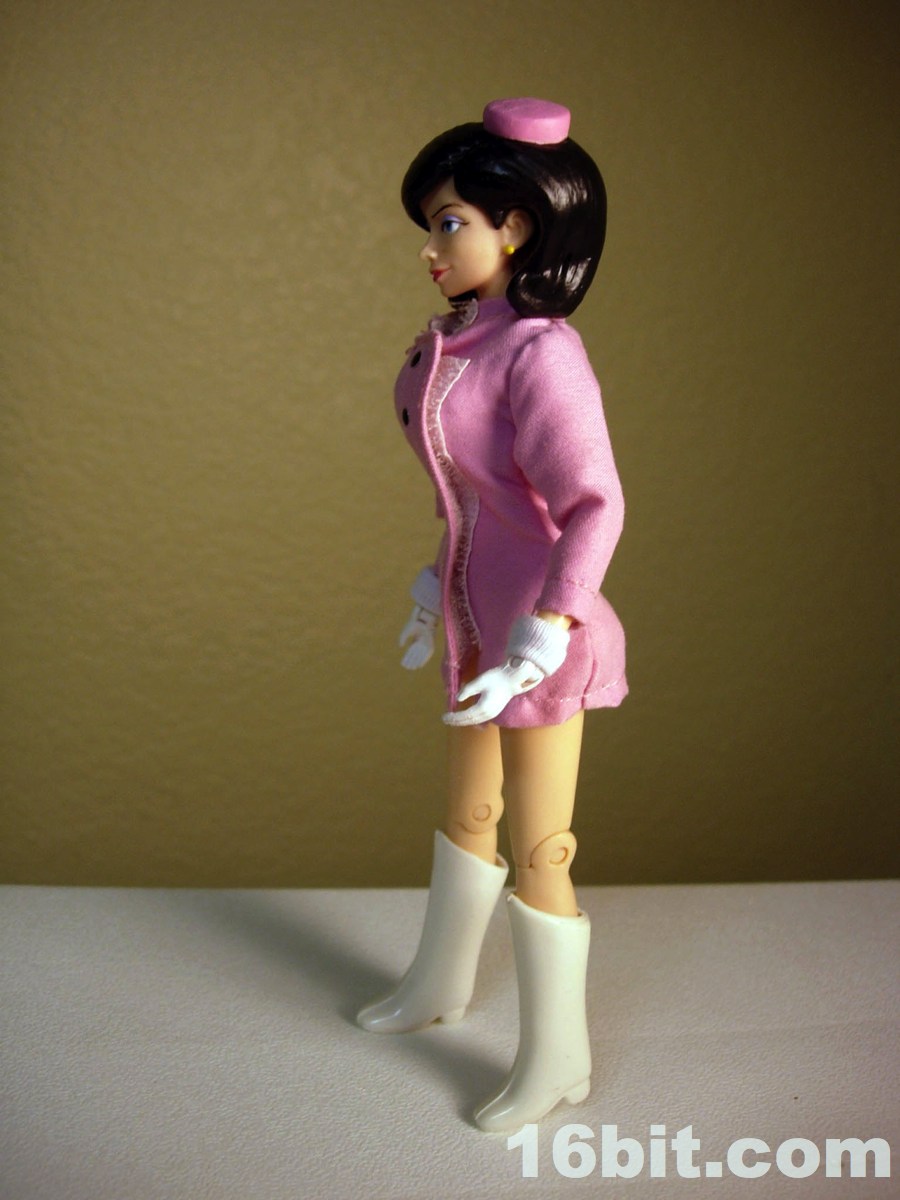 The plastic boots look and feel like vintage 1970s, while the outfit is quite new. The pillbox hat is molded to her head, which is the typical hollow plastic of these retro 8-inch figures. The gloves are painted hands, with a little trim (actually bracelets) to complete the look. The outfit itself uses velcro-- a little bulky-- to fasten itself around the figure, which actually had some surprised underneath.