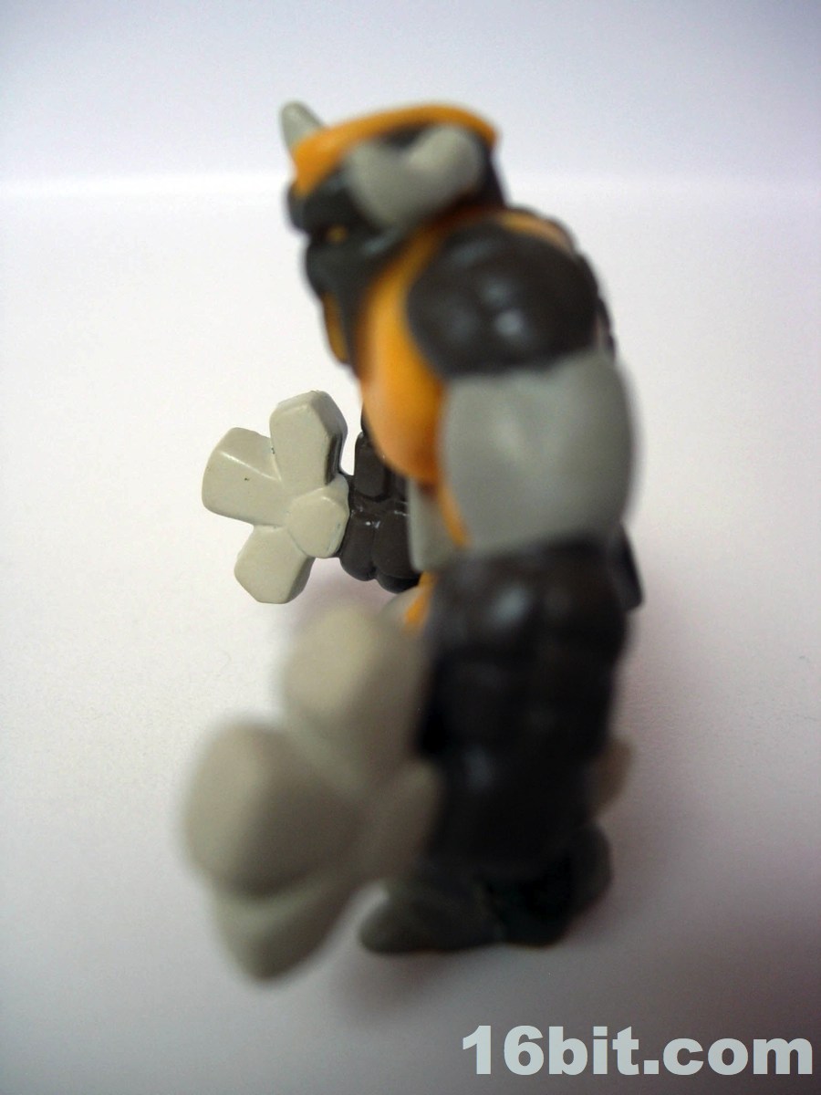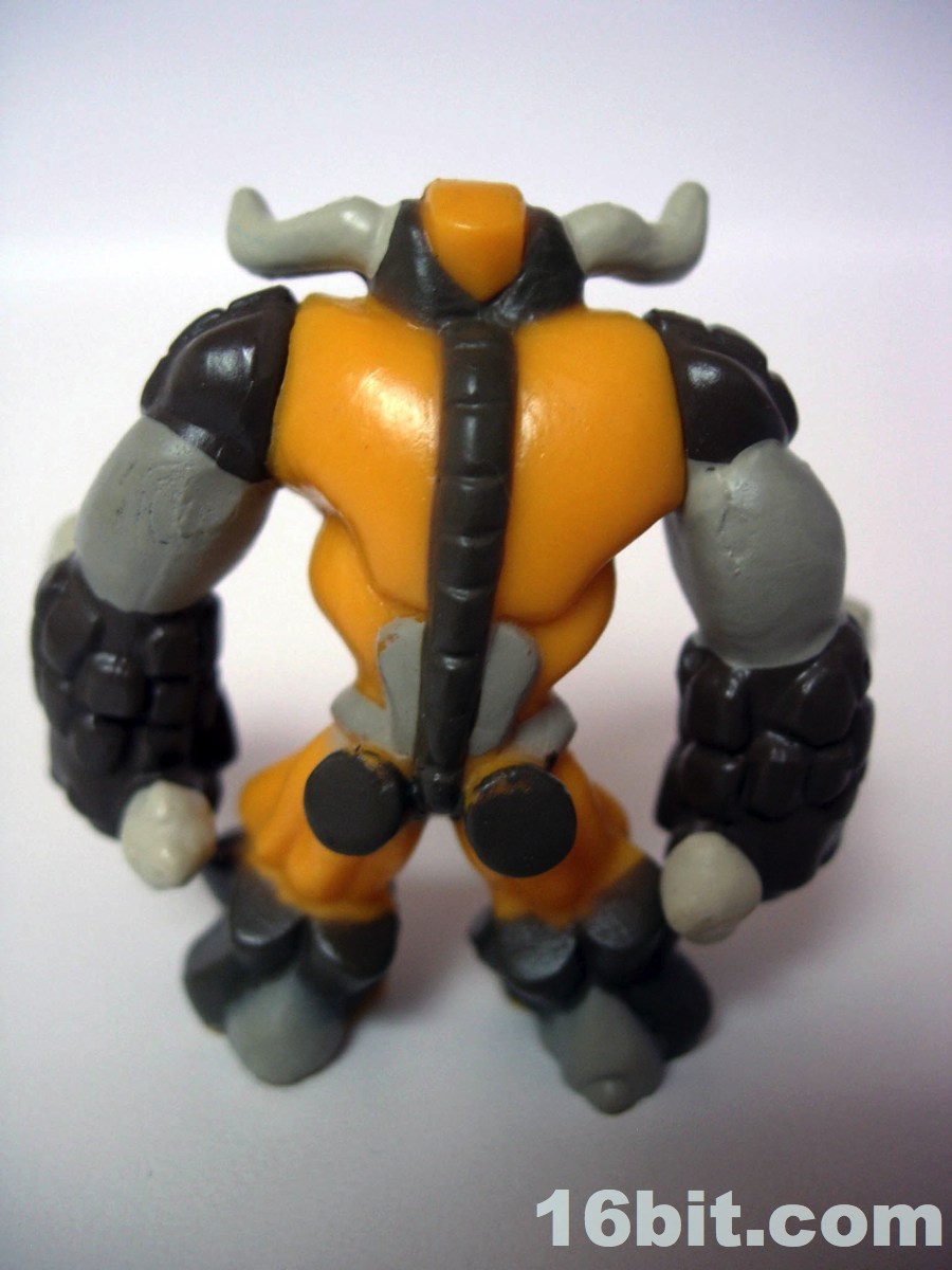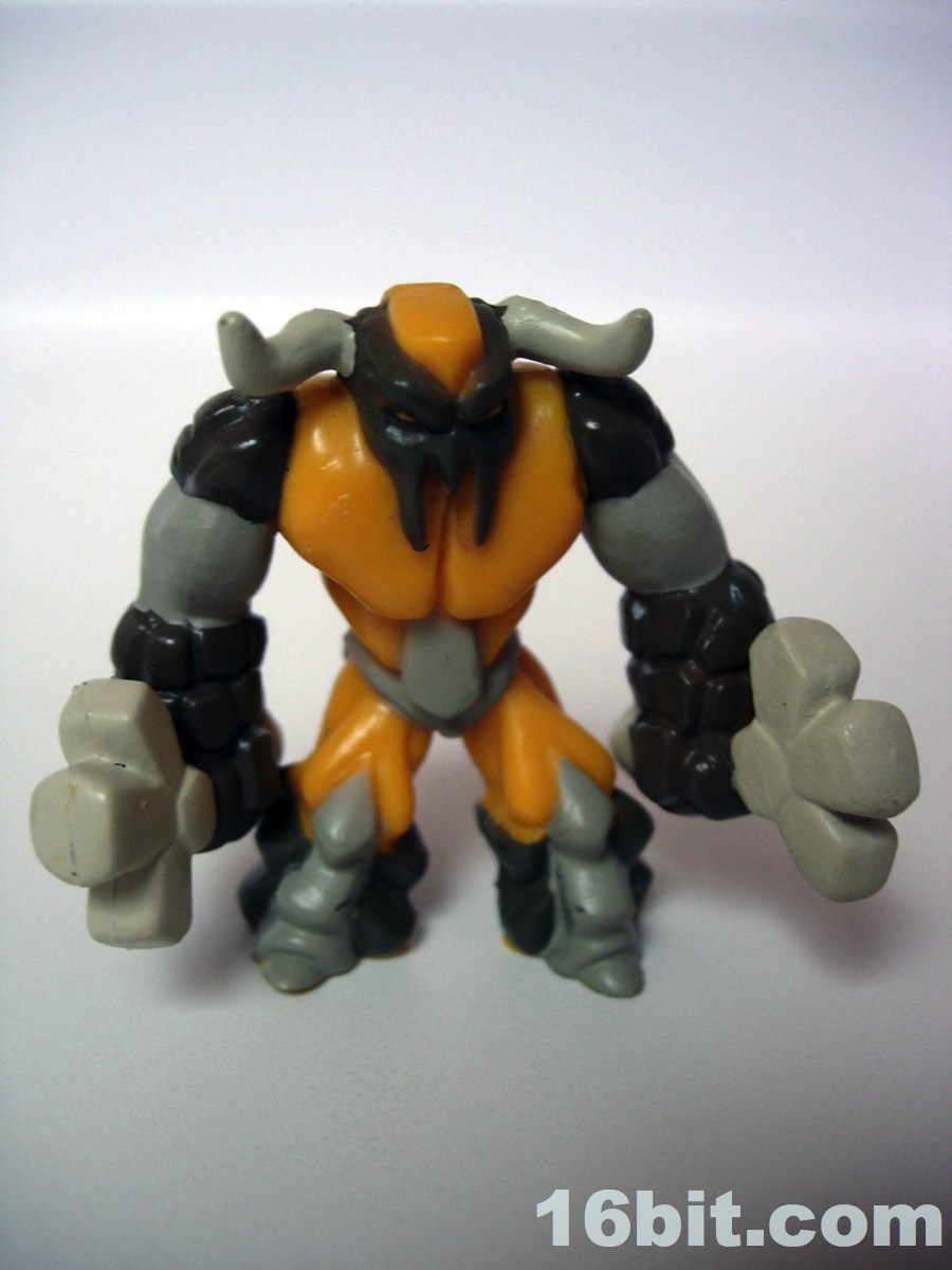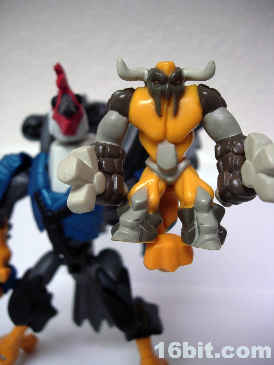 The rest of the set is populated by the Earth Tribe, rocky beings with brown and orange bits. Bullrock takes inspiration from a number of sources-- specifically bull and rock-- but he also has a hint of the Hanna-Barberra character Mighty Mightor. Bullrock carries twin rock weapons in his equally rocky fists, creating an interesting if confusing amalgamation of creature and weapon. So he's organic with rocky bits, and he carries rocks too? So his rock fists need rocks, because the rock fists aren't enough? I don't quite get it-- some of the tribes make a little more sense, but the Earth Tribe doesn't feel like it got the polish of some of the others. He has a lot of sculpted detail, bull horns, a creepy mask-like face, and not much else. I wouldn't go nuts for this one.
