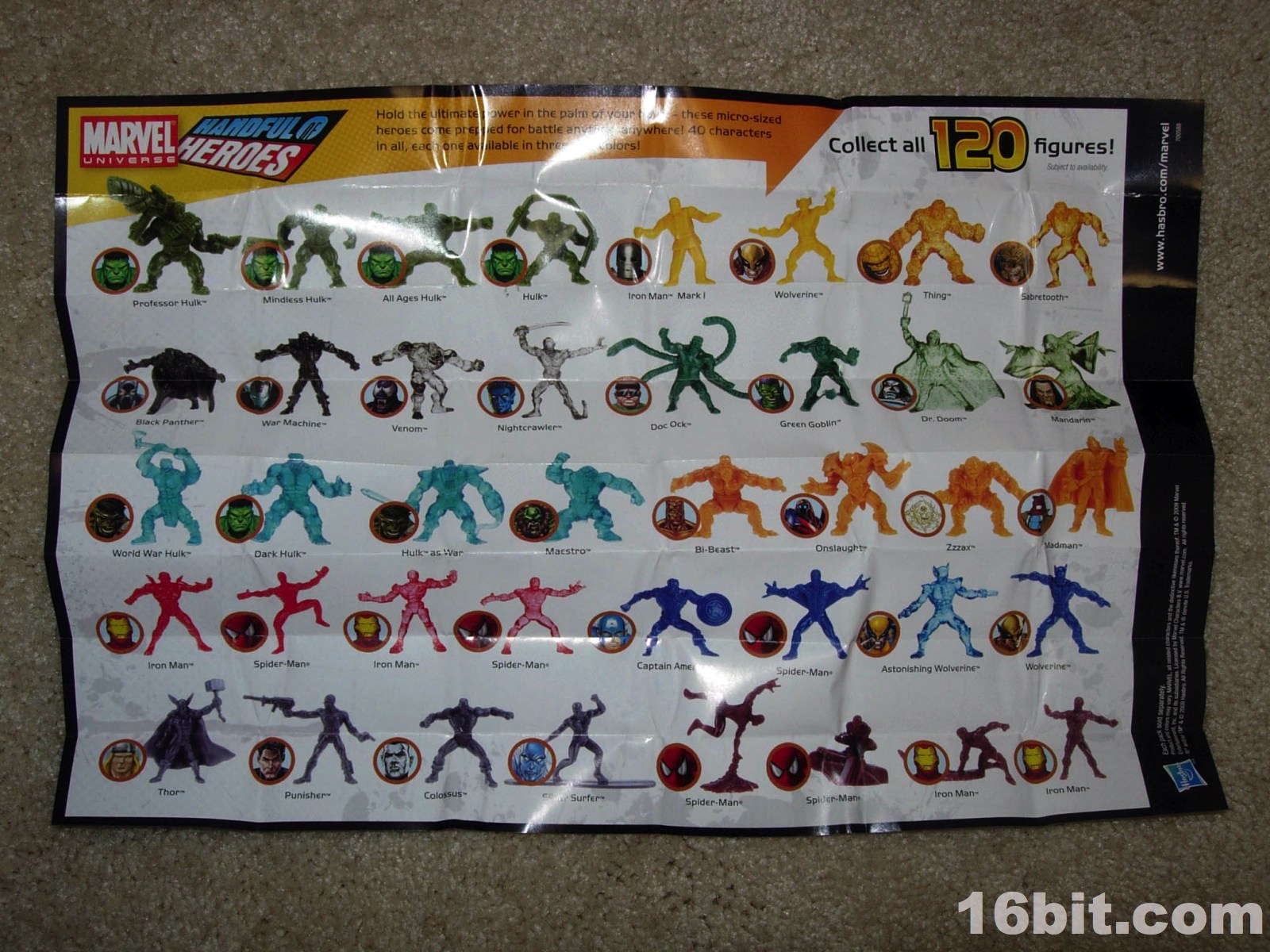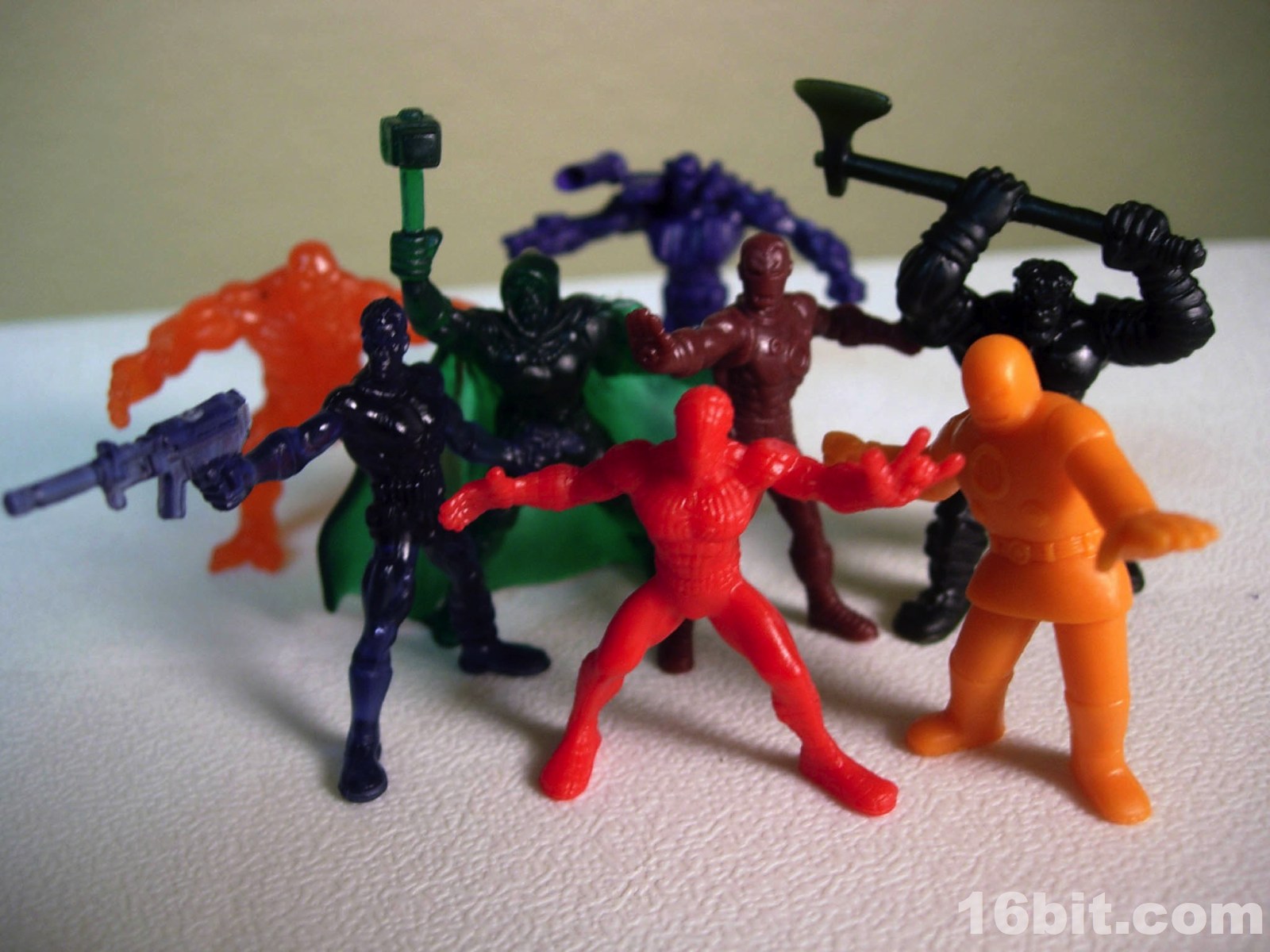 This packet included The Punisher, War Machine, Iron Man, Iron Man (MK I), Spider-Man, World War Hulk, Doctor Doom, and Bi-Beast which I've never heard of before. (I suppose before his mutation, he was merely Bi-Curious Beast. Thank you, I'll be here all week.) The poster for series 2 shows that of 40 figures, 8 are Hulks, 5 Iron Mans, 3 Wolverines, and 5 Spider-Man. So of the 40 figures, over 50% of the line are variations on 4 characters, which is a little unfortunate given that a line like this practically begs for weird characters. Having only bought one set and loving it, I'm not too keen on buying more because I got so many major characters in this set that I fear a second set would result in at least 50% duplicate characters. With 23 characters and Hasbro making sure you get Spider-Man or some major guy in every packet, they basically shot themselves in the foot for repeat purchases. Your average kid gets a Spider-Man, Iron Man, and Hulk in every box-- why buy a second packet? Sure they're awesome, but one purchase is actually quite satisfying.
