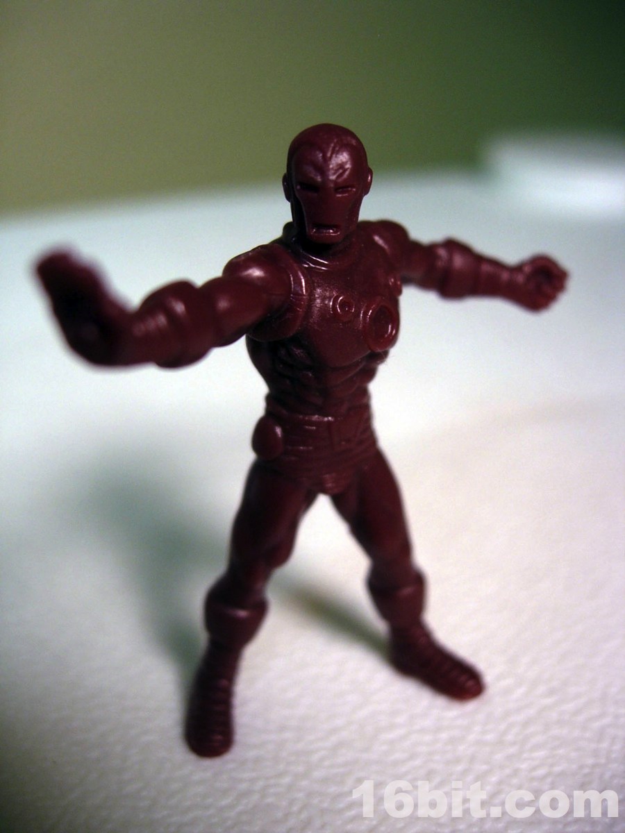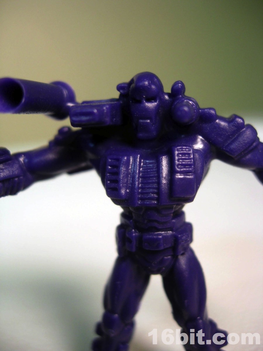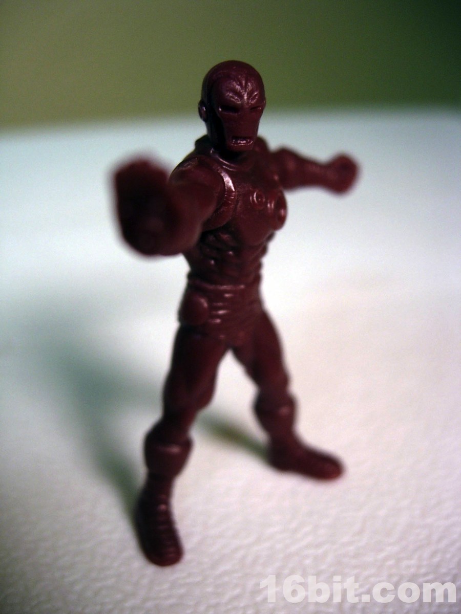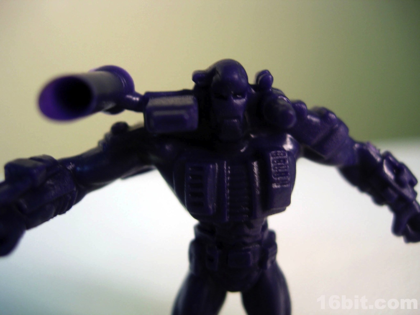 While not "hard plastic," the HOH figures are not as flexible as M.U.S.C.L.E. or their cousins. If anything, they feel like a significantly higher-quality incarnation of those little green military figures we've all seen. The sculpting is crisp, the molding is clean, and there's no real danger of ugly flash hanging off them yet. (Well, with the exception of my War Machine figure, as seen below, which I decided to keep on for now.) I fear that this kind of plastic means they could get damaged if not properly stored over time, but it does have an advantage-- their feet aren't huge and they have no display stands, but they can stand with virtually no problems. This may not sound like a big deal, but I was actually stunned all 8 could stand up perfectly well right out-of-the-box and that the detailing was really nice.