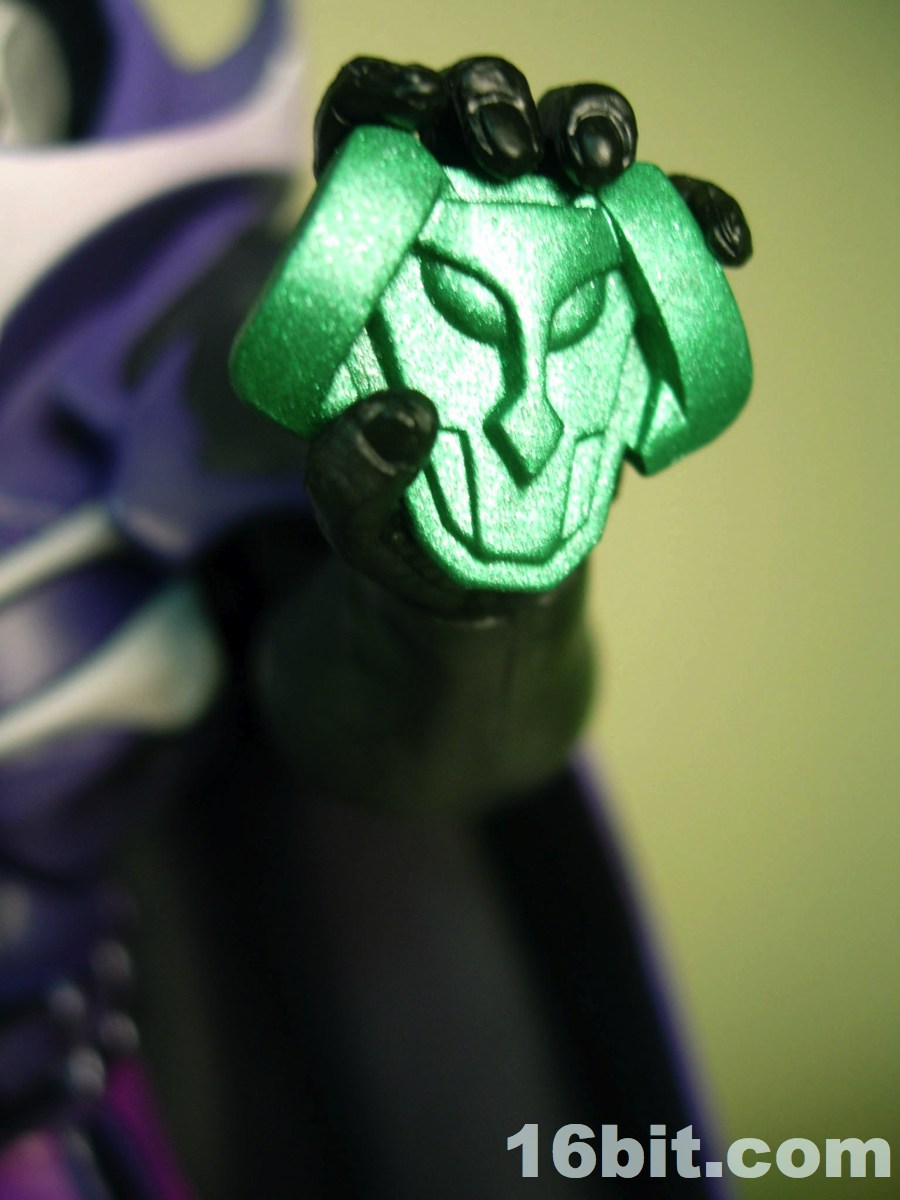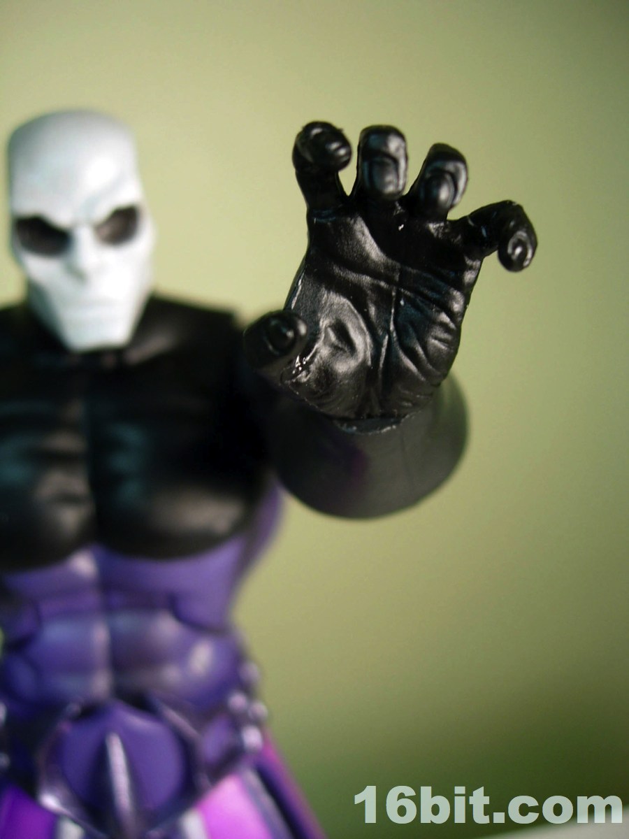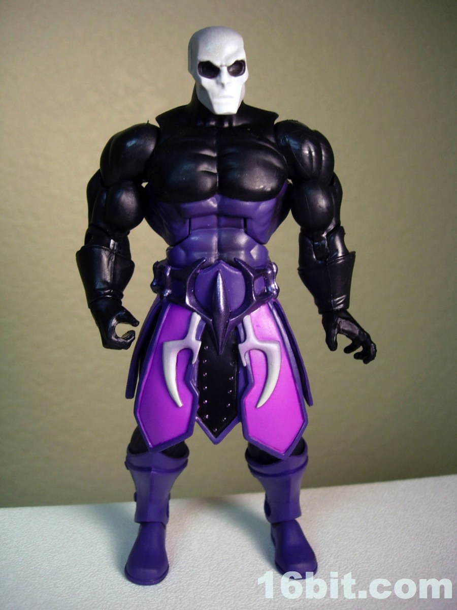 If you read the forums, the Masters of the Universe Classics line is the worst thing ever. I disagree-- even when the figures get weird like the Faceless One here, usually there's something to like. I do have a complainey observation, though, so let's get it out of the way. On the cartoons, he had a glowing, shadowy face-- which I assume is tough to translate to plastic. The actual head of the figure seems quite well defined, unlike other "faceless" toys like The Blank (Dick Tracy) or The Question (DC Universe). Action figures are, like comics or trading cards, another way to interpret characters so some changes are often made to make for a better, more interesting, or cheaper plaything. In the Faceless One's cases, I think it was just a stylistic decision-- because with lips, pronounced lines on his head, a nose, and dark eye sockets, he's not really all that faceless. The head is really cool and a little ghoulish, which I have no problem with, but to make it match the packaging art would probably require some forced painted shadow deco-- which, actually, Hasbro has used and it does look neat when done right.