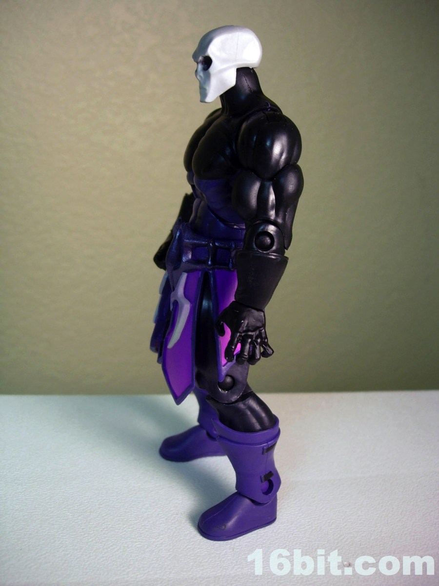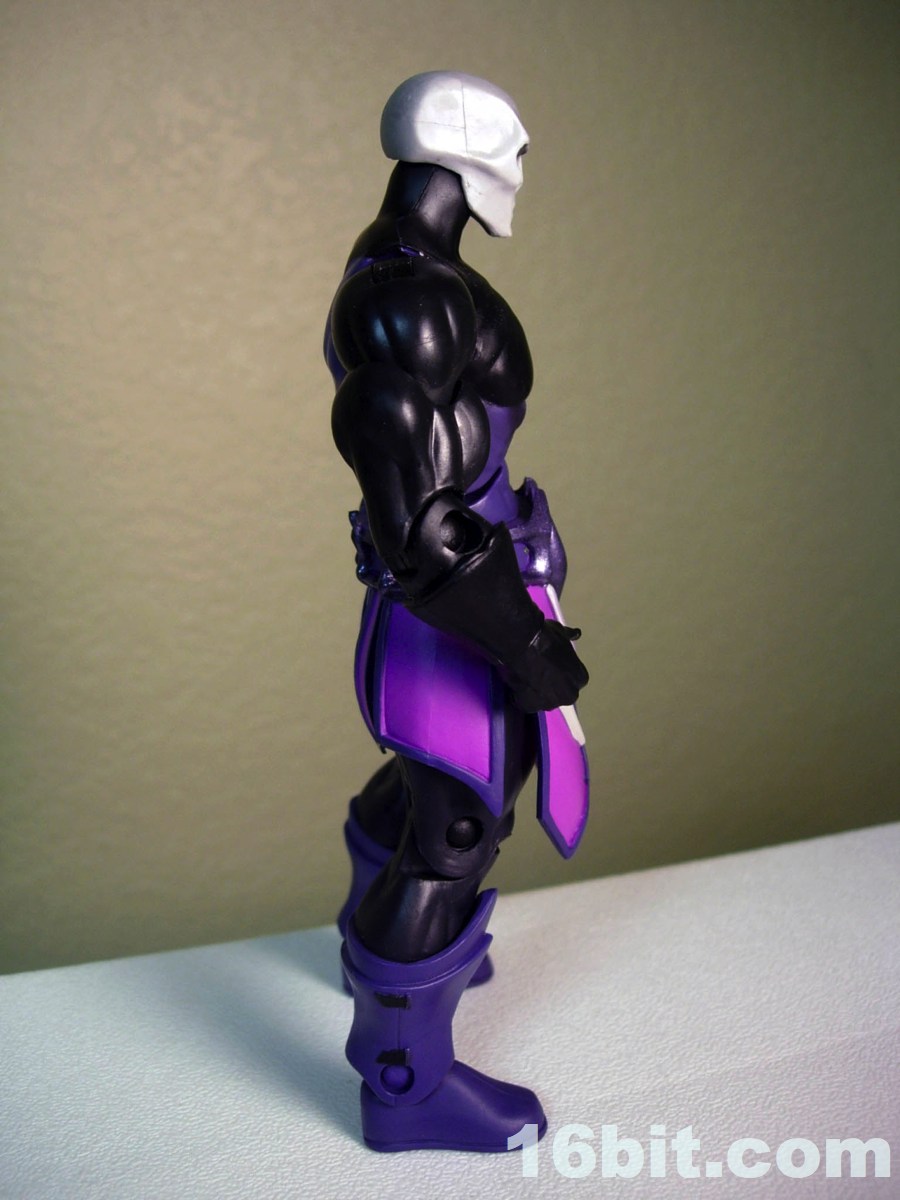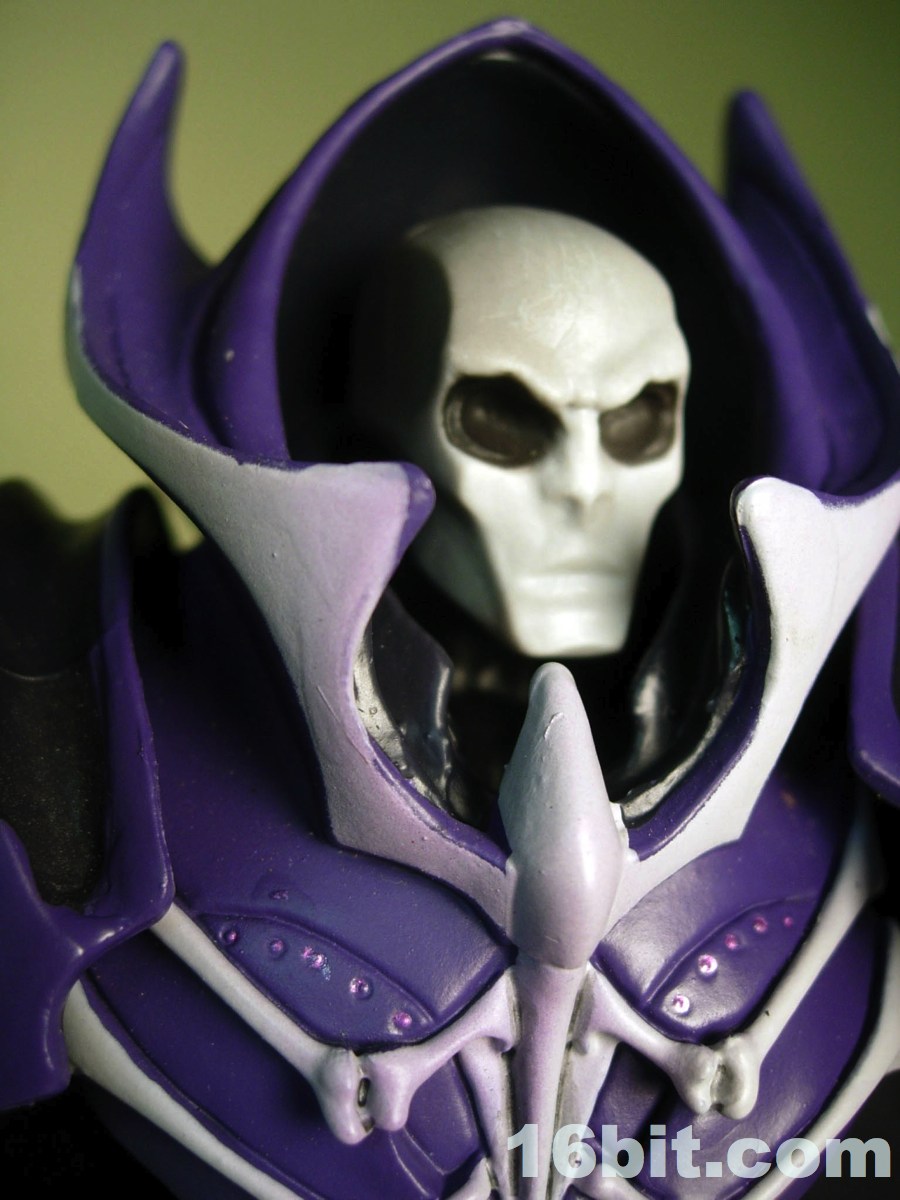 If you read the forums, the Masters of the Universe Classics line is the worst thing ever. I disagree-- even when the figures get weird like the Faceless One here, usually there's something to like. I do have a complainey observation, though, so let's get it out of the way. On the cartoons, he had a glowing, shadowy face-- which I assume is tough to translate to plastic. The actual head of the figure seems quite well defined, unlike other "faceless" toys like The Blank (Dick Tracy) or The Question (DC Universe). Action figures are, like comics or trading cards, another way to interpret characters so some changes are often made to make for a better, more interesting, or cheaper plaything. In the Faceless One's cases, I think it was just a stylistic decision-- because with lips, pronounced lines on his head, a nose, and dark eye sockets, he's not really all that faceless. The head is really cool and a little ghoulish, which I have no problem with, but to make it match the packaging art would probably require some forced painted shadow deco-- which, actually, Hasbro has used and it does look neat when done right.