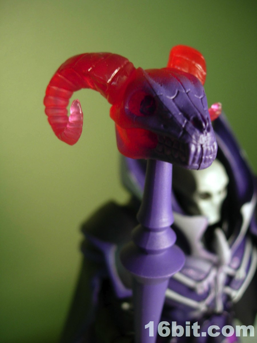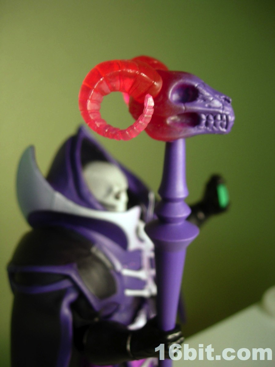 So the sculpt is good, and the gear is acceptable. One accessory is the Skeletor staff with the head cast in clear red and painted purple. If you display it with the light just right, it gives the accessory an otherworldly magic quality which really is nice to see. His other losable item is a ram amulet, or Ramulet. The Ramulet is metallic green and fits nicely into his hand. Like, perfectly. I couldn't ask for an accessory which fits better into a hand than this-- the staff requires low levels of force, but this just plain fits nicely. Oh, and I should note that despite the hands being sculpted like gloves, you can see fingernails and wrinkles on his digits if you look close... so don't look too close.