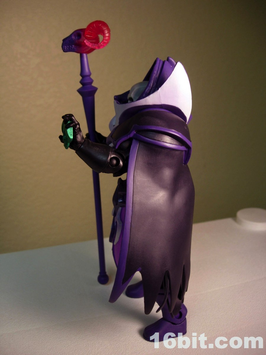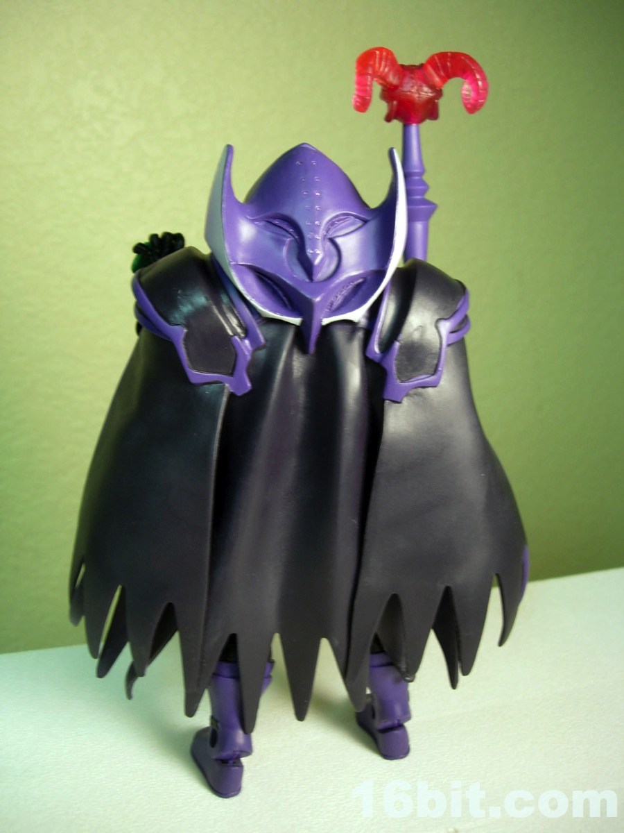 Compared to the art, it's pretty close-- the costume has most of the major elements, but the colors are tweaked and the "skirt" is different. Rather than have his robes reach the floor, they cut off at about the knees. Articulation is standard MOTUC fare, 19 joints (or more, depending on how you count) give him a decent range of movement-- but some of those are going to be restricted by the big bulky plastic costume. If you remove his cape, he can bend his legs a fair amount so it's entirely possible he could be placed in a vehicle someday.