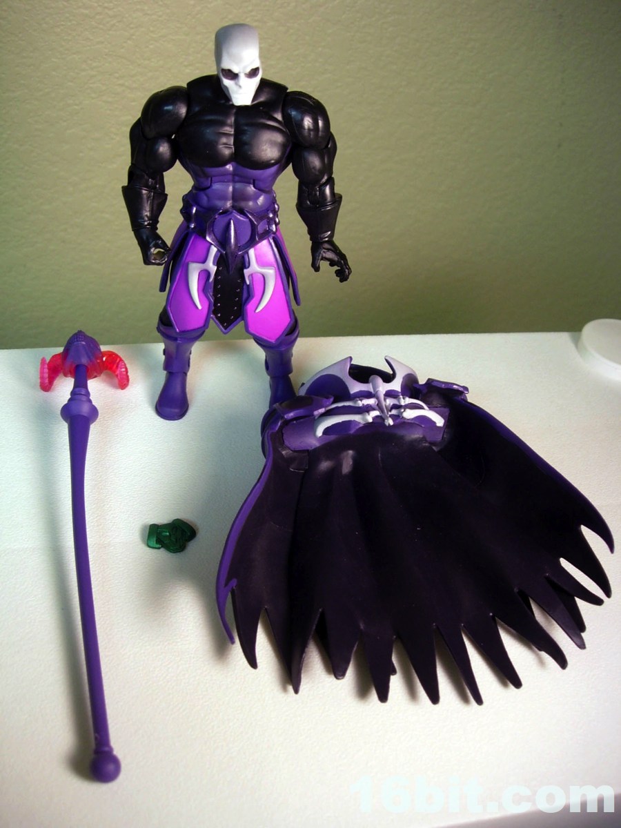 As Evil-Lyn's dad and a potential baddie who was underused, this figure's greatest success is existing. A limited number of new characters from the 2002 show got made as toys, so it's nice to see one, even if he isn't a perfect translation of the animation model-- he's a neat, evil looking figure and I think that's ultimately what counts. The original guys feel a little more ramshackle, so this figure's elegant lines and additional coloring almost seems out-of-place compared to the almost-naked classic combatants... but I still like it. He'll go on the shelf, in the back, but his presence is such that even on the back shelf, you can't miss this guy and his creepy empty black eye sockets.
