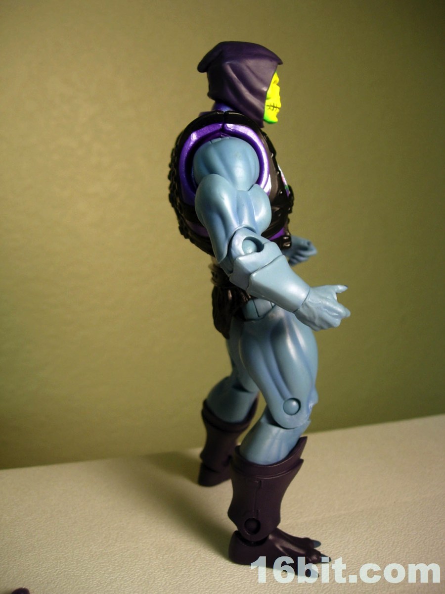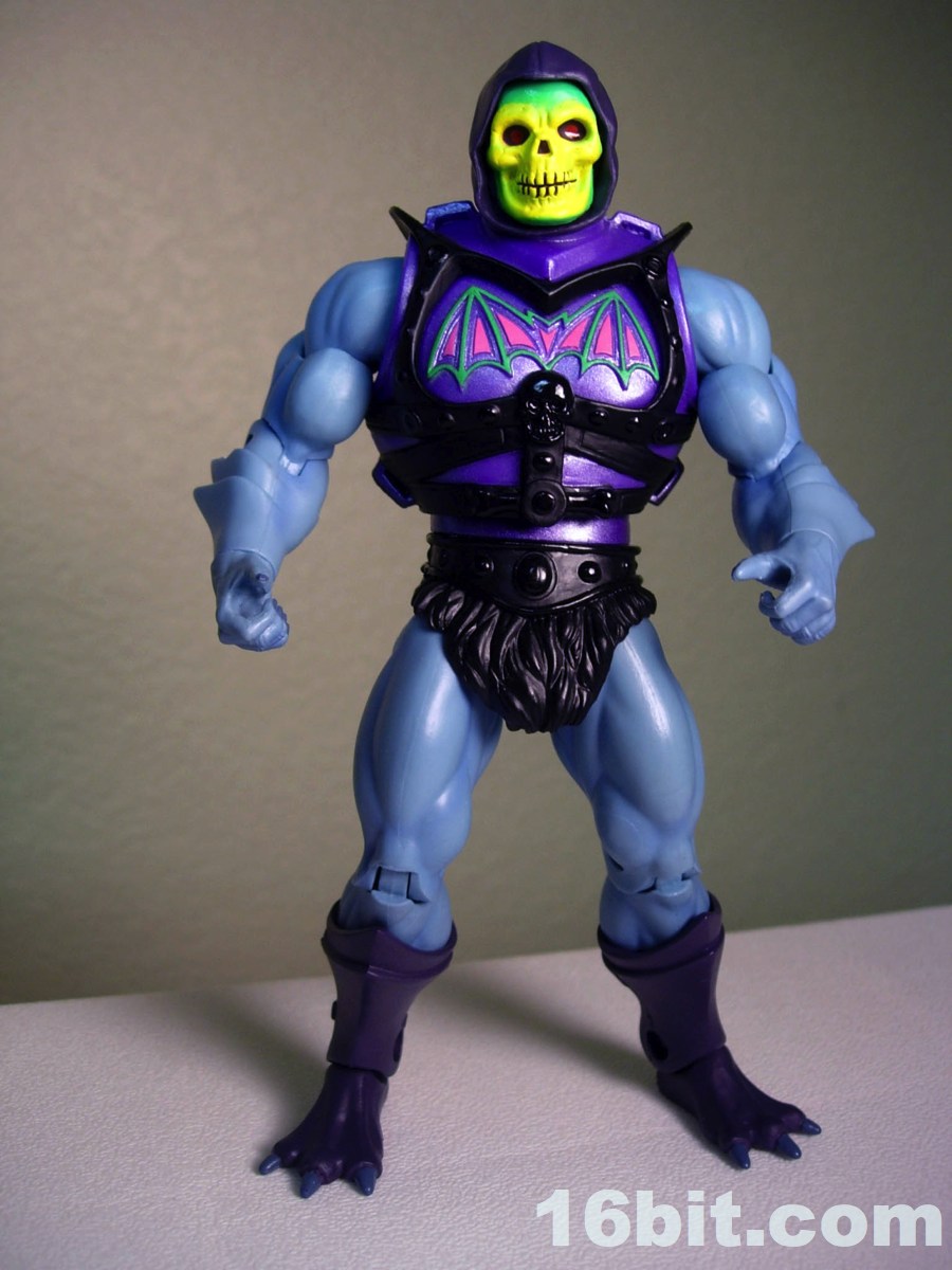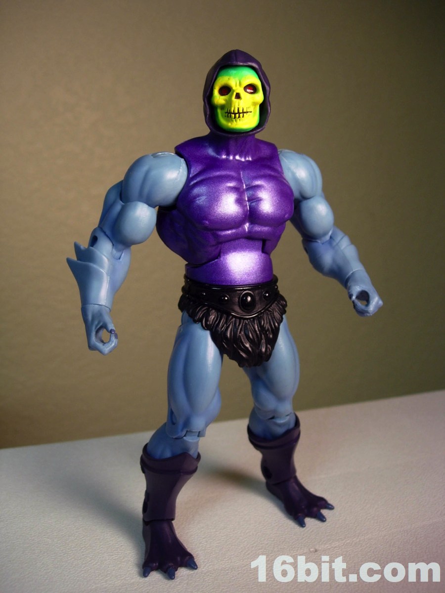 The figure is made up of mostly recycled bits and pieces, as he should be. The head is similar to the regular figure, complete with red eyes, green plastic skin, and a ghostly yellow paint applied to his face. His limbs are a pale blue with subtle highlights, while his torso is, oddly, purple. He has He-Man's furry briefs (just like the original toy), and typical Skeletor feet and hands. I should note, they painted his fingernails and claws, giving him an extra few cents worth of awesome. I like this one lots.