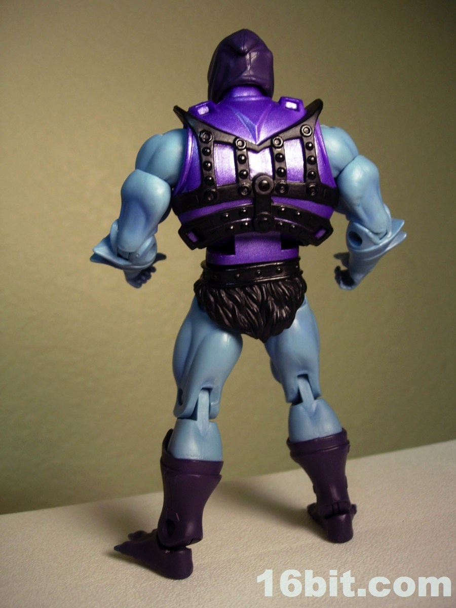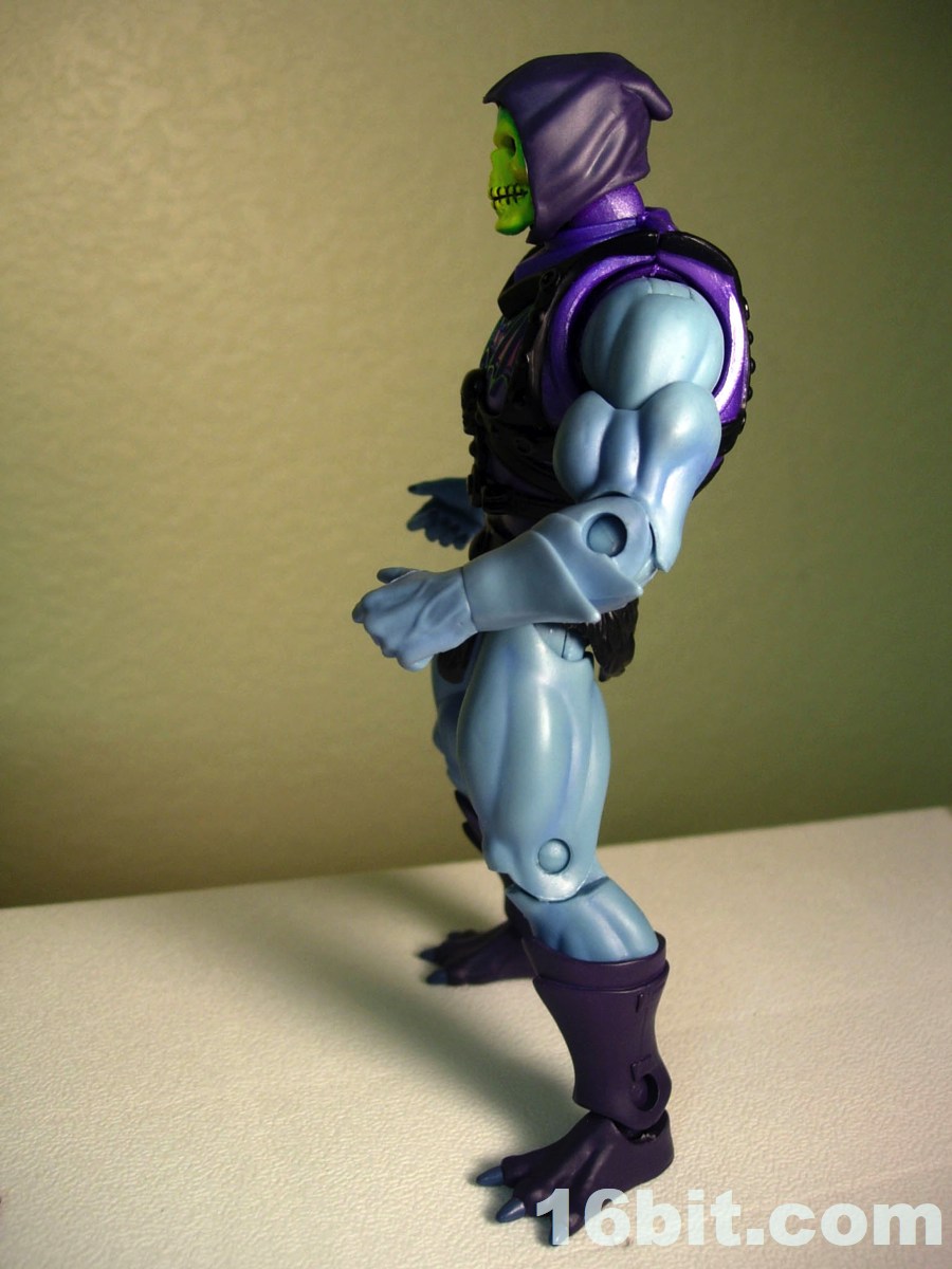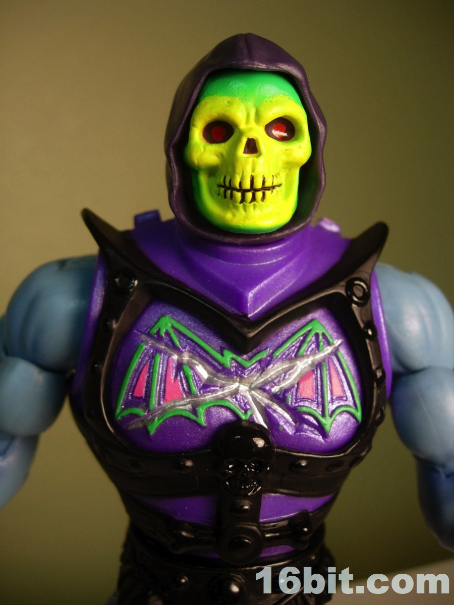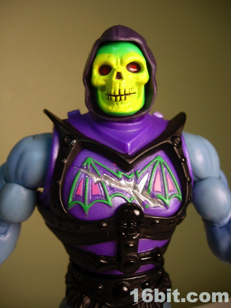 The figure is made up of mostly recycled bits and pieces, as he should be. The head is similar to the regular figure, complete with red eyes, green plastic skin, and a ghostly yellow paint applied to his face. His limbs are a pale blue with subtle highlights, while his torso is, oddly, purple. He has He-Man's furry briefs (just like the original toy), and typical Skeletor feet and hands. I should note, they painted his fingernails and claws, giving him an extra few cents worth of awesome. I like this one lots.