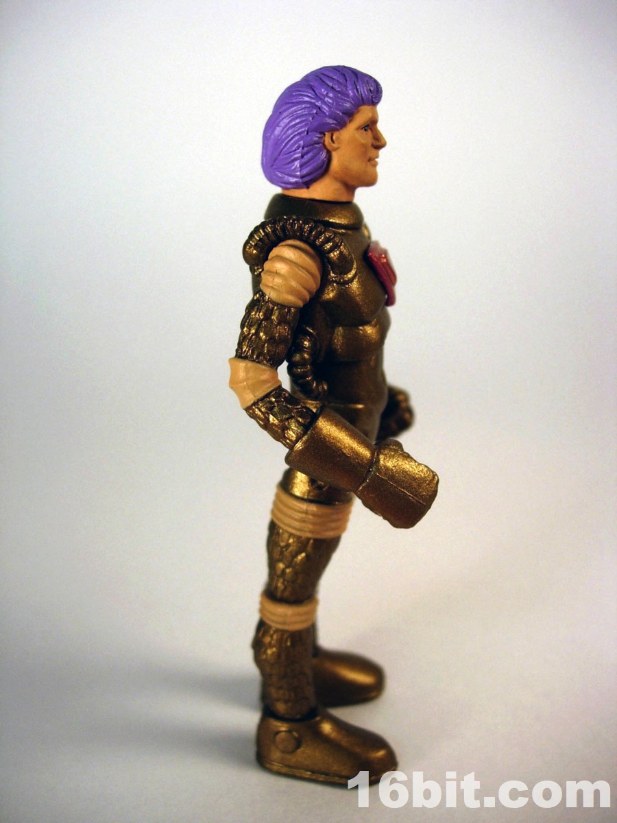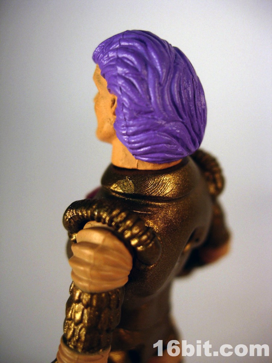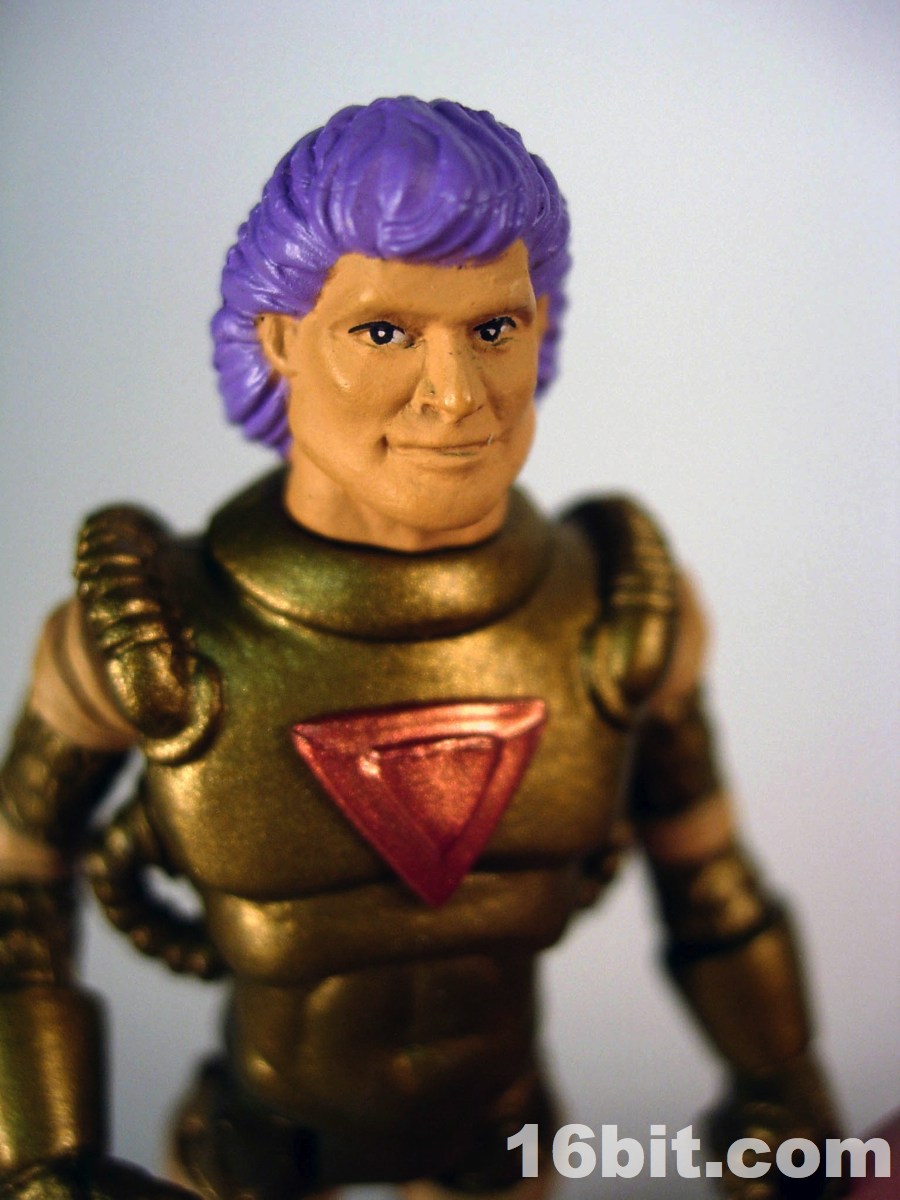 Surprise, thy name is Commander Comet. After three sets of clear prepaints and a round of price increases, combined with a delay of just over a month after the promised short pre-order ship date (originally scheduled for late December 2011, it didn't ship until the end of January 2012), it seemed like we were going to be in for a rough batch of figures. I'm happy to say that despite the longer-than-expected wait and $10-per-set increase, the figure is still worth owning. The figure looks wonderful in person, and while it doesn't hold up to the insane scrutiny of my camera's macro setting, it's gorgeous in person to the human eye in normal lighting. The eyes are damn near perfect, with just the right positioning of the iris that he doesn't look nutty or stoned. He just looks like an awesome action hero, which I would've assumed might be difficult from the purple-haired gold-suited Man from Venus.
