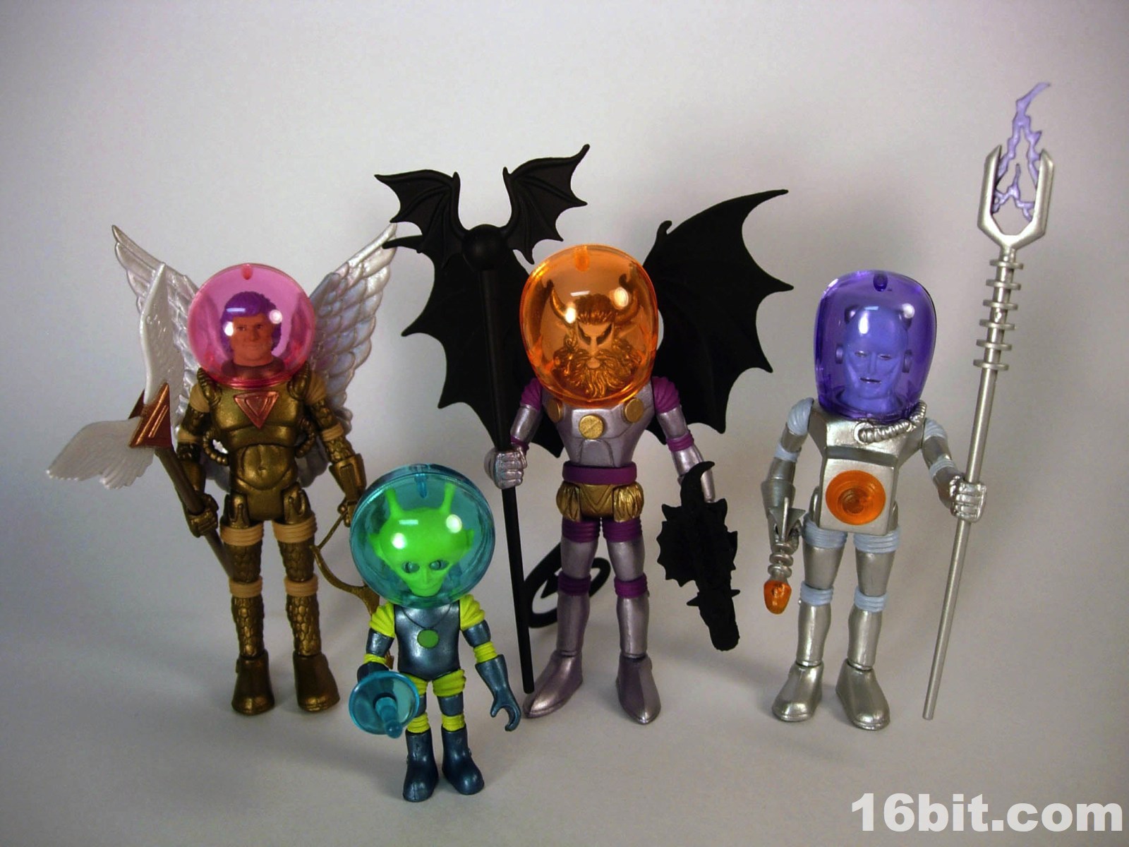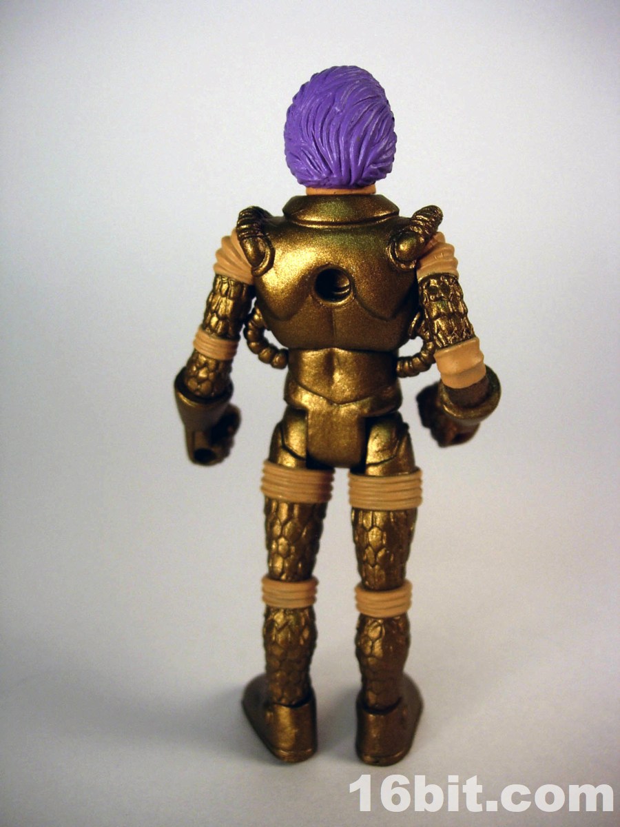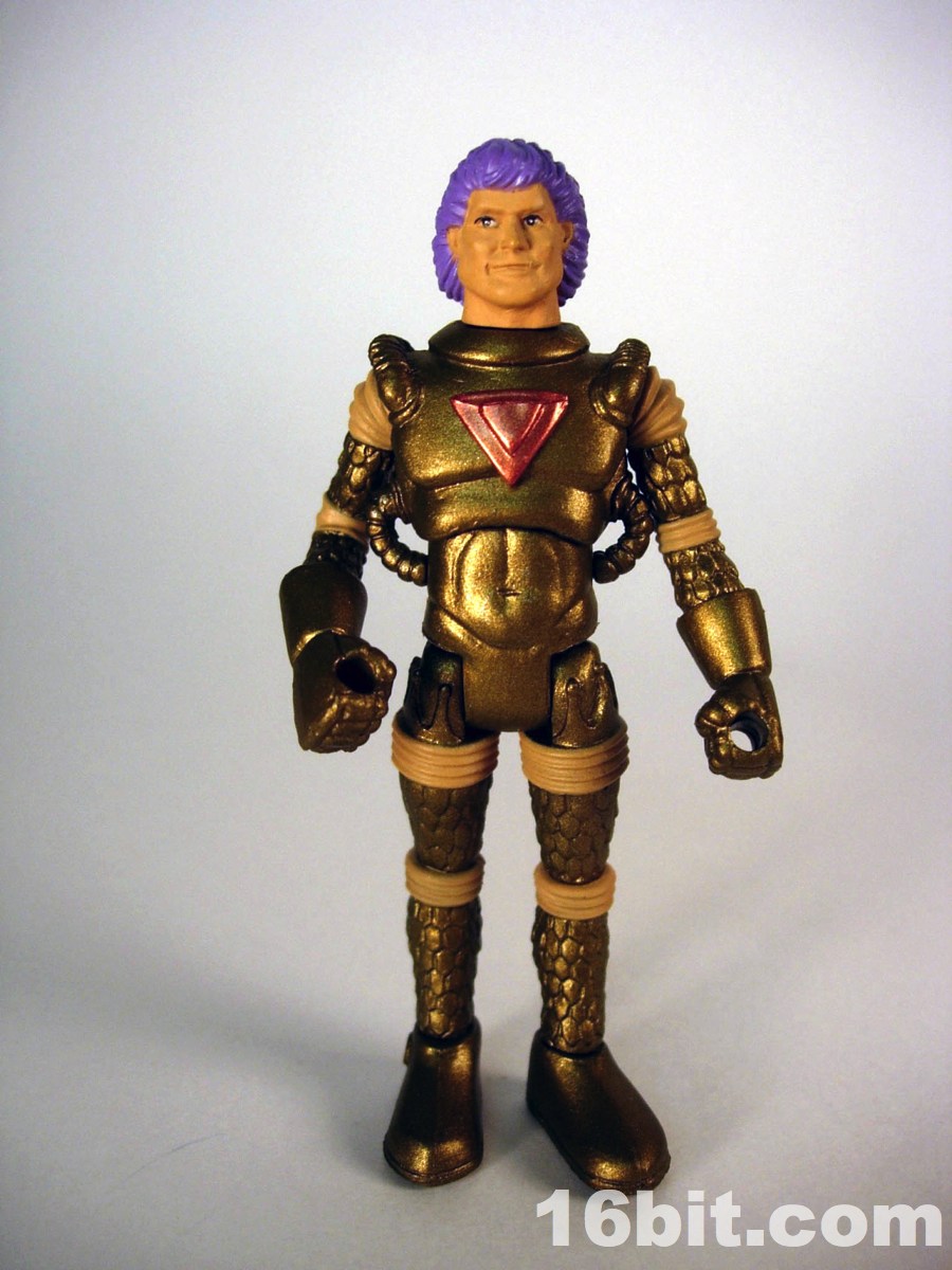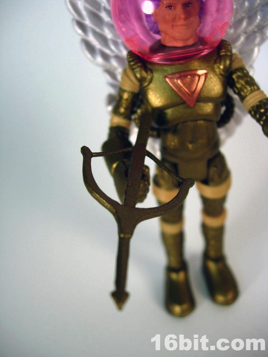 Painted similarly to the original 1968 bendable toy figure, Commander Comet is painted gold with a yellowish brown color on what were once accordion-style joints. The head is a typical white person's flesh tone with atypical purple hair. The figure is rounded out by pearlescent white wings on both his back and his staff, which features a bronze triangle and a gold handle. This is new to the action figure release-- the original 1968 toy only included the crossbow, so you get a little more bang for your buck here. Unlike many of the other Outer Space Men figures, Comet has a quasi-feathery sculpted space suit which is significantly different in texture from the other figures in the line. You can also make out his belly button, for some reason. The pink bubblegum helmet is very close to the original photography, and the metallic and pearly paint just make this figure look more expensive than the 2010 figures. Even though it does cost more, when you get one in your hands, it's not hard to see why you're being charged the extra $2.50. (I can't say the same for the awesome yet teeny Alpha 7, but this series as a whole looks much more expensive than the original quartet.)