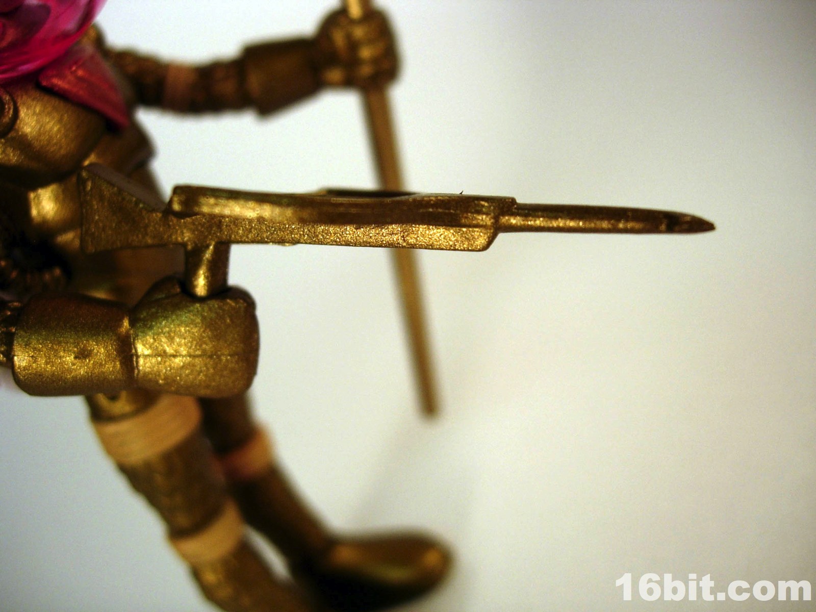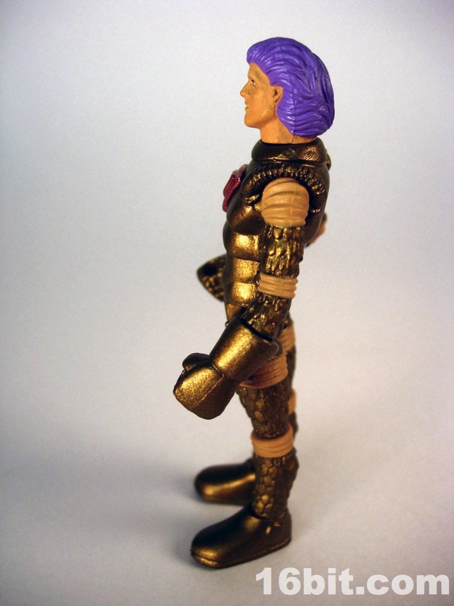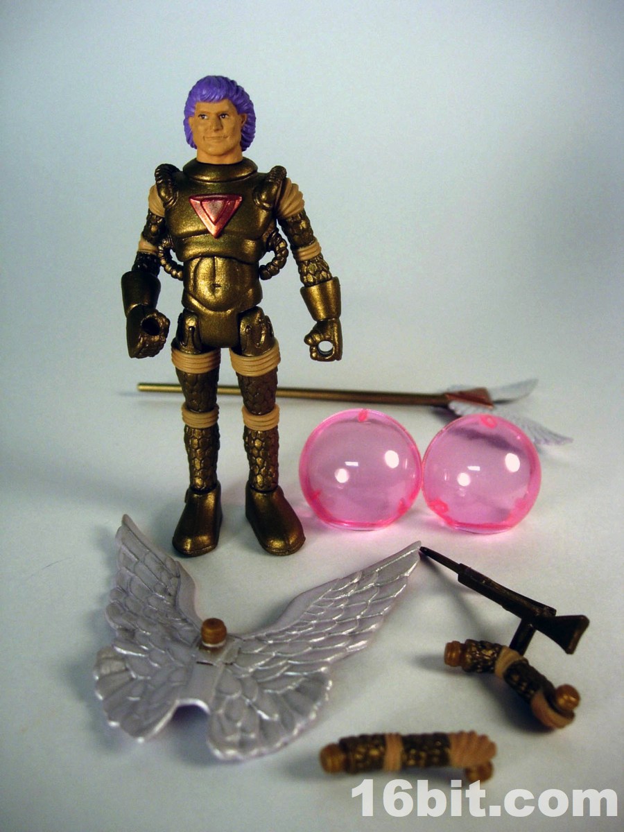 Painted similarly to the original 1968 bendable toy figure, Commander Comet is painted gold with a yellowish brown color on what were once accordion-style joints. The head is a typical white person's flesh tone with atypical purple hair. The figure is rounded out by pearlescent white wings on both his back and his staff, which features a bronze triangle and a gold handle. This is new to the action figure release-- the original 1968 toy only included the crossbow, so you get a little more bang for your buck here. Unlike many of the other Outer Space Men figures, Comet has a quasi-feathery sculpted space suit which is significantly different in texture from the other figures in the line. You can also make out his belly button, for some reason. The pink bubblegum helmet is very close to the original photography, and the metallic and pearly paint just make this figure look more expensive than the 2010 figures. Even though it does cost more, when you get one in your hands, it's not hard to see why you're being charged the extra $2.50. (I can't say the same for the awesome yet teeny Alpha 7, but this series as a whole looks much more expensive than the original quartet.)