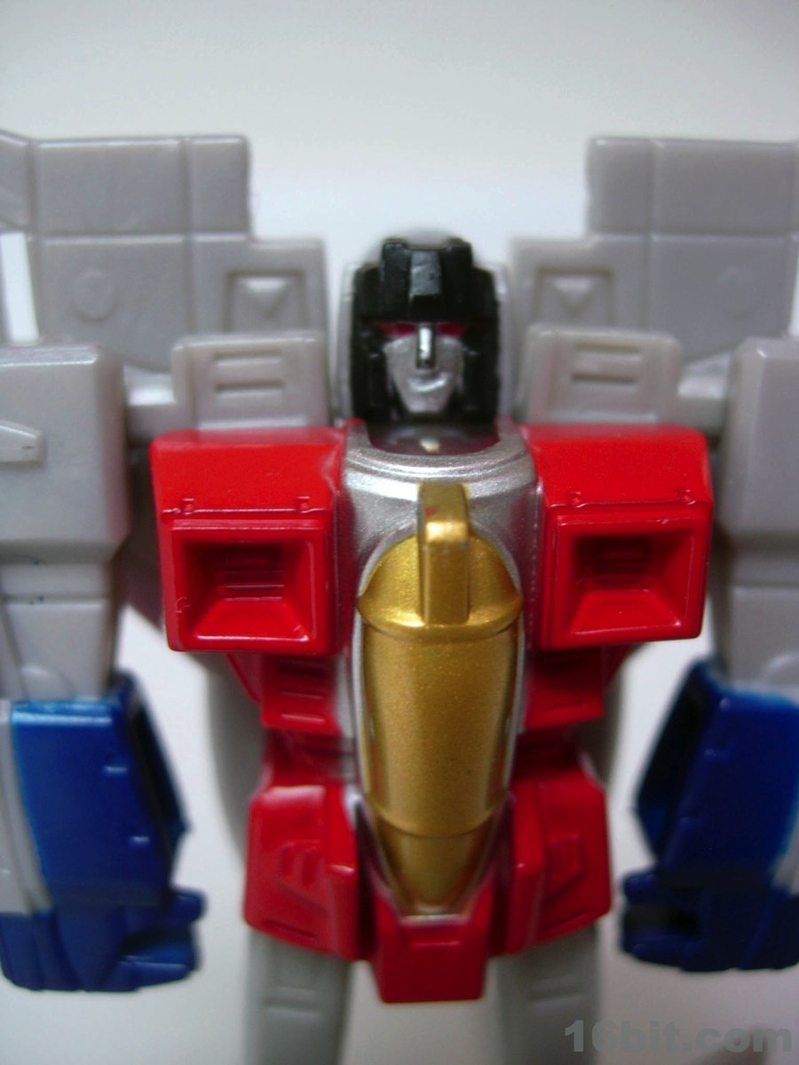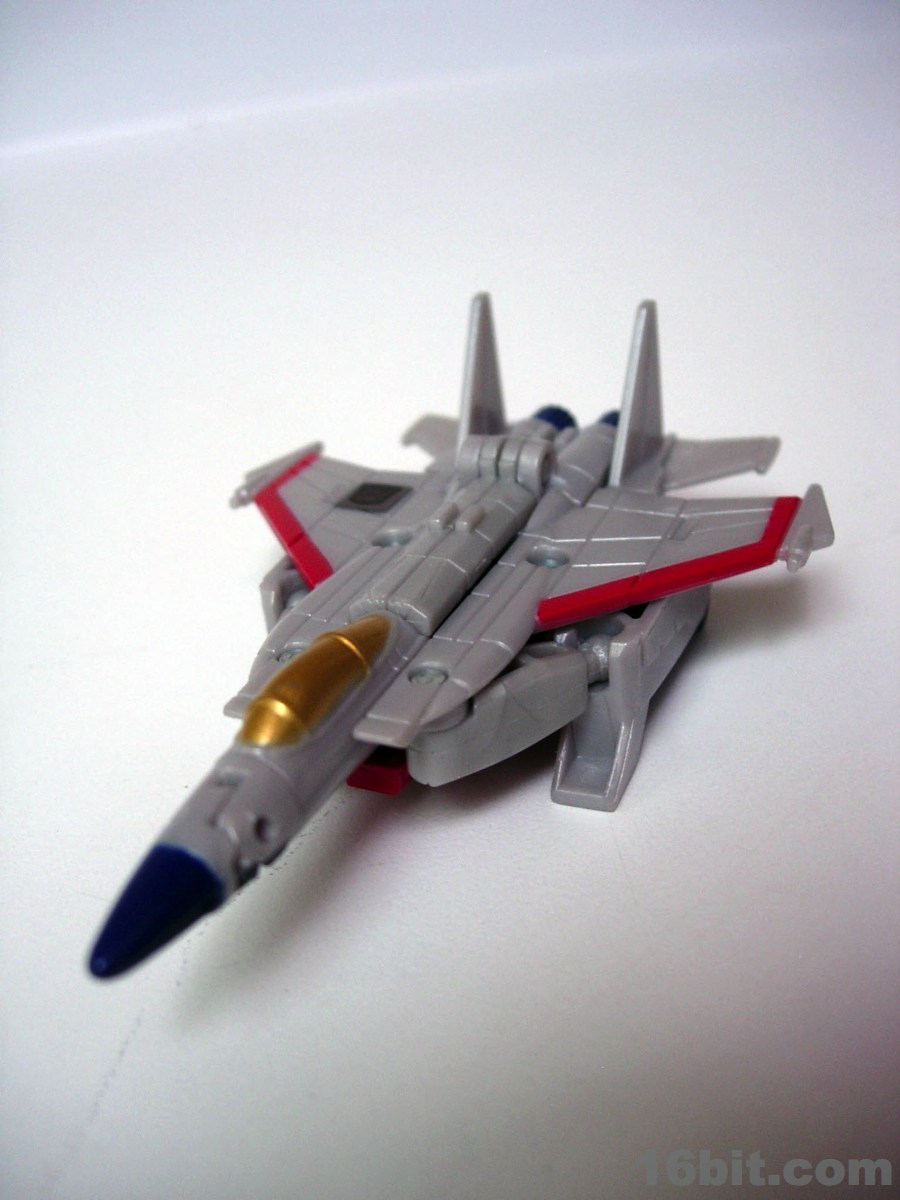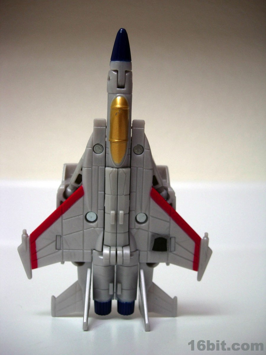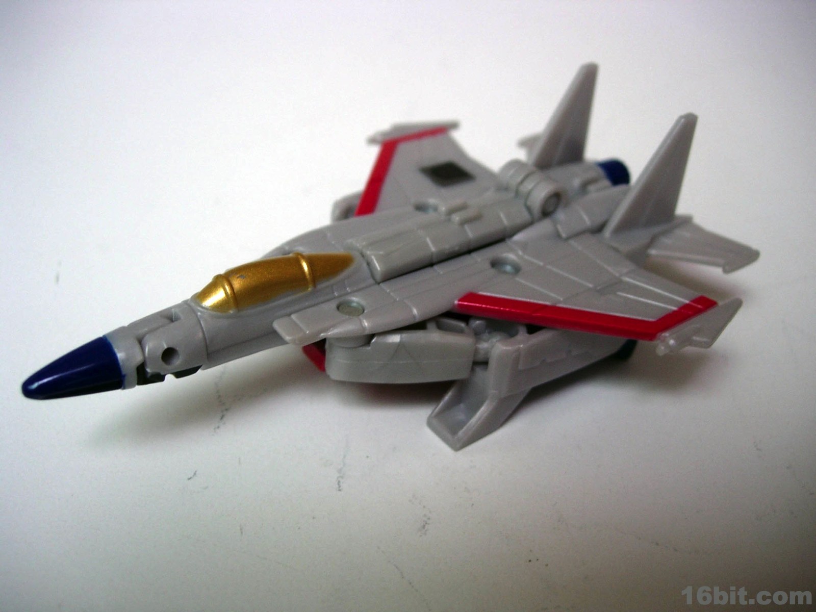 This one has articulated shoulders, hips, and knees plus he's got a swell smirk for a tiny toy. He looks a lot like the original character with null-ray cannons on his arms and a red chest with the obligatory canopy for his chest. The funny thing, though, is that it's a false canopy-- it's sculpted under the plane and the actual plane canopy tucks behind it during the transformation process. (See below for a picture, as I don't want to write another 1,000 words.) He doesn't have the Decepticon symbol on his wings due to the rubsign "Reveal the Shield" gimmick, but that's why we have Japanese repaints.
