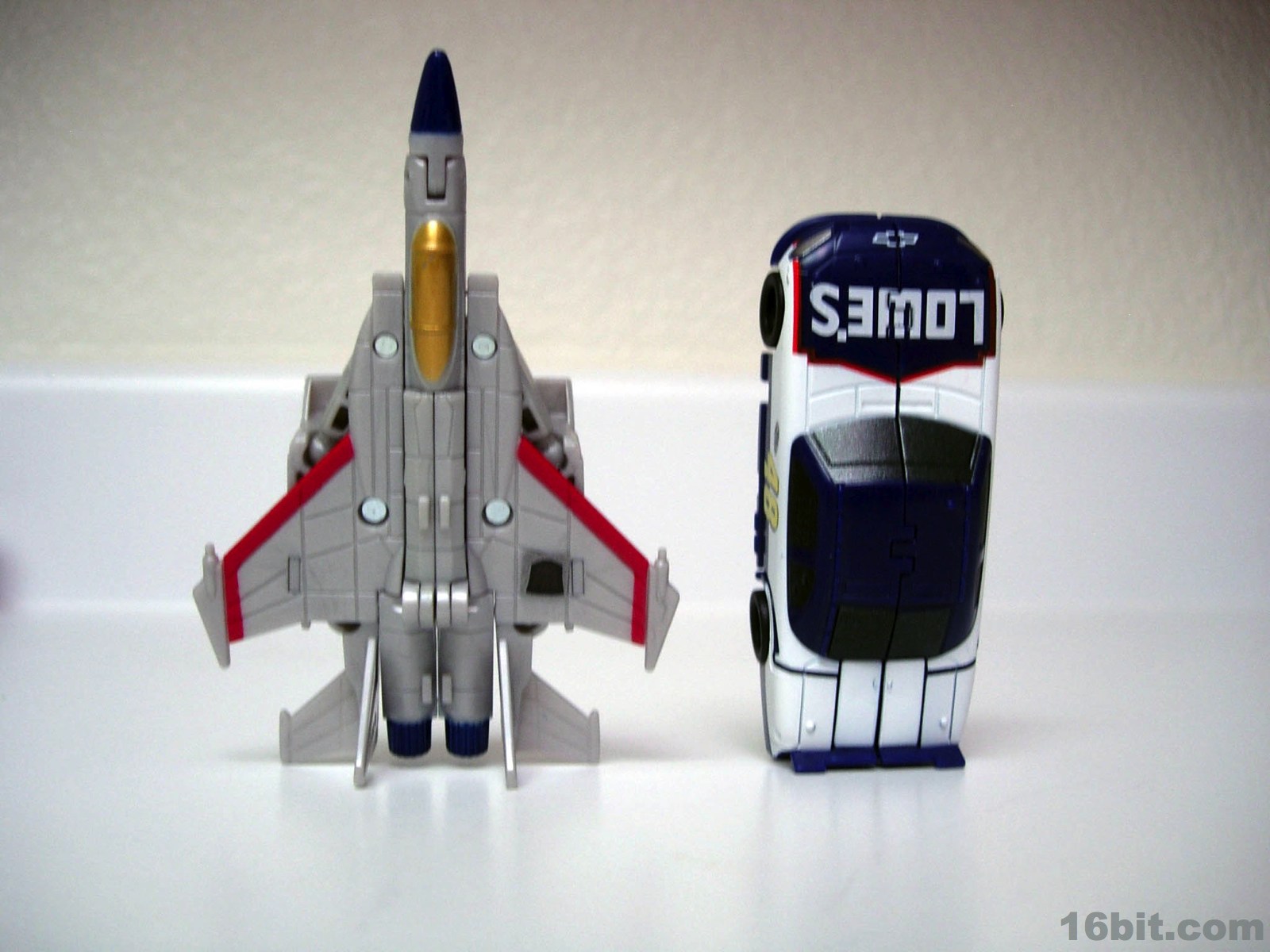 The jet looks really cool, with the guns tucking in behind the canopy and the various fins rotating in pleasing ways. There are no moving parts in plane mode, but there really don't need to be at this scale. It looks great, I think you're going to like it a lot.