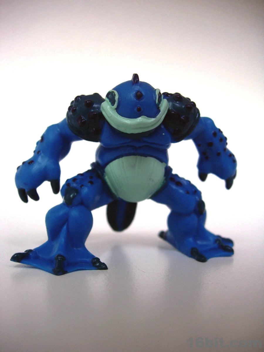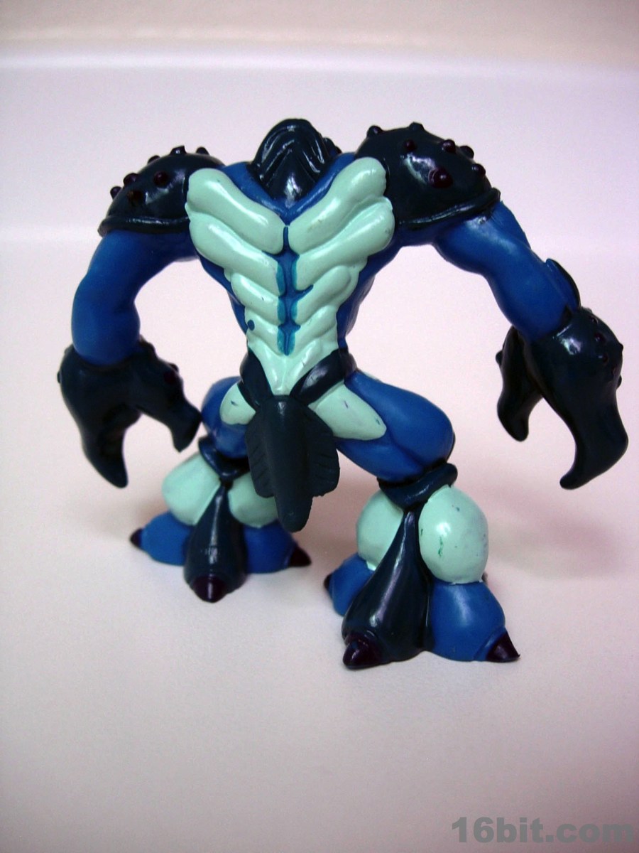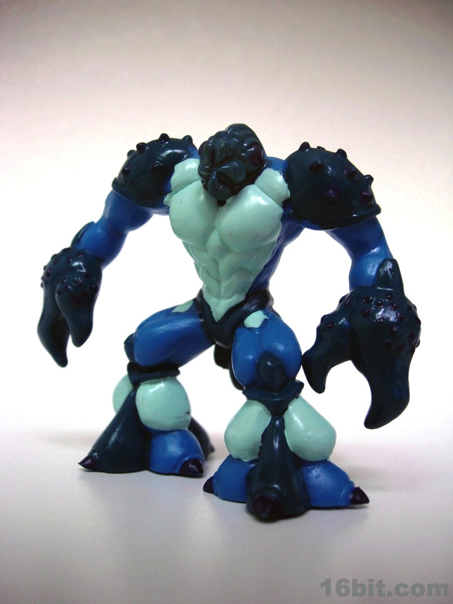 Rounding out the set is the token giant figure of Carrapax, teh Lord of the Sea. "PURE POWER!!" says his trading card, complete with all caps and twice the punctuation of your average sentence. He's a giant crab creature with similar shoulder pads, big claws, and strange bulbous feet. It's a big, mean, and muscular creature and I assume it is intended to be a big evil crab. He has a tiny tail and a very small head relative to his body, and the design doesn't seem to really take advantage of his paint. The pale blue and dark blue marks help give him a more interesting look than an unpainted figure, but having just typed that out I can't help but wonder if an unpainted one might be more visually interesting. It's OK-- it's the weakest figure in the set, but given its size it was probably intended to be its selling point.