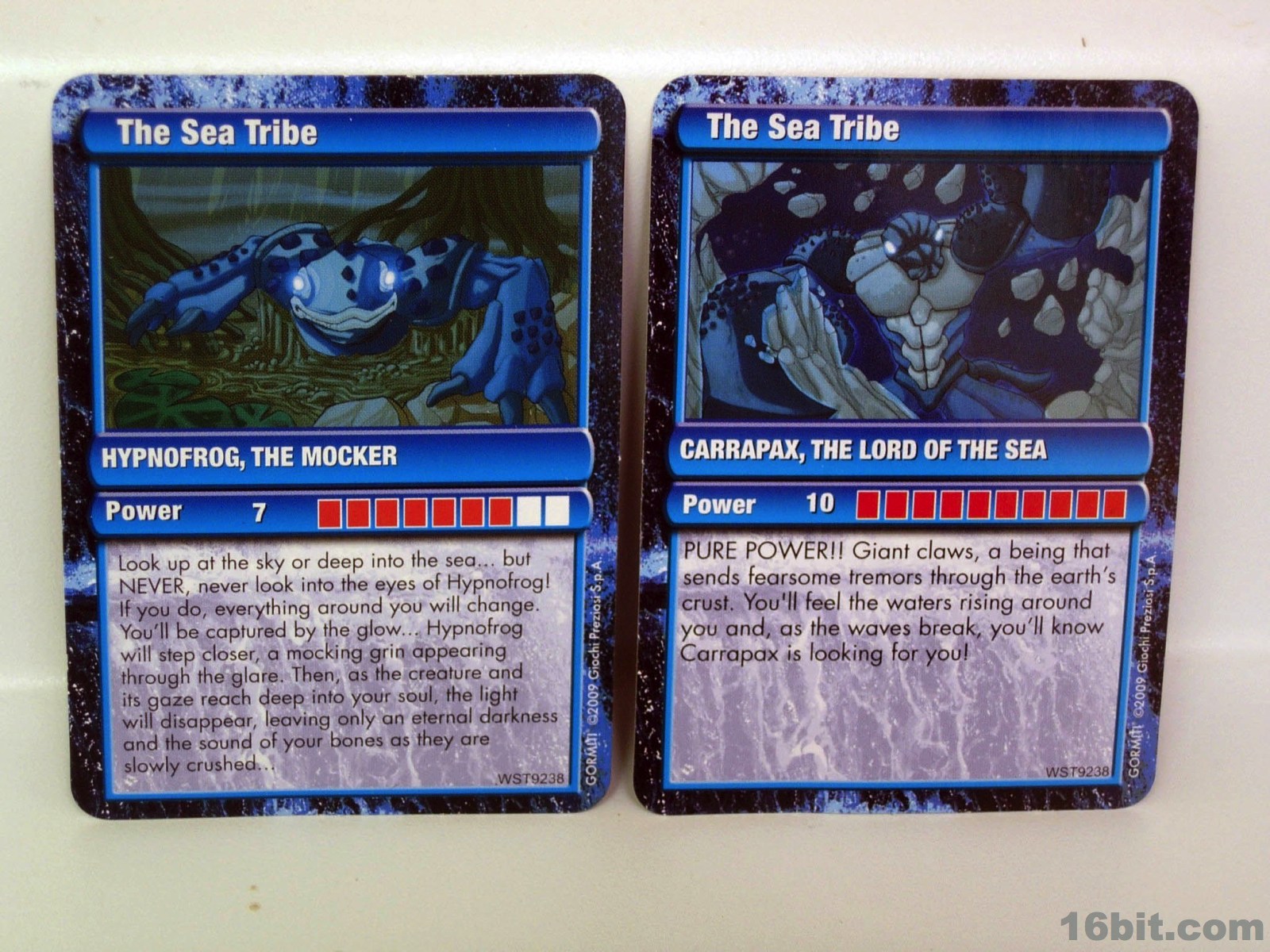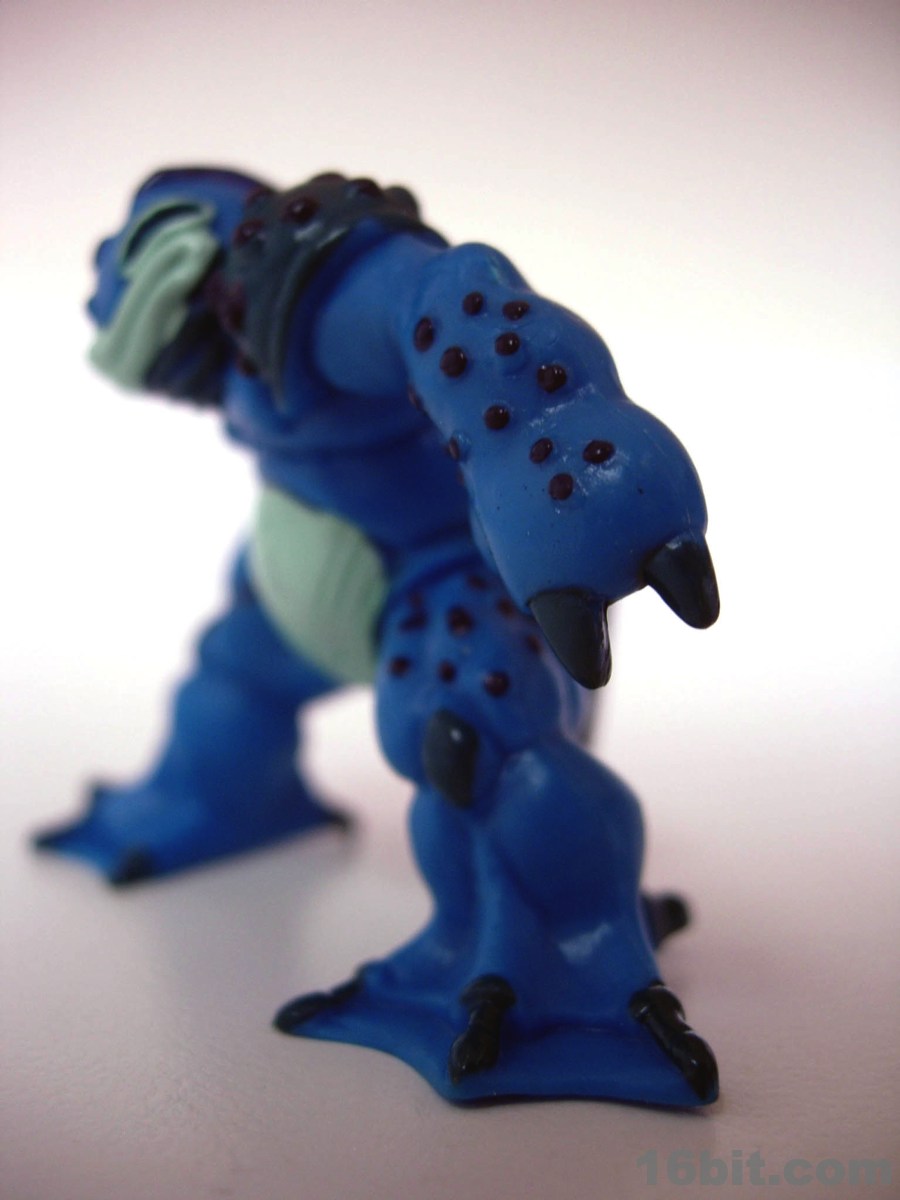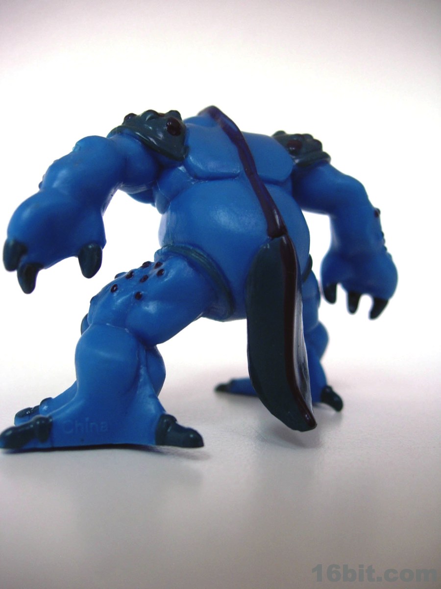 Rounding out the set is the token giant figure of Carrapax, teh Lord of the Sea. "PURE POWER!!" says his trading card, complete with all caps and twice the punctuation of your average sentence. He's a giant crab creature with similar shoulder pads, big claws, and strange bulbous feet. It's a big, mean, and muscular creature and I assume it is intended to be a big evil crab. He has a tiny tail and a very small head relative to his body, and the design doesn't seem to really take advantage of his paint. The pale blue and dark blue marks help give him a more interesting look than an unpainted figure, but having just typed that out I can't help but wonder if an unpainted one might be more visually interesting. It's OK-- it's the weakest figure in the set, but given its size it was probably intended to be its selling point.