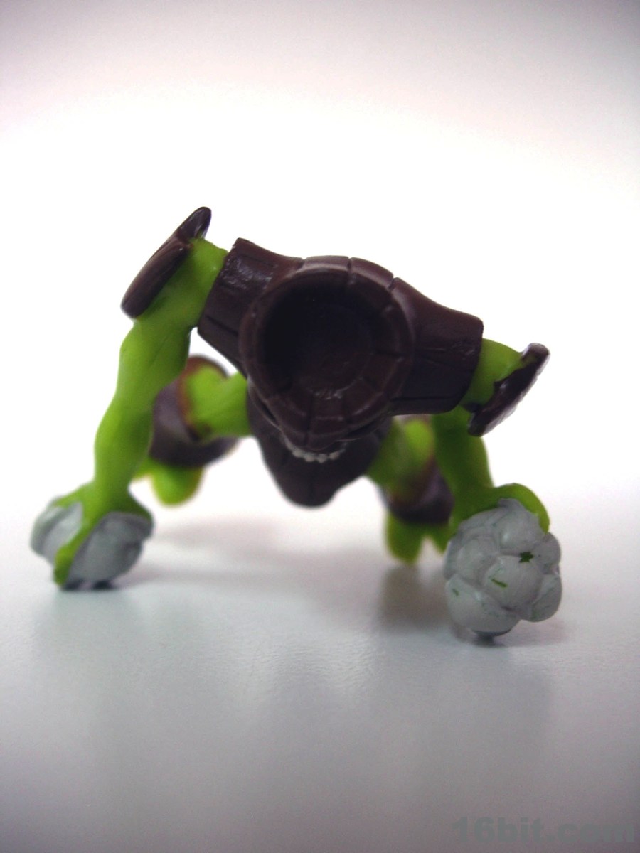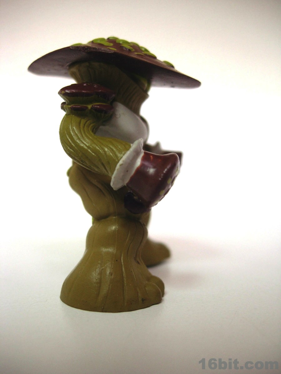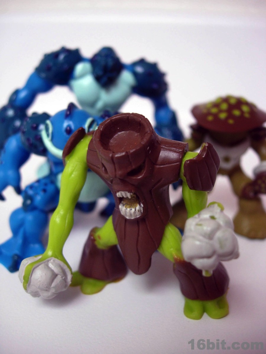 Next up is Cannon Trunk. The design, long with all four figures in this set, are excellent and it's really neat to see how this design seems to be inspired largely to the limitations of creating a tiny figure-- take a look at his "hands." Getting tiny vines that thin could be dangerous due to breakage, so rather than have "hands" the sculptors at Giochi Preziosi decided Cannon Trunk should be gripping rocks-- which launch out of his head. (Unfortunately, this kind of figure doesn't have a budget for such a mechanism, so you get to pretend.) The sculpt is quite excellent with a terrible freaky mouth that looks far creepier than his trading card art, with lots of simple detailing making up bark and vines on his body. This is one of the few figures which seems it would have made a really great action feature with a swell action feature, but it's just another small unarticulated PVC tree-- a good one, but this is one of the few times a little rubber guy like this seems like an idea which exceeds his plastic mandate.