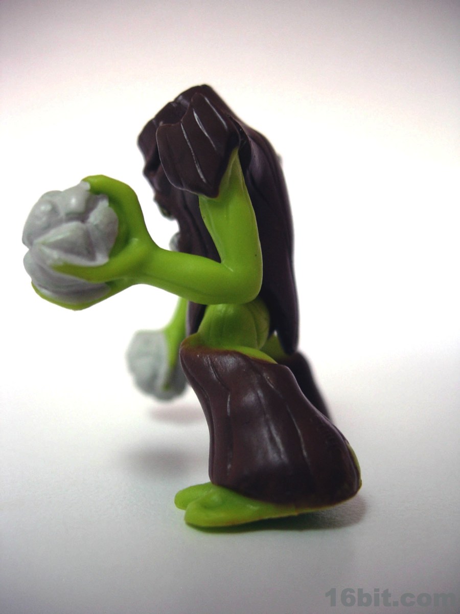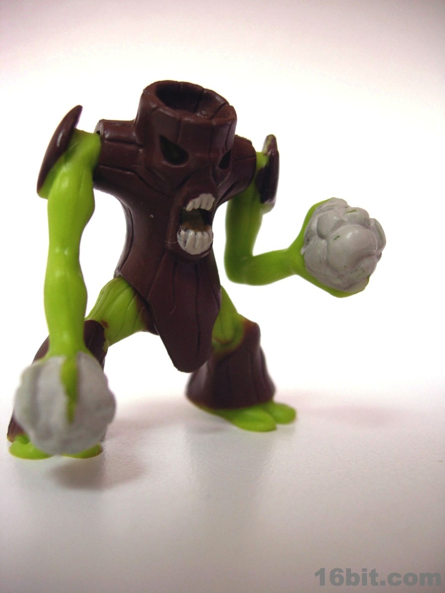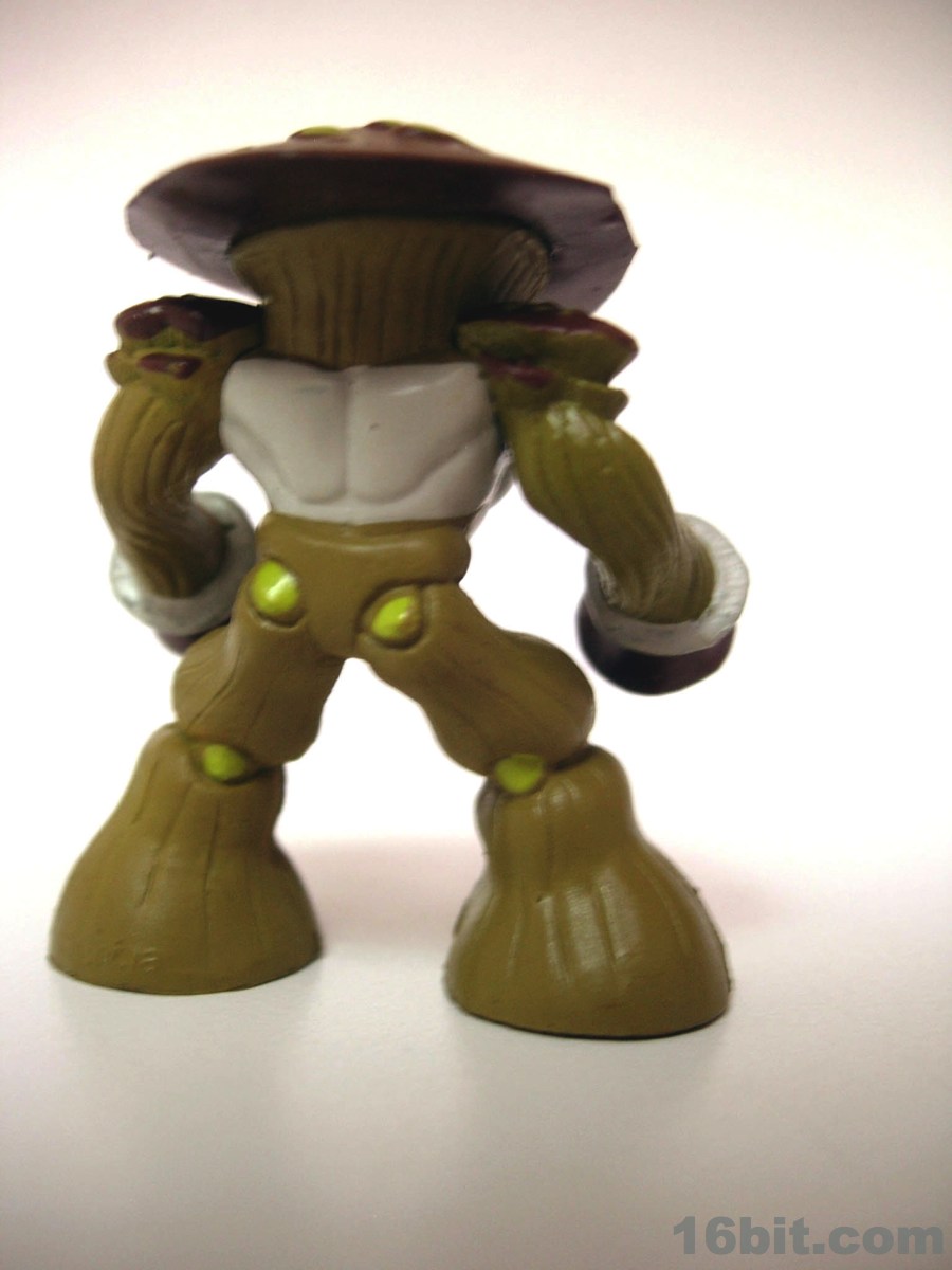 Next up is Cannon Trunk. The design, long with all four figures in this set, are excellent and it's really neat to see how this design seems to be inspired largely to the limitations of creating a tiny figure-- take a look at his "hands." Getting tiny vines that thin could be dangerous due to breakage, so rather than have "hands" the sculptors at Giochi Preziosi decided Cannon Trunk should be gripping rocks-- which launch out of his head. (Unfortunately, this kind of figure doesn't have a budget for such a mechanism, so you get to pretend.) The sculpt is quite excellent with a terrible freaky mouth that looks far creepier than his trading card art, with lots of simple detailing making up bark and vines on his body. This is one of the few figures which seems it would have made a really great action feature with a swell action feature, but it's just another small unarticulated PVC tree-- a good one, but this is one of the few times a little rubber guy like this seems like an idea which exceeds his plastic mandate.