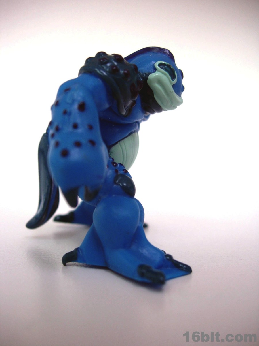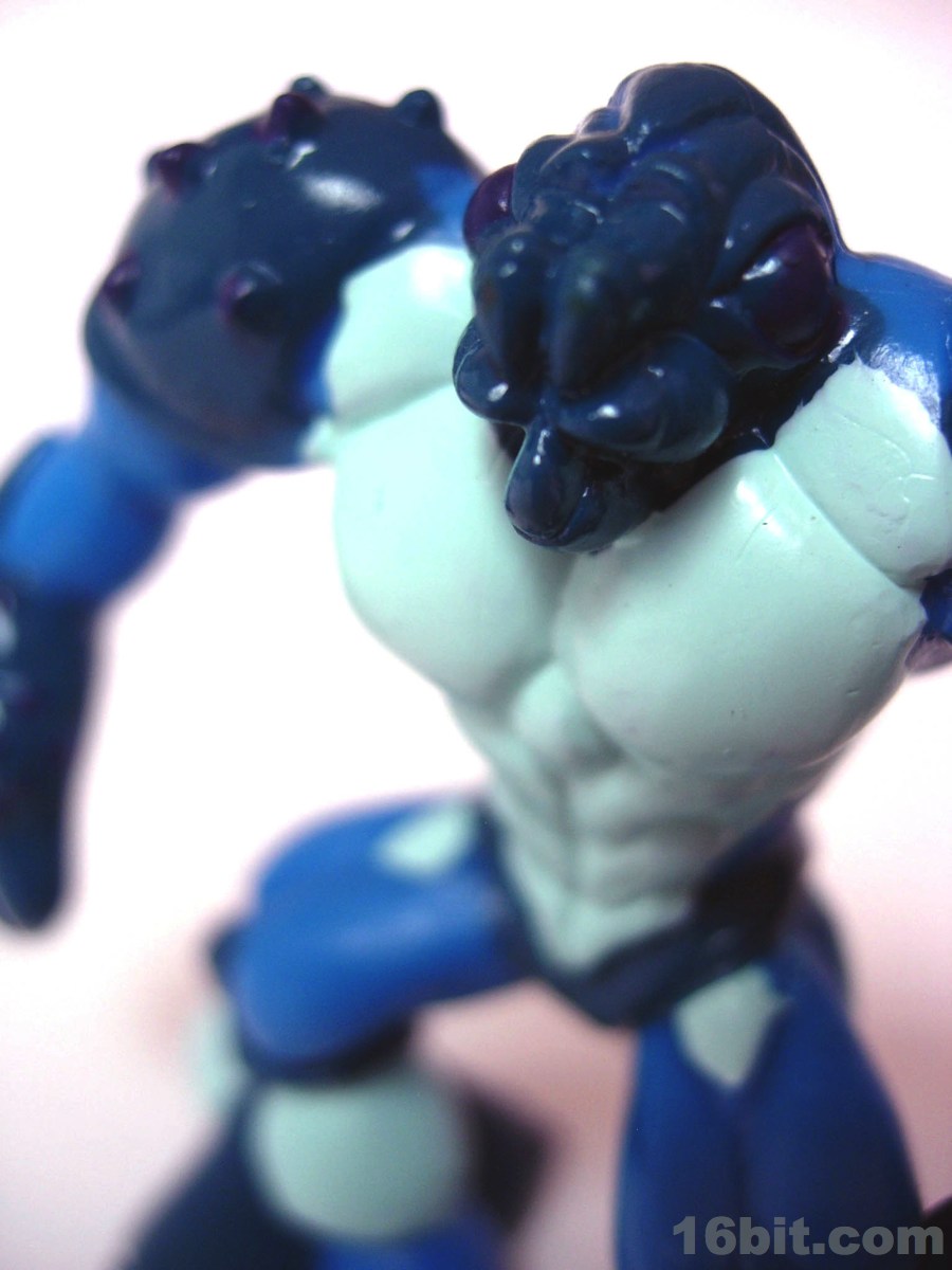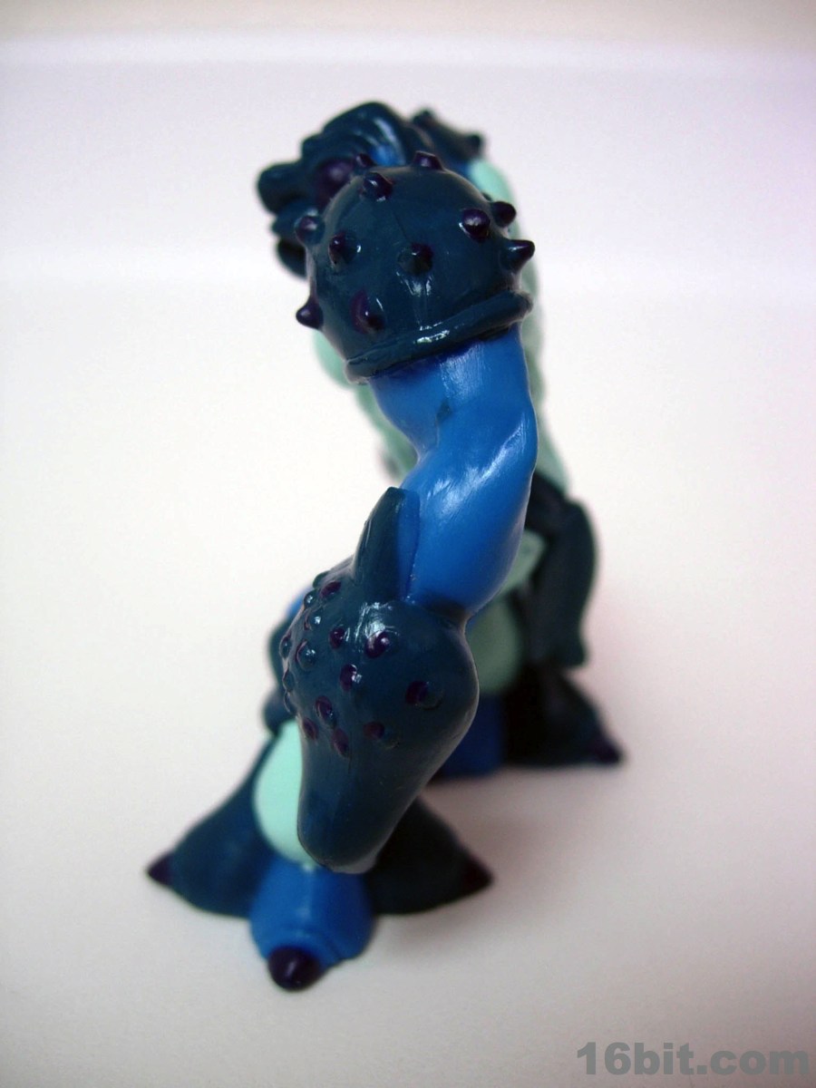 The rest of the set is made up of the Sea Tribe, water creatures and ocean life. Hypnofrog, the Mocker is much wider than the other figures in the set but is as tall as the other small figures in the set. Like Spores he has mind-control power, which I assume was cribbed from Futurama's Hypnotoad. I could be wrong-- if it is, that's either a sign of extreme laziness or a loving tribute to one of Matt Groening's lesser television projects. While the Hypnotoad seems largely harmless, Hypnofrog is said to have a "mocking grin" while you hear the "sound of your bones as they are slowly crushed." Maybe "The Mocker" is not so much important as "Bonecrusher." The sculpt has some decent detail, with warts, and armored shoulder pads giving a little bulk and heft to the pot-bellied blue amphibian. A tail-- maybe he's part tadpole?-- completes the ensemble, creating a big, mean, thick wrestler of a creature who looks quite the brute.