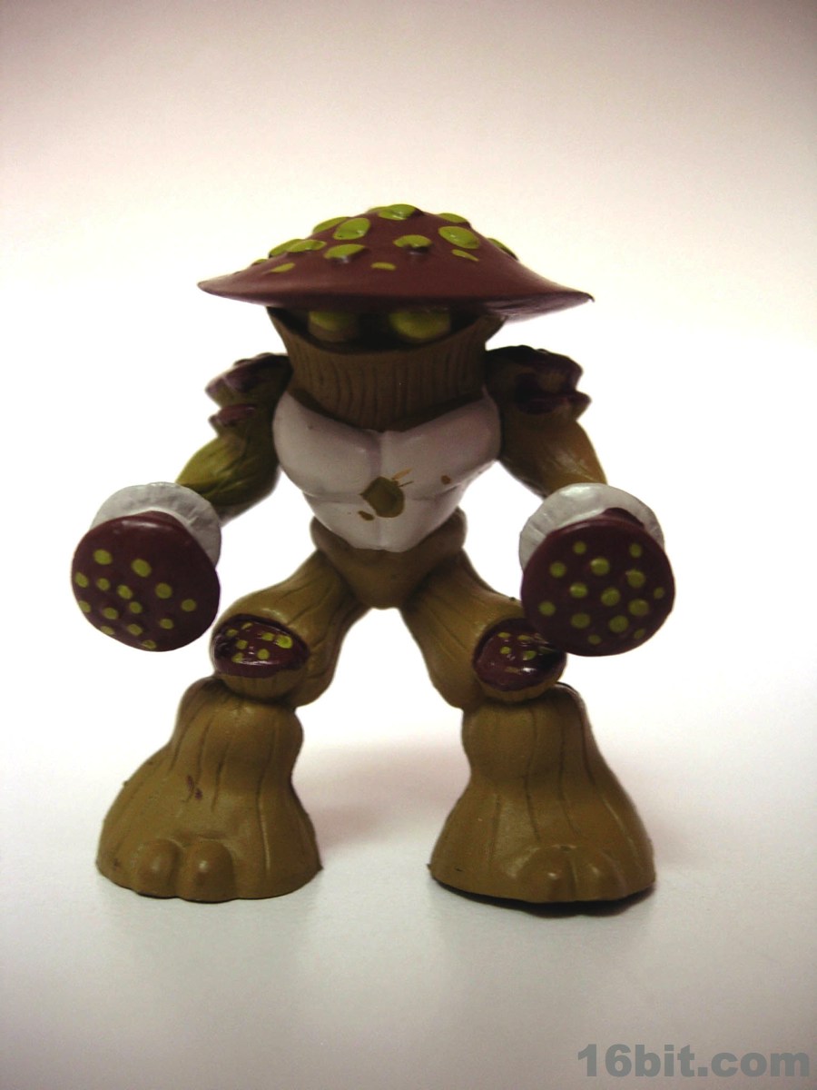 Still more Gormiti! There's a whole mess of these guys, and since I've been obsessed with the idea of small, cheap, unarticulated figures it seems like a good idea to talk about more of them. Let's get started with the two Forest Tribe members starting with the super-cool Spores the Terrible. Looking like an evil version of the mushrooms from Fantasia, Spores' card identifies him as yet another evil creature with mind-control powers which, well, seems to be about half of these guys. The sculpt is quite cool, with the big hat covering his head in a similar way to the Black Mages of Final Fantasy and Orko of Masters of the Universe. There are several mushrooms on the figure, including his "hands" which seem pretty darned useless as ways to manipulate a doorknob or a pencil. More mushrooms can be found on his knees and shoulders, and the figure is surprisingly well-decorated given only three colors of paint are used to bring this figure to life. Since he has no hands Spores will be bad at paperwork, but it doesn't seem to be what you'd hire him for anyway. Like the rest of Gormiti, he's sized similarly to the old M.U.S.C.L.E. line at about 1 3/4-inches tall.