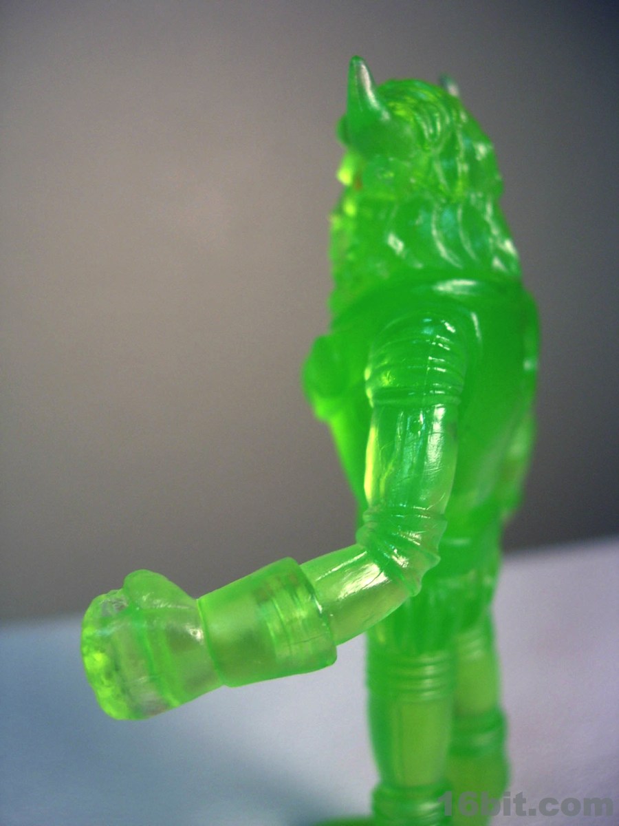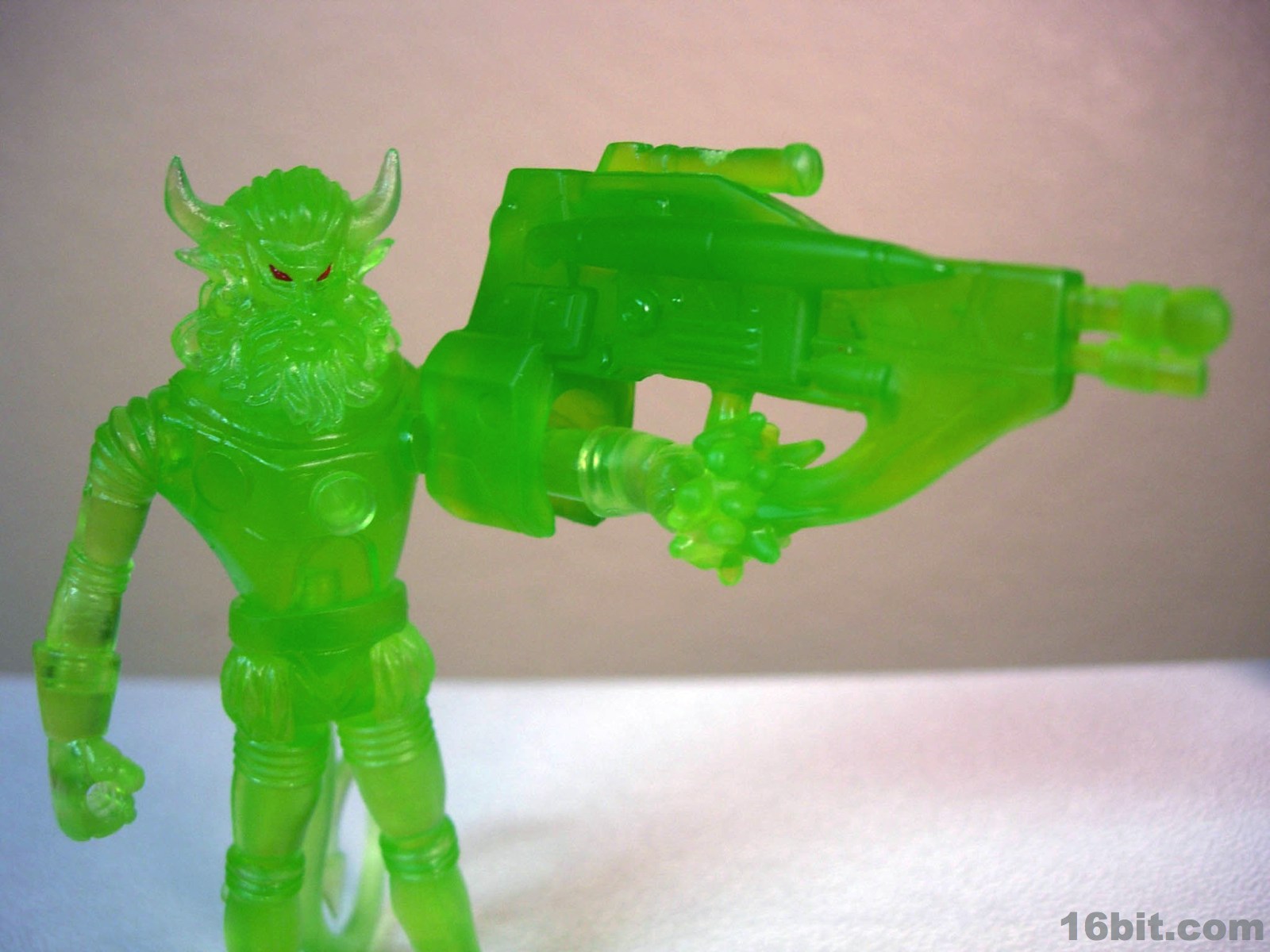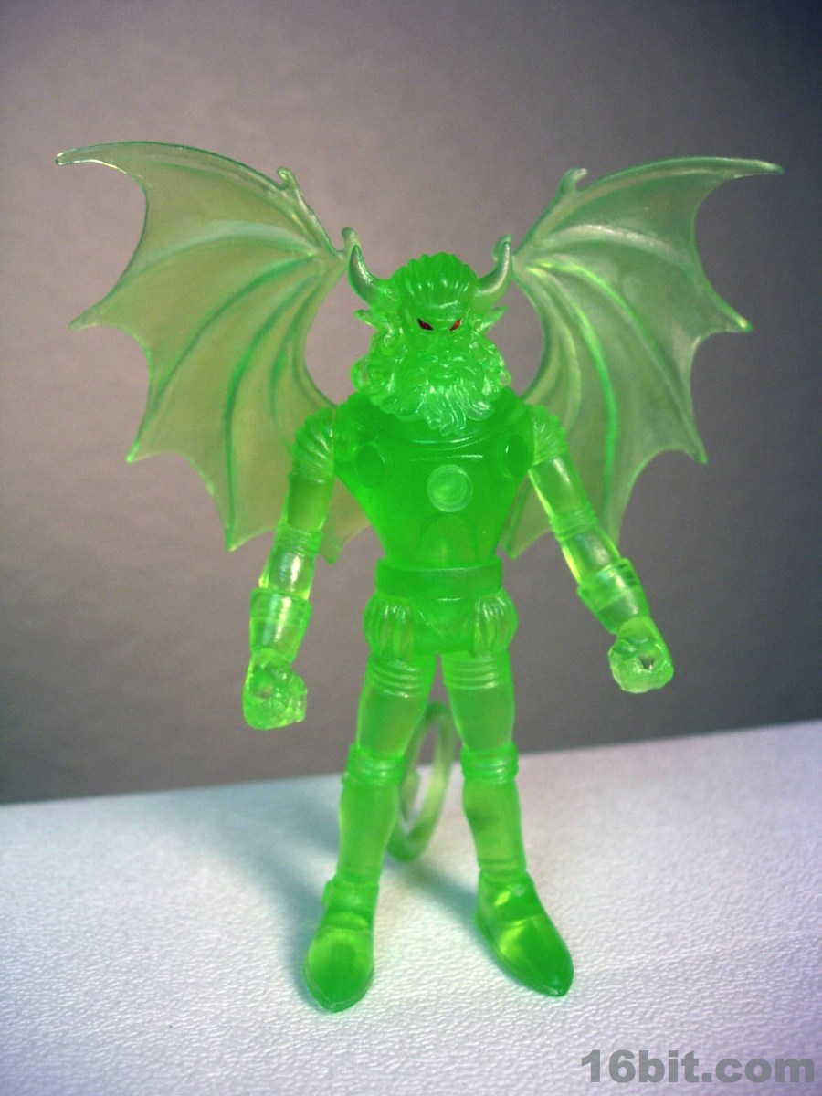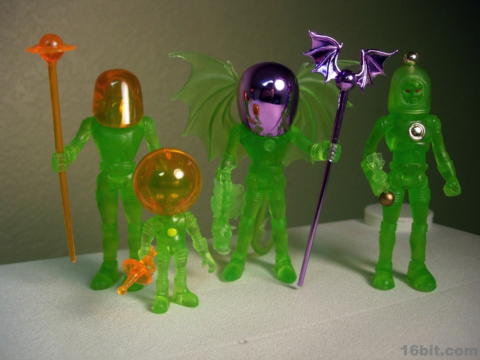 The staff was also given the vac-metal treatment, and it looks great-- there's a fair amount of detail in the wings that gets lost to translucent plastics, so seeing it in a solid color really adds to the value of the figure. His gargoyle gun returns and matches his body, and I really do dig the green color and appreciate that they keep using it. Seeing the group shots of like colored figures grow is both nifty and a little unsettling, particularly as the line grows every year with so few new painted or opaque figures in the line. This Mystron is totally fun because the color is a lot of fun and the helmet is nice and goofy, although I don't think anyone was clamoring for (or will clamor for in the future) this character in this particular color. For those of us who continue to collect them all, though, it's an essential purchase and it's not every day you find an alien devil with a Christmas ornament for a head.