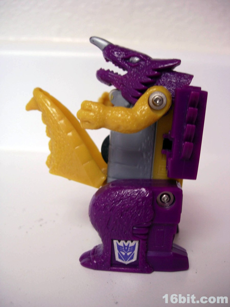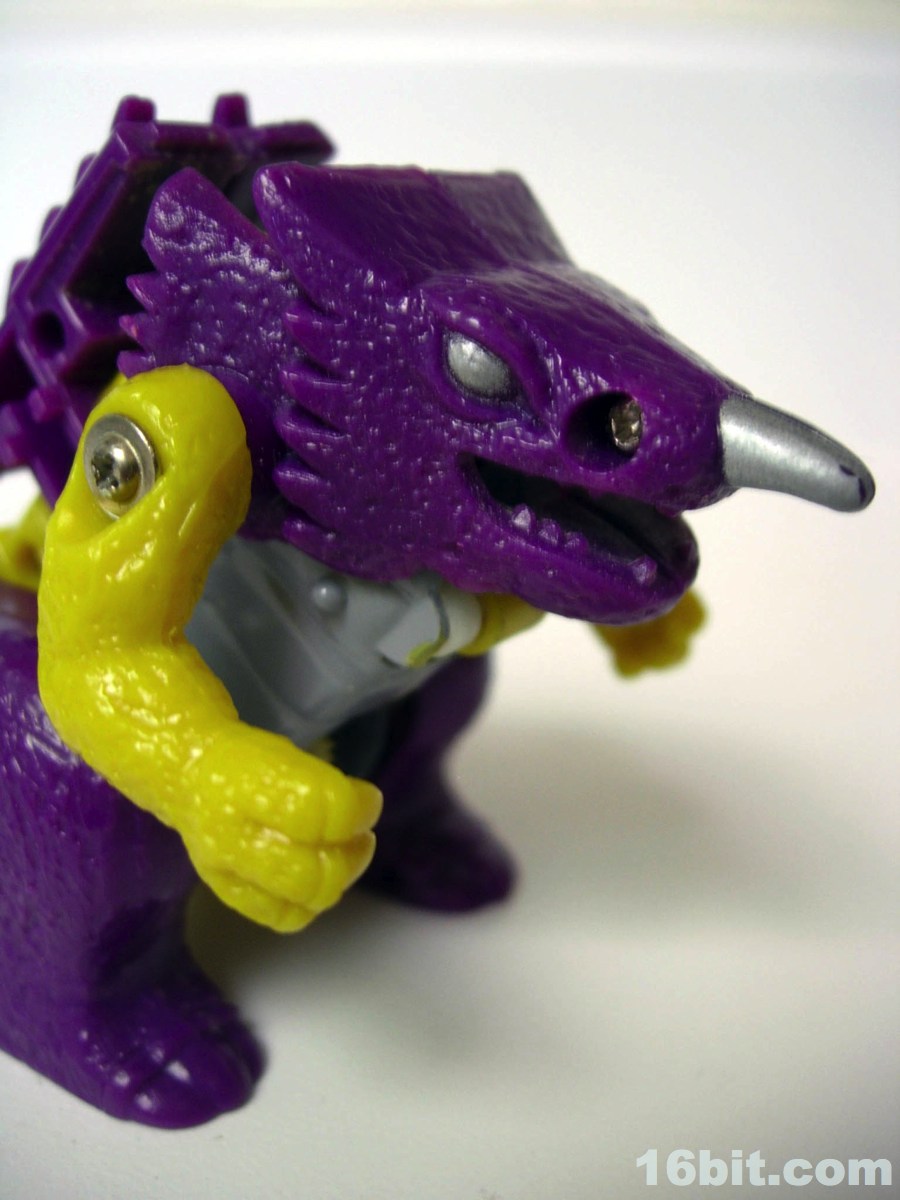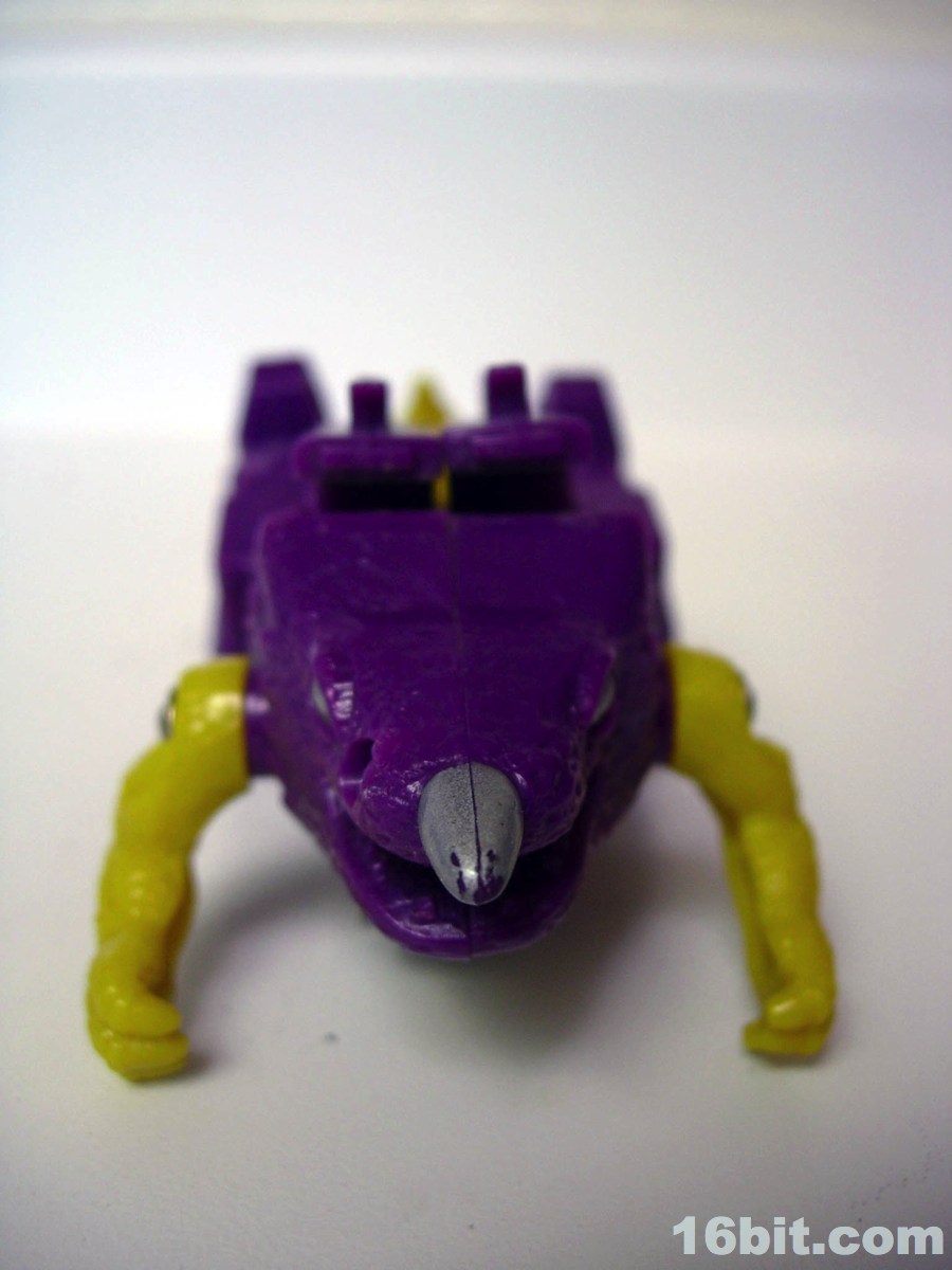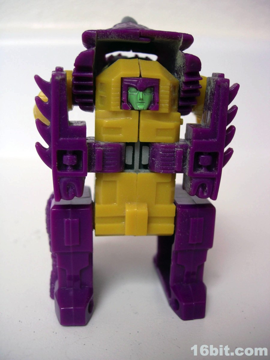 The monster mode is where the toy gets to be fun. There's a geared sparking mechanism powered by a wheel on his belly, which managed to create friction and make him zoom along the floor like some sort of psychotic penguin from Hell. (I appreciate this.) In monster mode, you could move his head, arms, and legs so he could stand or do this weird slip and slide pose. I dig it, the purple and yellow design looks appropriately late-1980s and frankly, he's cute. The fat little monster feels like he would be right at home fighting Godzilla or the Autobots, but in American cartoons he would do neither. (He did have a small role in the comics.)