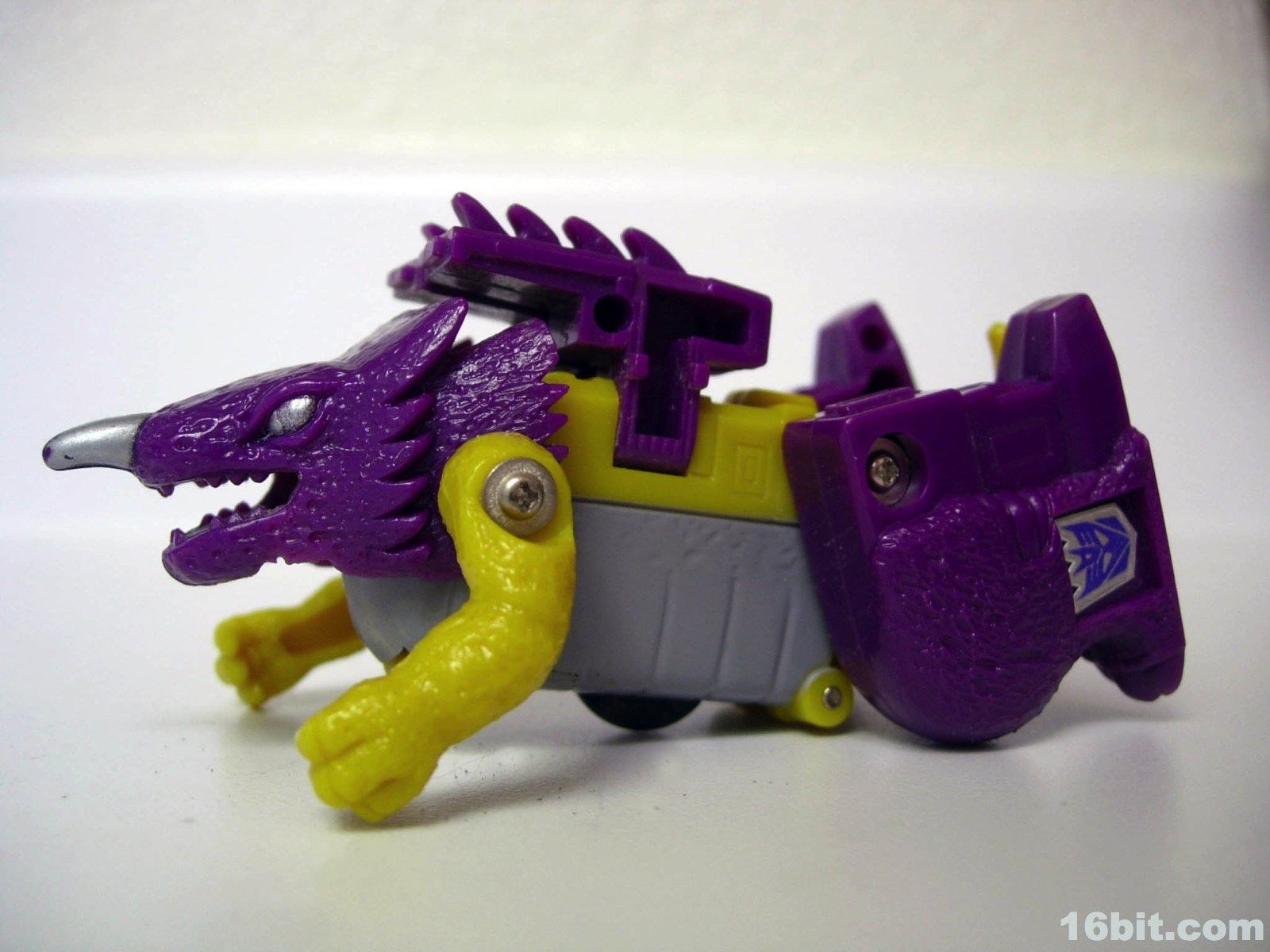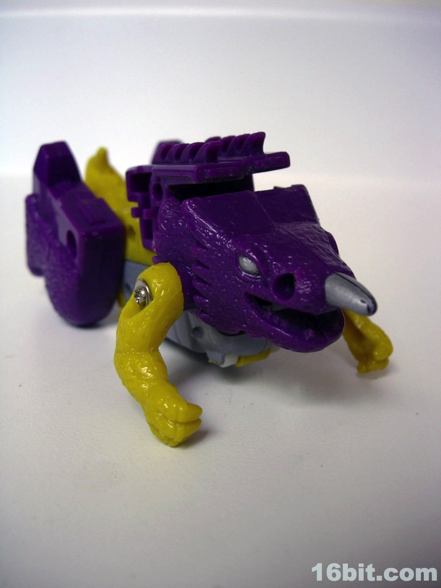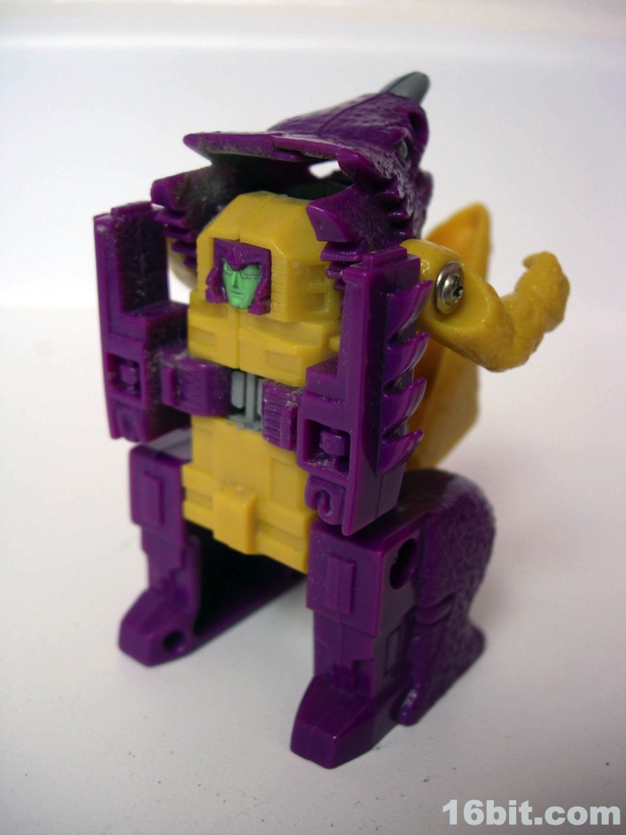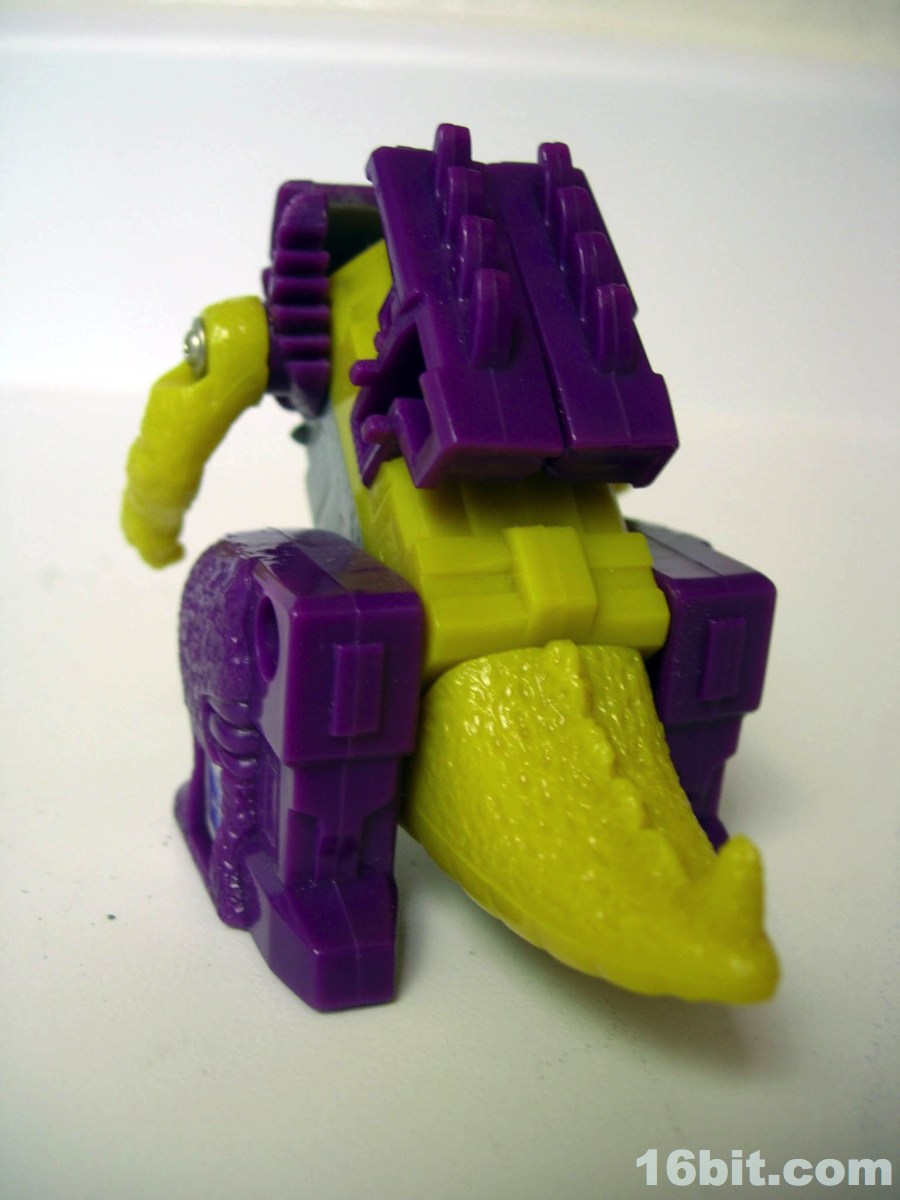 The monster mode is where the toy gets to be fun. There's a geared sparking mechanism powered by a wheel on his belly, which managed to create friction and make him zoom along the floor like some sort of psychotic penguin from Hell. (I appreciate this.) In monster mode, you could move his head, arms, and legs so he could stand or do this weird slip and slide pose. I dig it, the purple and yellow design looks appropriately late-1980s and frankly, he's cute. The fat little monster feels like he would be right at home fighting Godzilla or the Autobots, but in American cartoons he would do neither. (He did have a small role in the comics.)