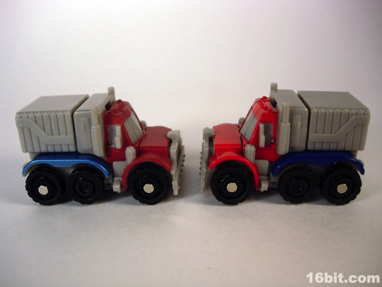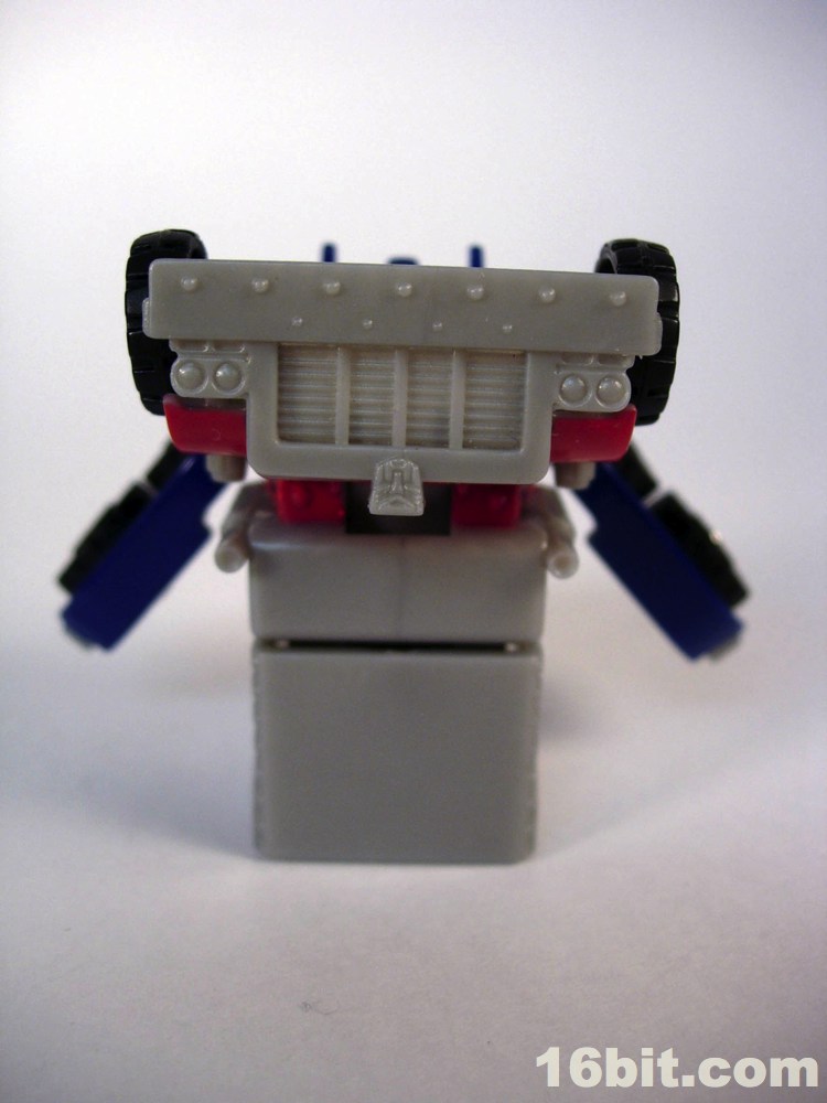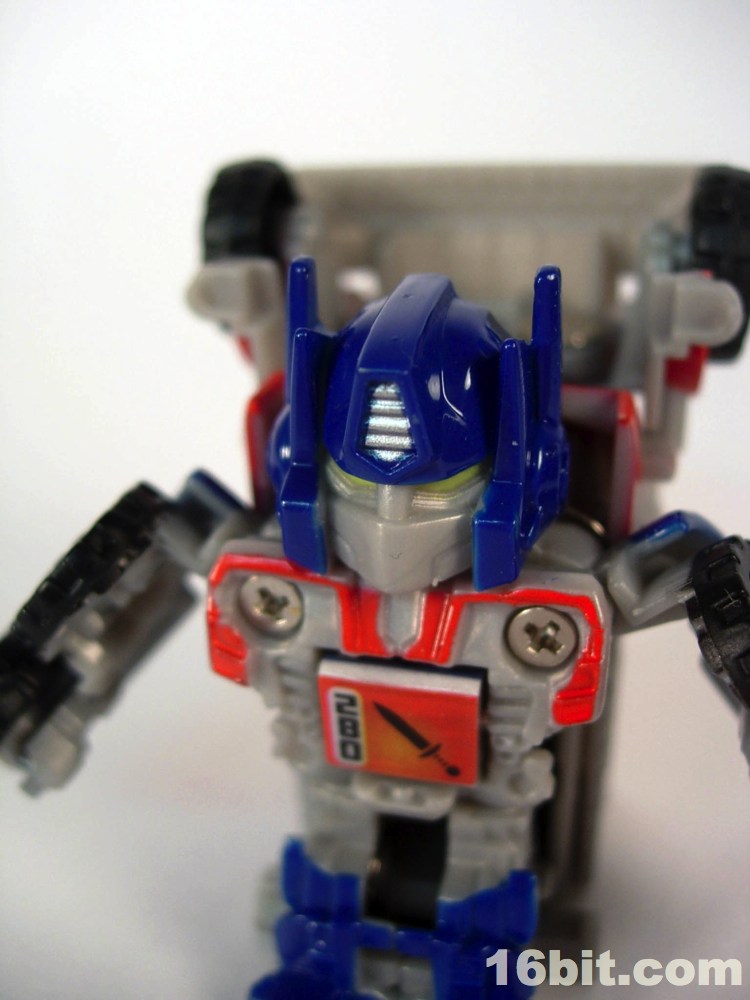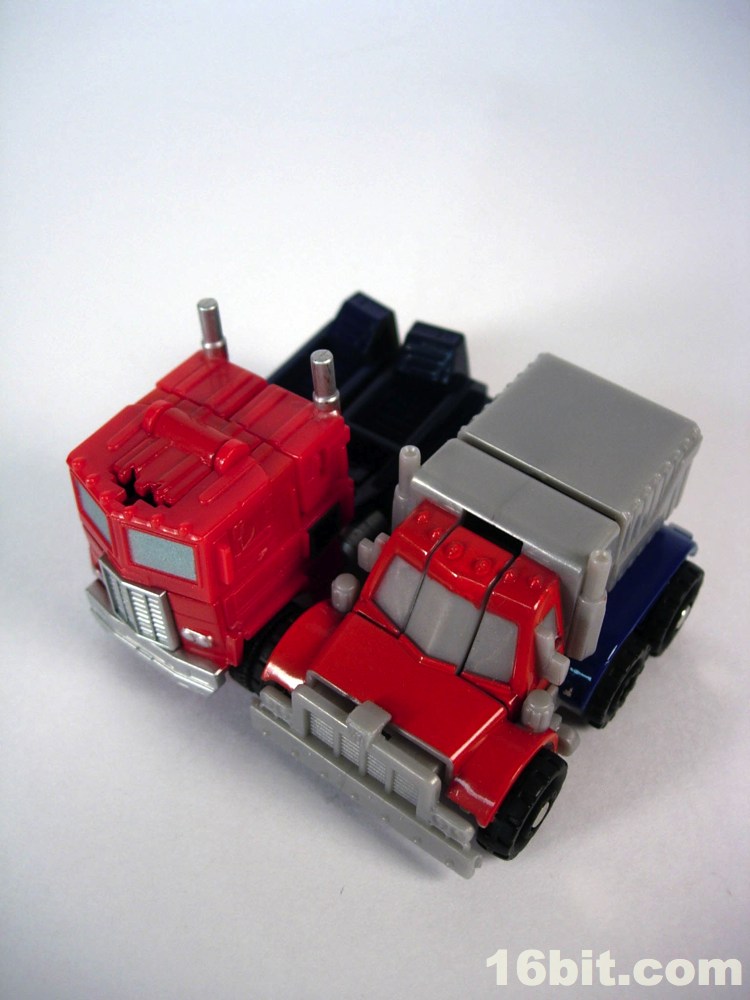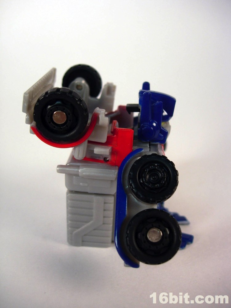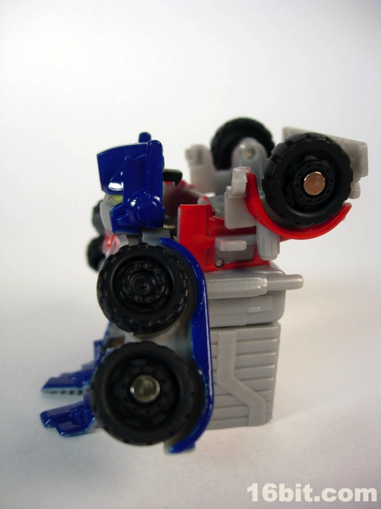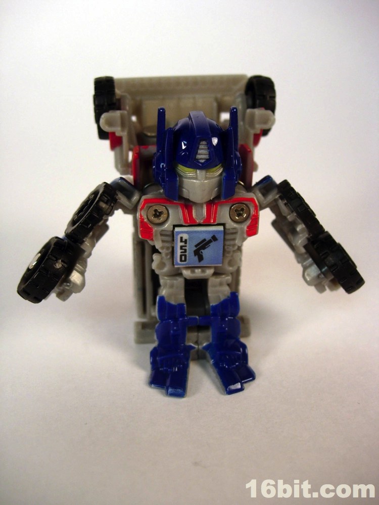 If you like minifigures, this thing is some sort of gift from the heavens. If you open and play with your toys, this is worth picking up. Optimus is a super-deformed long-nosed cab, similar to the appearance of the character in Transformers: Armada from around 2002. He has rolling wheels and a spring-loaded transformation which is activated by a spring-loaded trigger in his bumper. Hasbro says the auto-transformation is best activated by crashing the toy into another one, but this could result in wear-and-tear on the plastic or paint... so you can also push it gently and the little 2-inch dude springs right up. As a robot, he has no meaningful articulation-- the arms stick out, and he just kinda stands there.