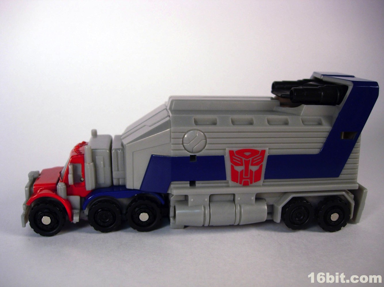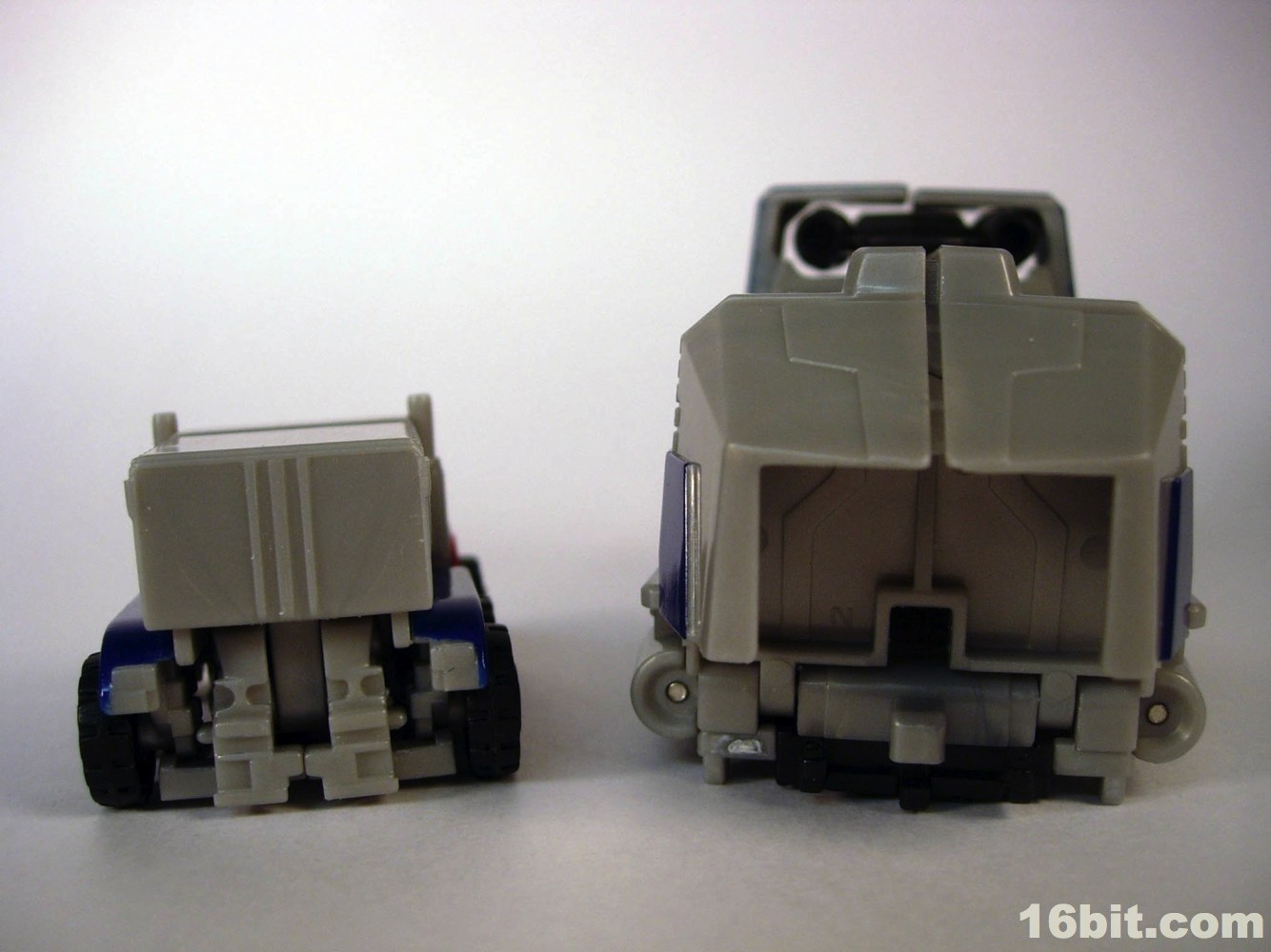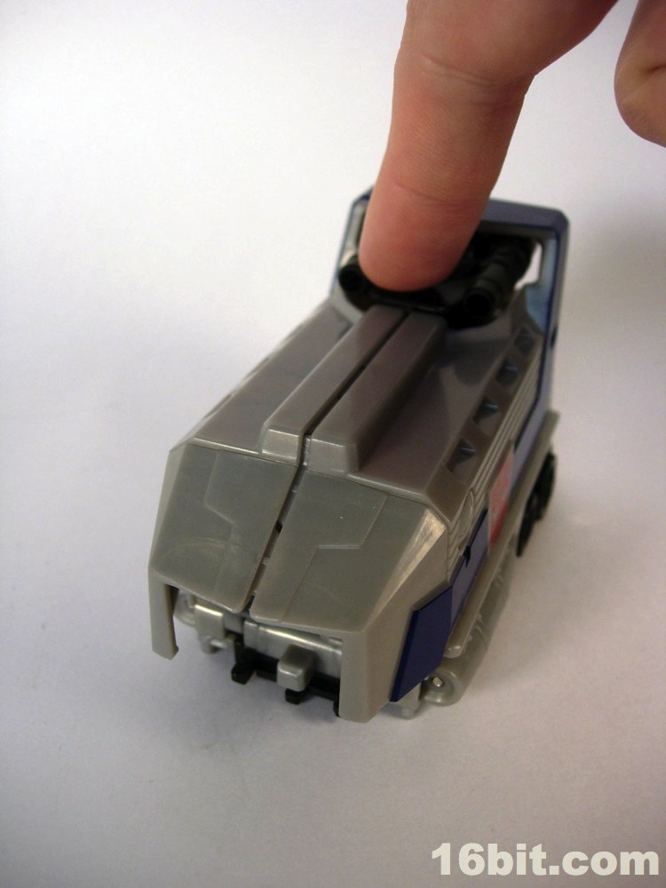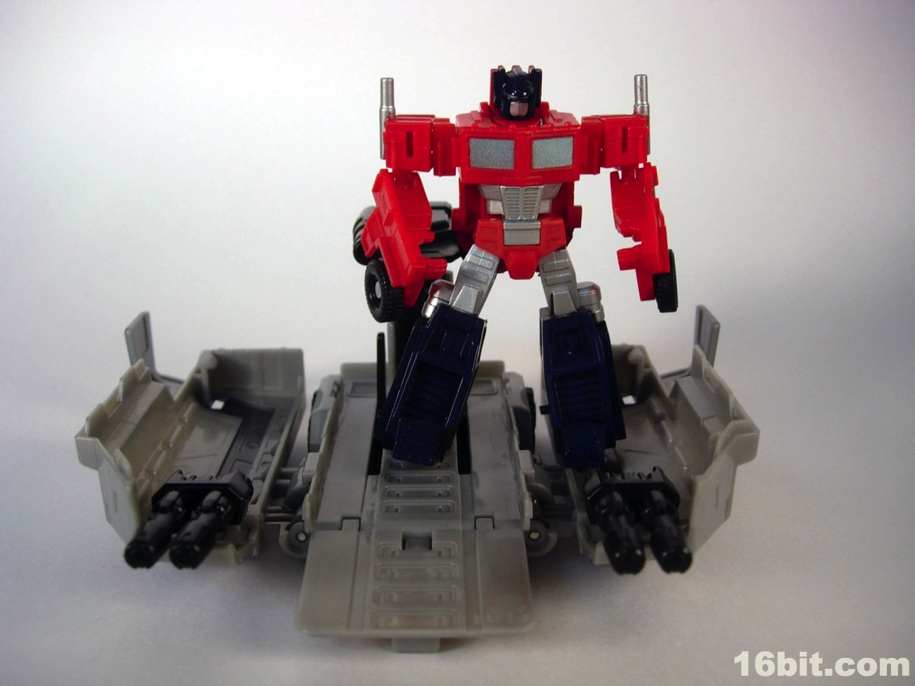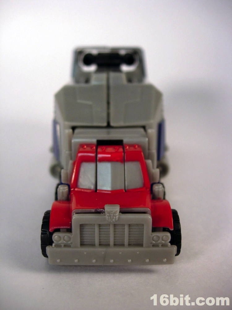 If you like minifigures, this thing is some sort of gift from the heavens. If you open and play with your toys, this is worth picking up. Optimus is a super-deformed long-nosed cab, similar to the appearance of the character in Transformers: Armada from around 2002. He has rolling wheels and a spring-loaded transformation which is activated by a spring-loaded trigger in his bumper. Hasbro says the auto-transformation is best activated by crashing the toy into another one, but this could result in wear-and-tear on the plastic or paint... so you can also push it gently and the little 2-inch dude springs right up. As a robot, he has no meaningful articulation-- the arms stick out, and he just kinda stands there.