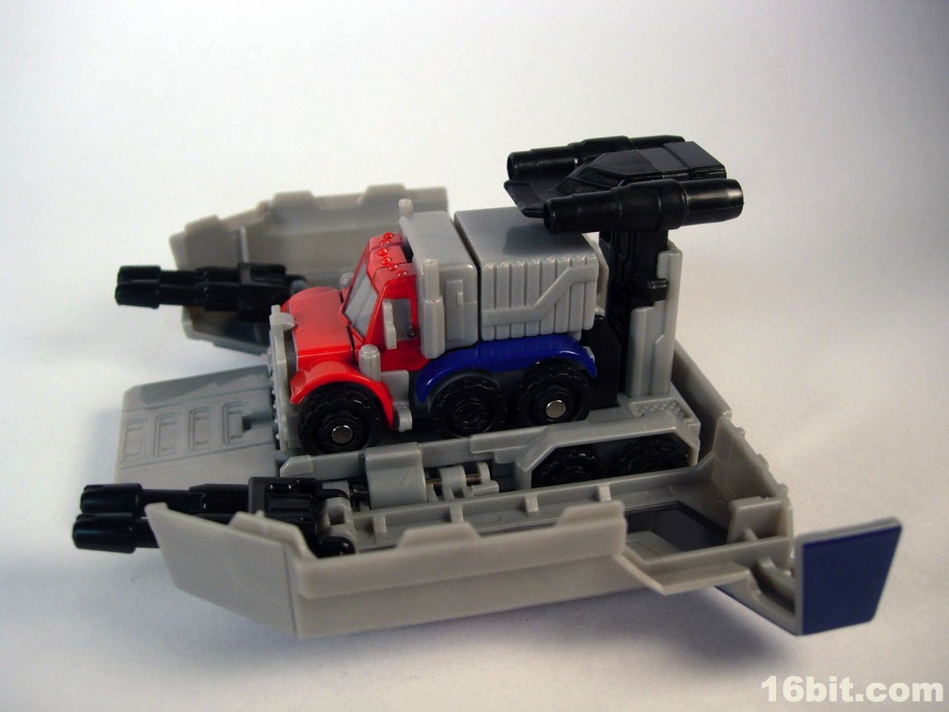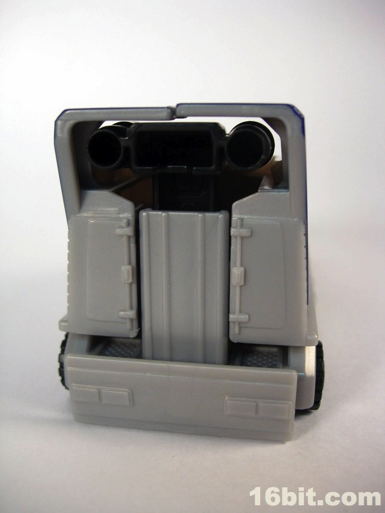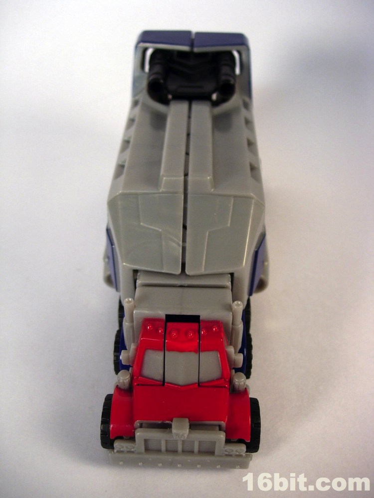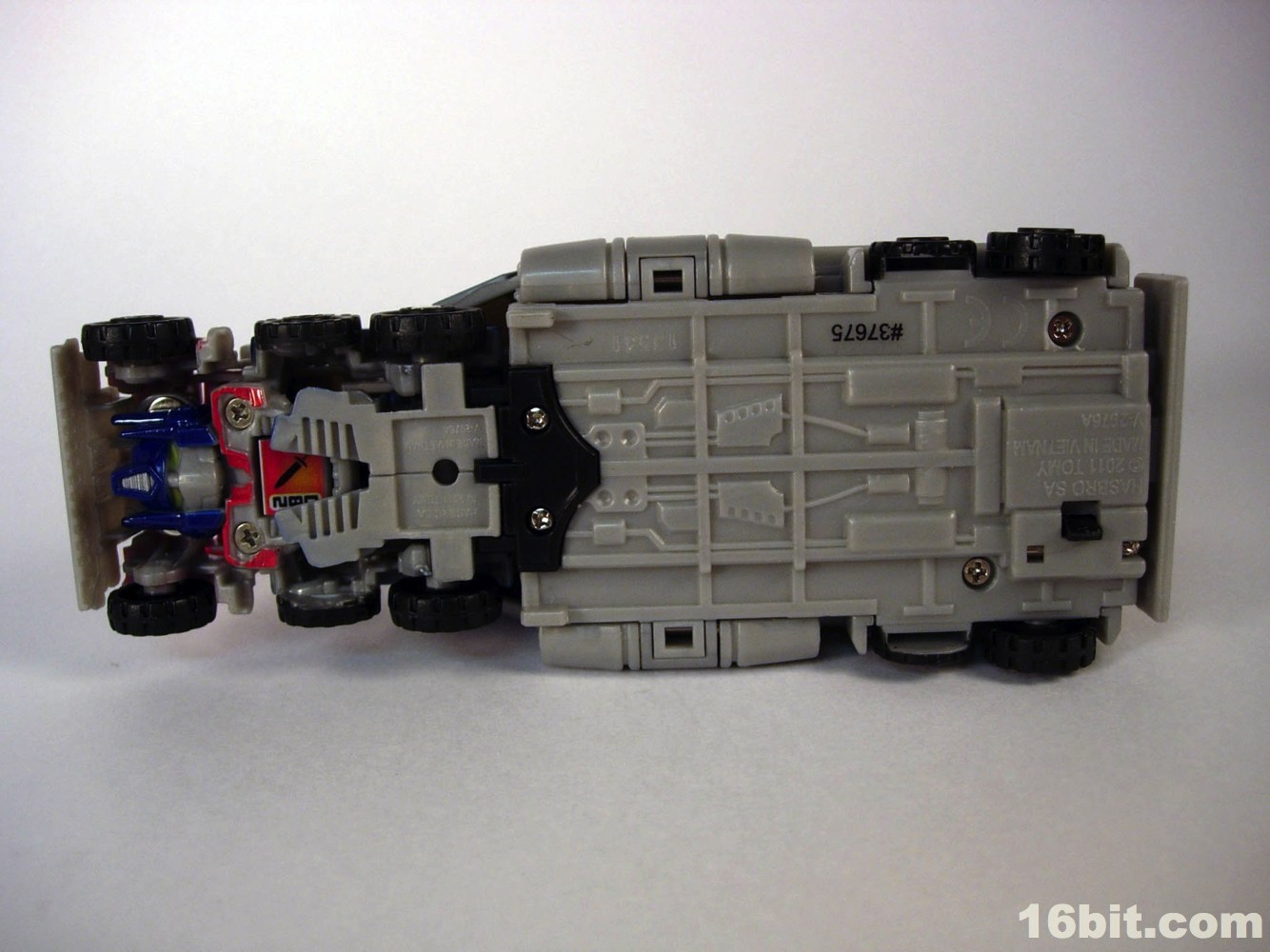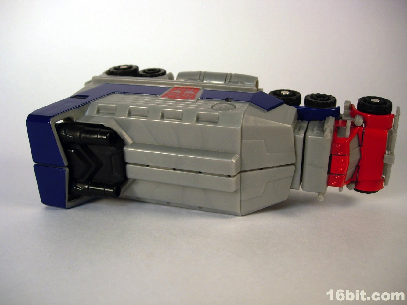 If you like minifigures, this thing is some sort of gift from the heavens. If you open and play with your toys, this is worth picking up. Optimus is a super-deformed long-nosed cab, similar to the appearance of the character in Transformers: Armada from around 2002. He has rolling wheels and a spring-loaded transformation which is activated by a spring-loaded trigger in his bumper. Hasbro says the auto-transformation is best activated by crashing the toy into another one, but this could result in wear-and-tear on the plastic or paint... so you can also push it gently and the little 2-inch dude springs right up. As a robot, he has no meaningful articulation-- the arms stick out, and he just kinda stands there.