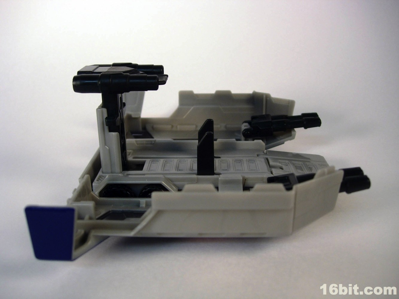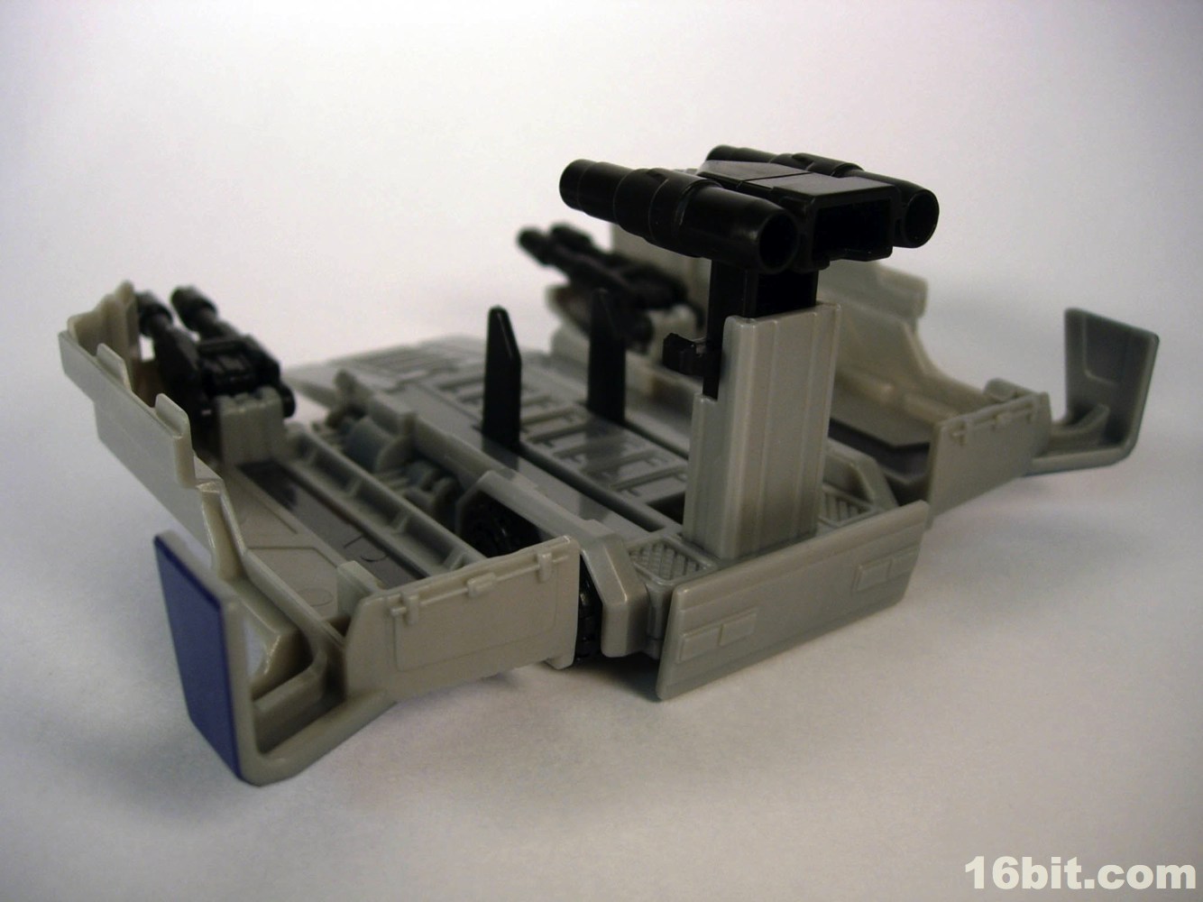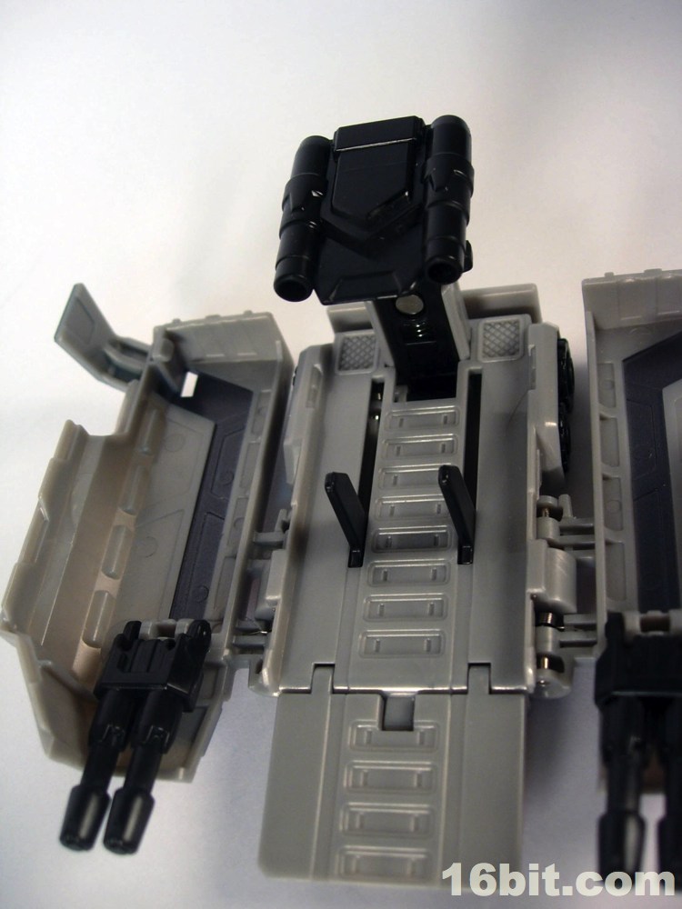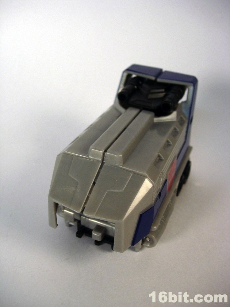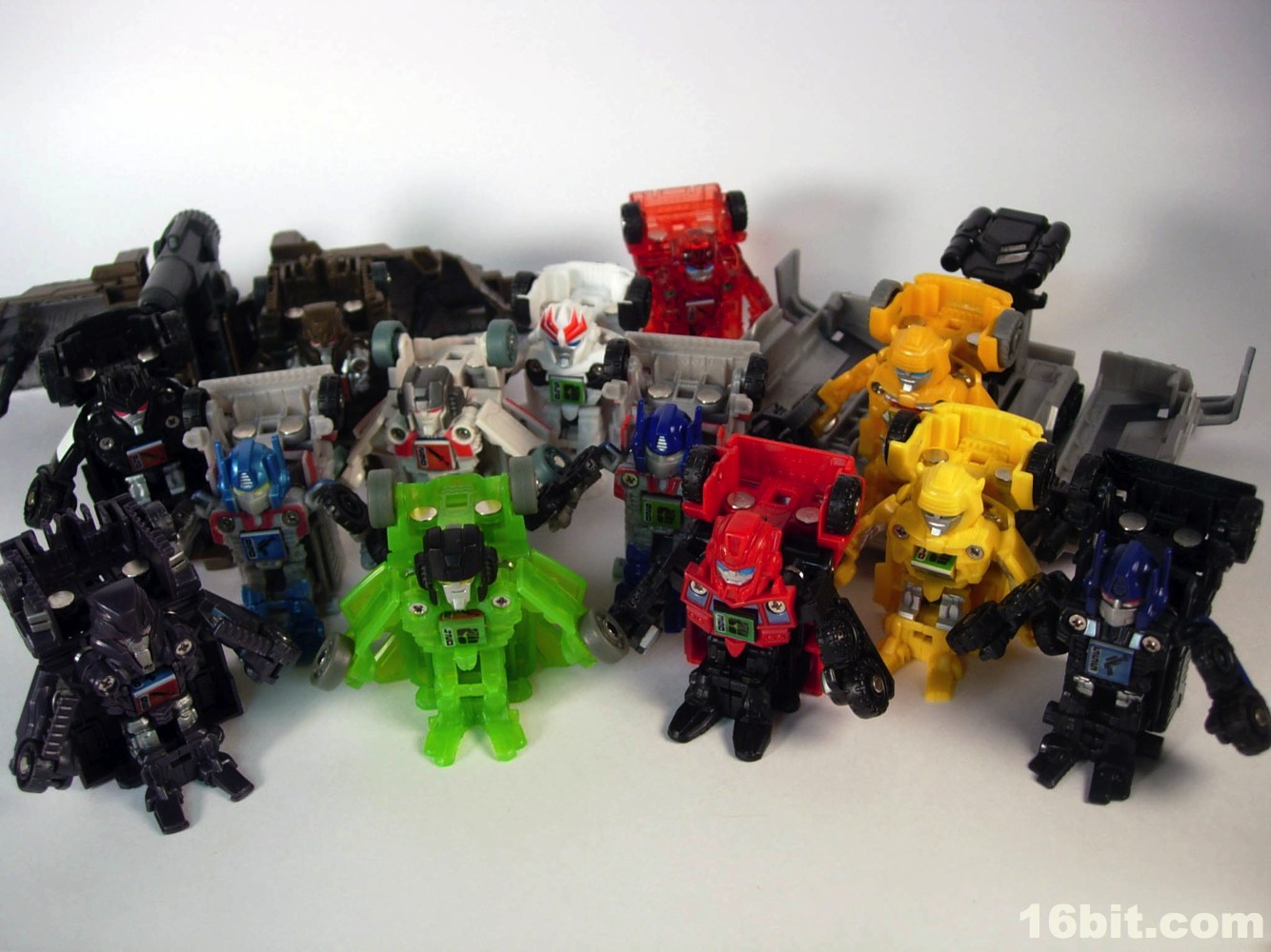 If you like minifigures, this thing is some sort of gift from the heavens. If you open and play with your toys, this is worth picking up. Optimus is a super-deformed long-nosed cab, similar to the appearance of the character in Transformers: Armada from around 2002. He has rolling wheels and a spring-loaded transformation which is activated by a spring-loaded trigger in his bumper. Hasbro says the auto-transformation is best activated by crashing the toy into another one, but this could result in wear-and-tear on the plastic or paint... so you can also push it gently and the little 2-inch dude springs right up. As a robot, he has no meaningful articulation-- the arms stick out, and he just kinda stands there.