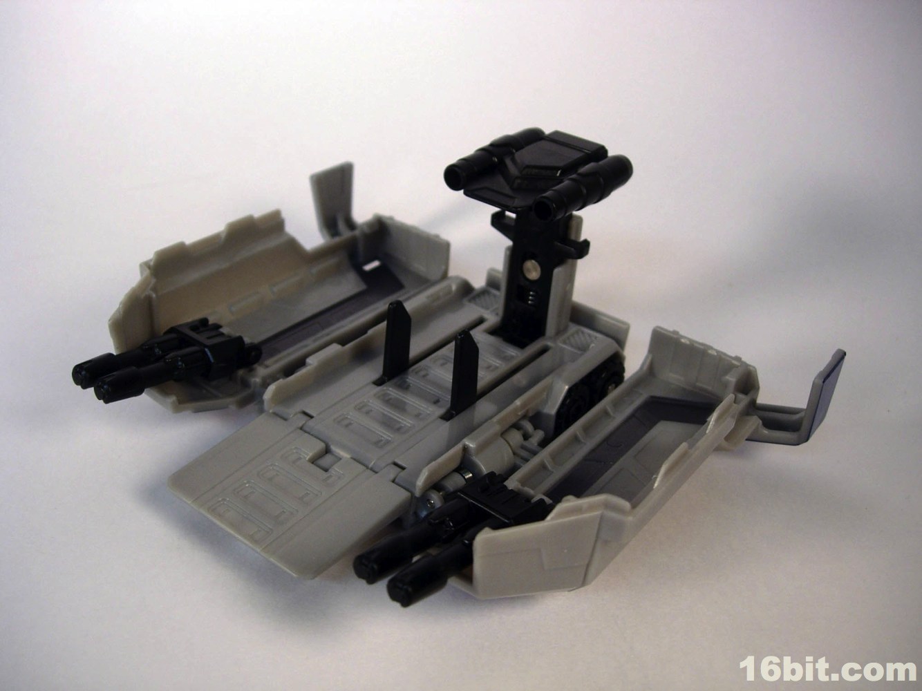 As a vehicle, Optimus rolls nicely and features an Autobot logo as a hood ornament. It's small. The only painted faction symbol in the entire line so far appears on the launcher accessory, which can connect with the Optimus Prime mold and drive around on their wheels. It's pretty cool, plus it has a spring-loaded transformation. Just push down on a little black piece, and it unfolds-- there are some flip-out cannons, too, so you get a little battle station.