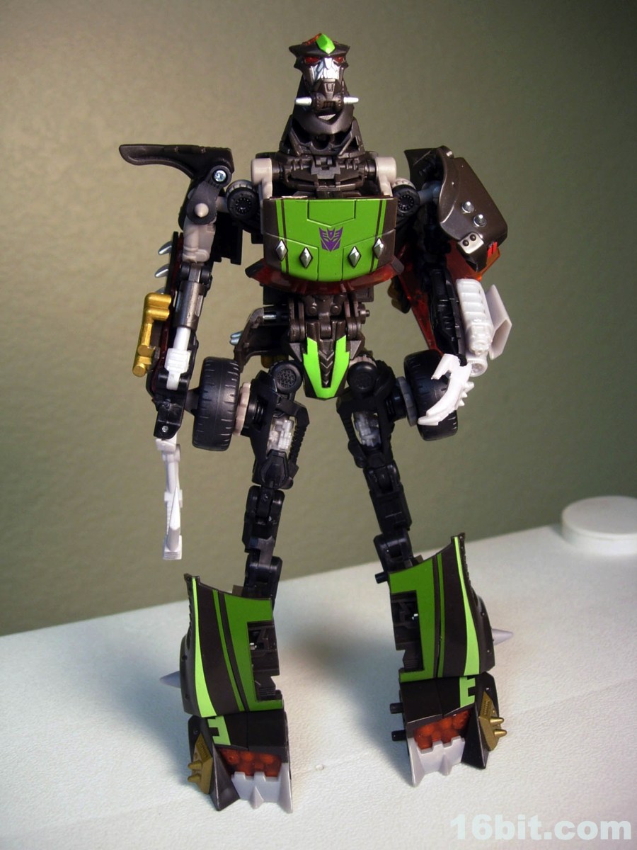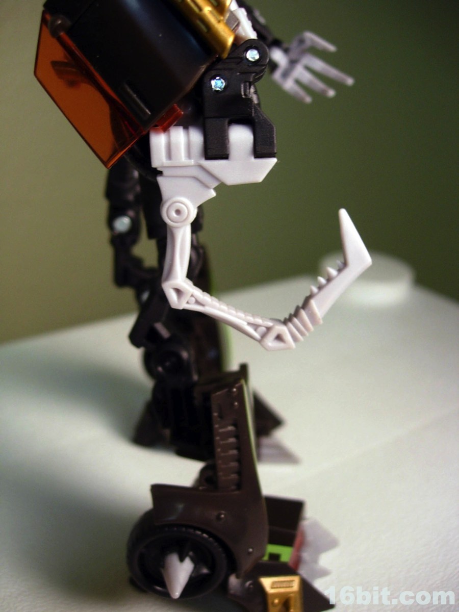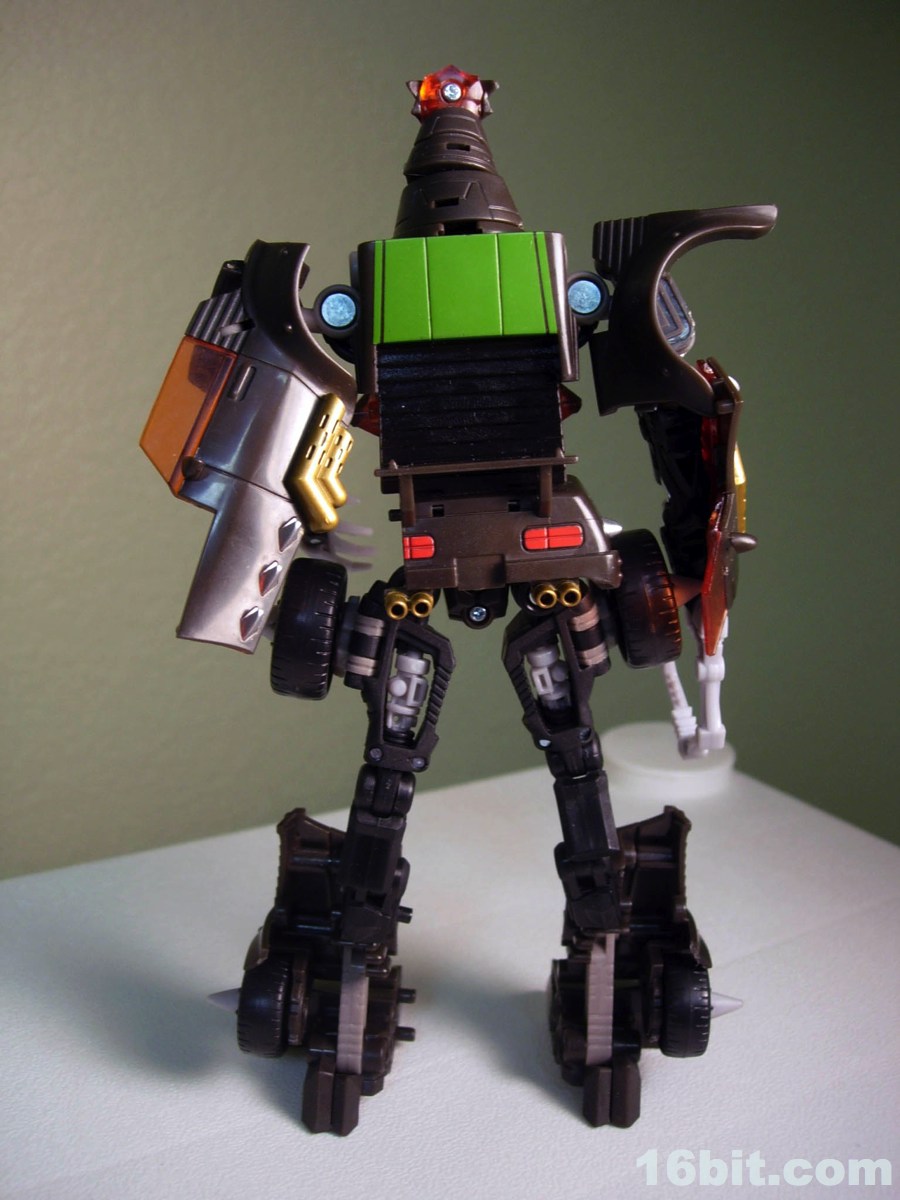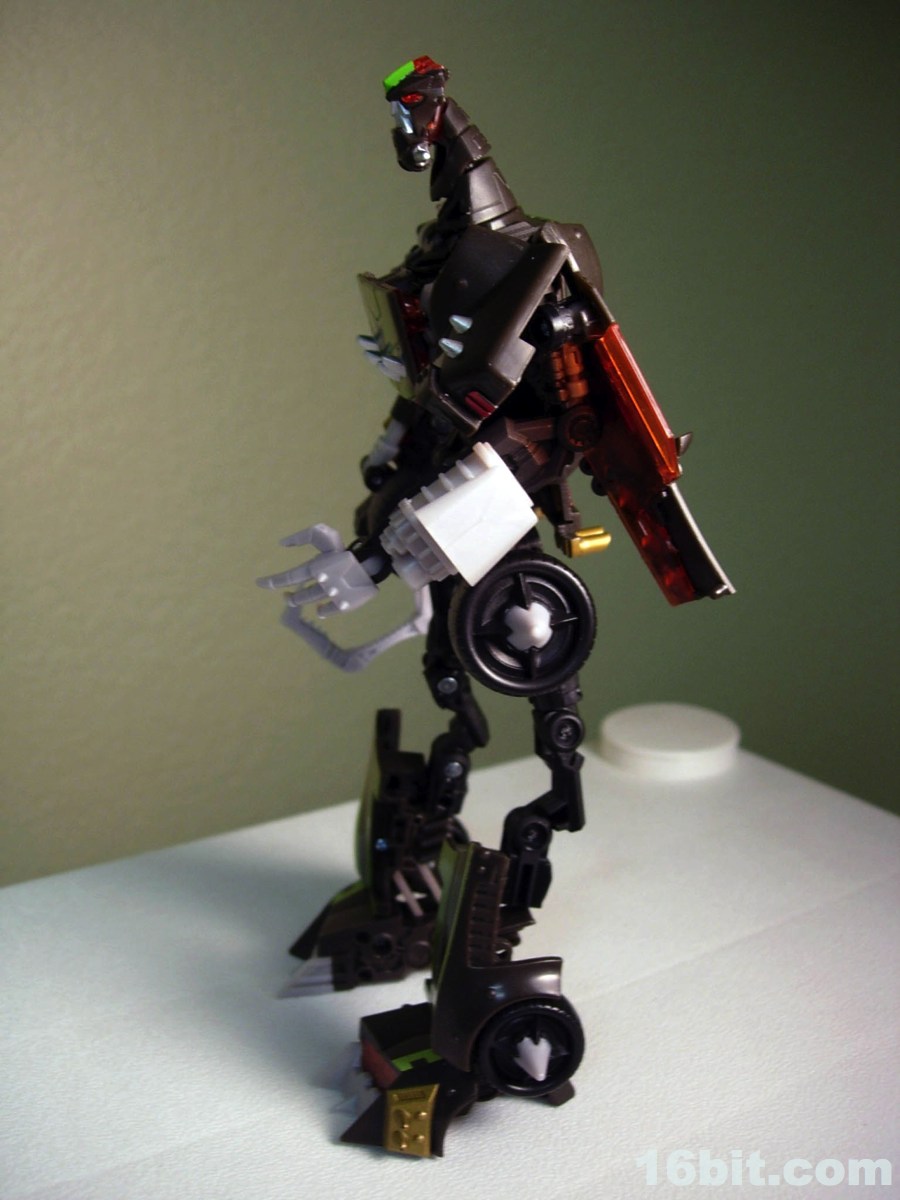 The figure has an exceptional level of articulation. Each knee has multiple bends and swivels, and the head alone has an astonishingly unnecessary 3 joints-- he can be made taller if you position him just right. His giant feet ensure he has no difficulty standing, and his face... well, it's Lockdownish. He almost looks like he has a robotic cookie duster, and if he had just a little more paint or a little more silver below what seems to be his lips, I think he'd be all the better for it. His design retains many of the influences of the Animated character, including a ton of bolts and mismatched pieces. Part of the original concept was a sort of Frankenstein's monster of a robot bounty hunter, who put himself together and continued to upgrade himself after his jobs were over. It's a really neat idea, and apparently fans thought so too-- after all, he's been adopted into the Generation 1 cast of characters, which generally smells like a stamp of approval.