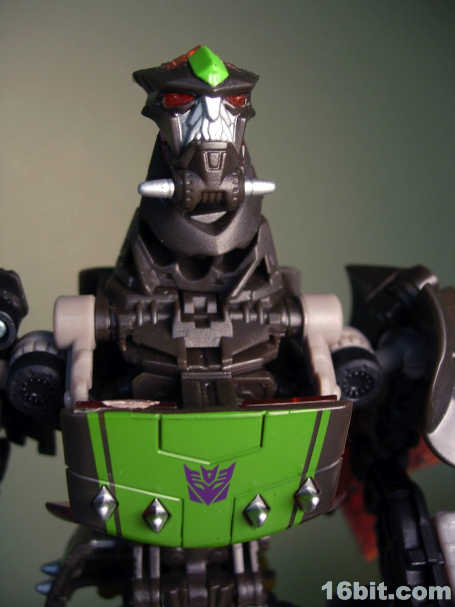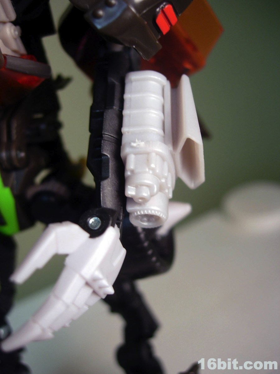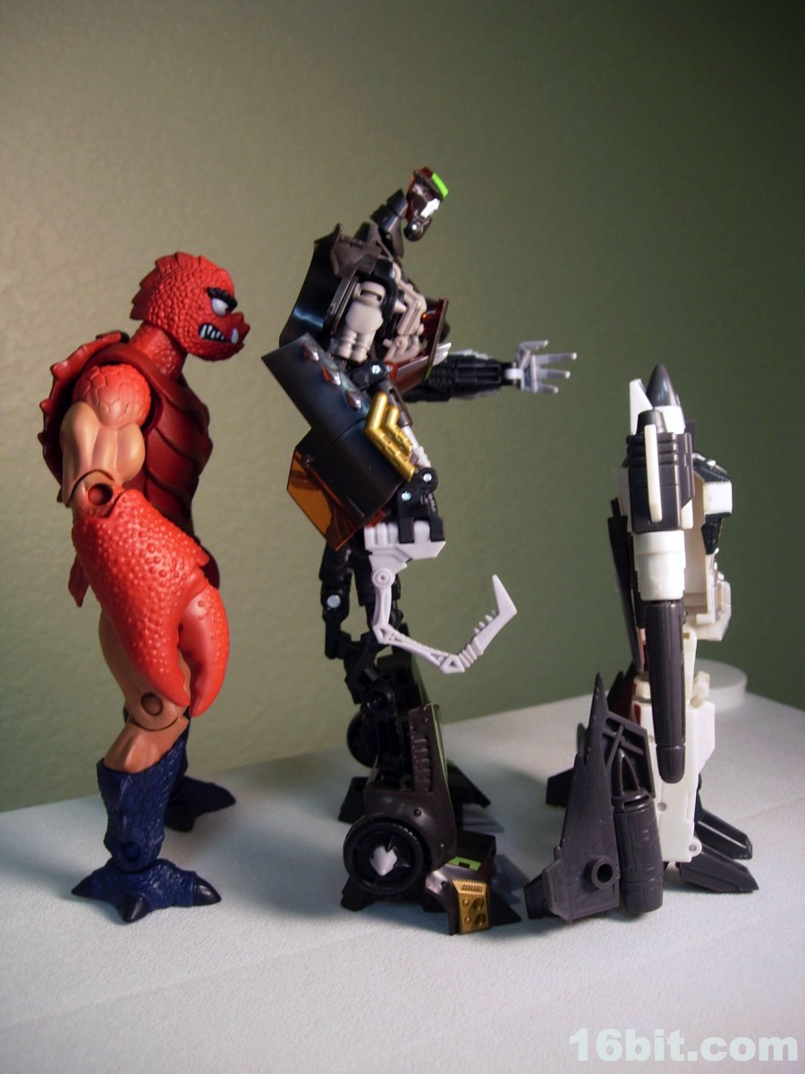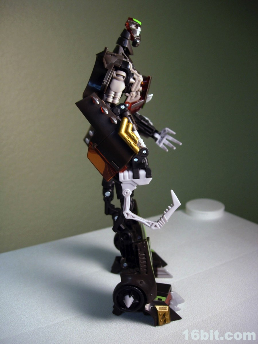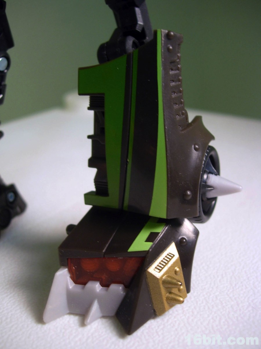 The figure has an exceptional level of articulation. Each knee has multiple bends and swivels, and the head alone has an astonishingly unnecessary 3 joints-- he can be made taller if you position him just right. His giant feet ensure he has no difficulty standing, and his face... well, it's Lockdownish. He almost looks like he has a robotic cookie duster, and if he had just a little more paint or a little more silver below what seems to be his lips, I think he'd be all the better for it. His design retains many of the influences of the Animated character, including a ton of bolts and mismatched pieces. Part of the original concept was a sort of Frankenstein's monster of a robot bounty hunter, who put himself together and continued to upgrade himself after his jobs were over. It's a really neat idea, and apparently fans thought so too-- after all, he's been adopted into the Generation 1 cast of characters, which generally smells like a stamp of approval.