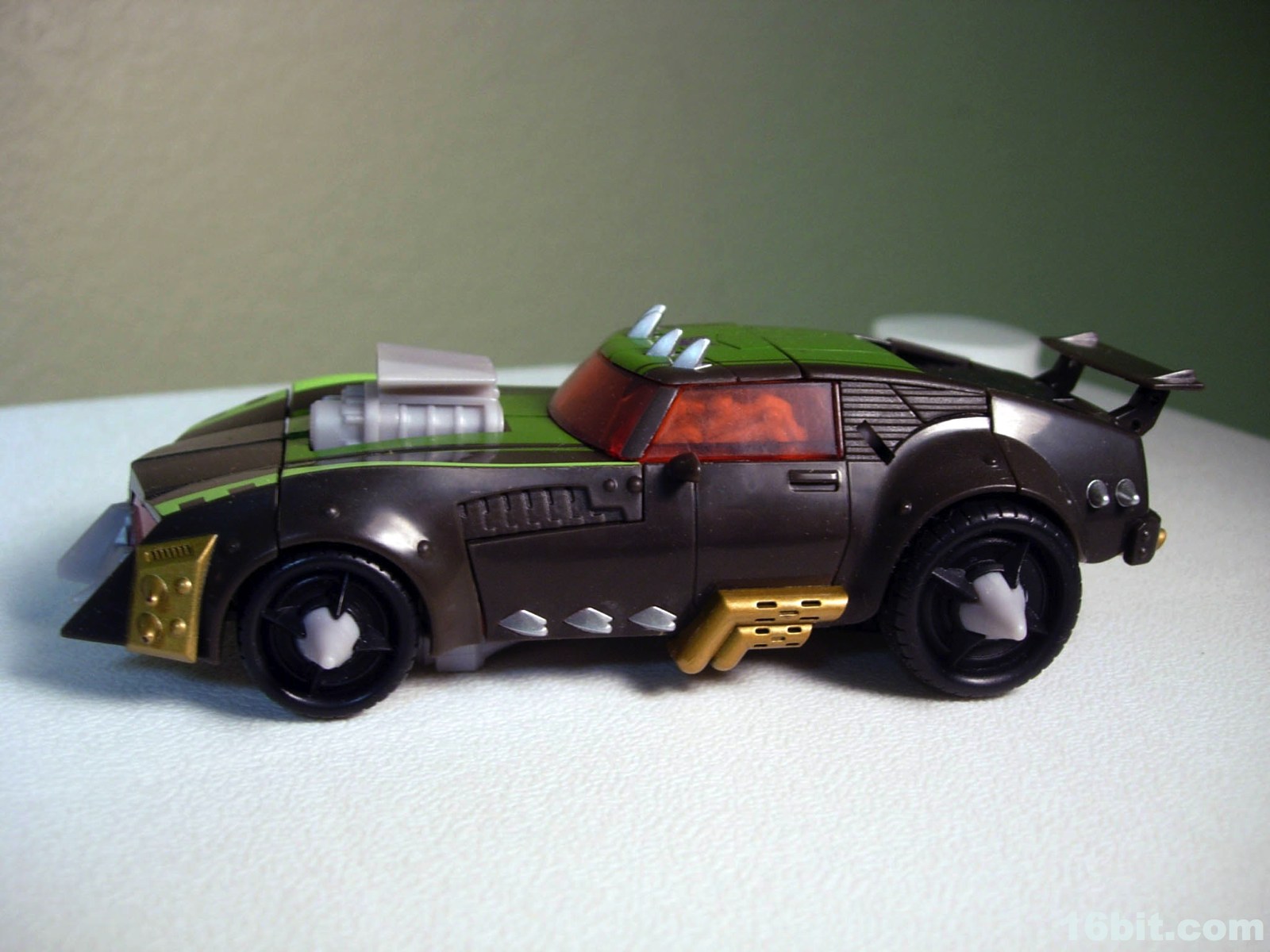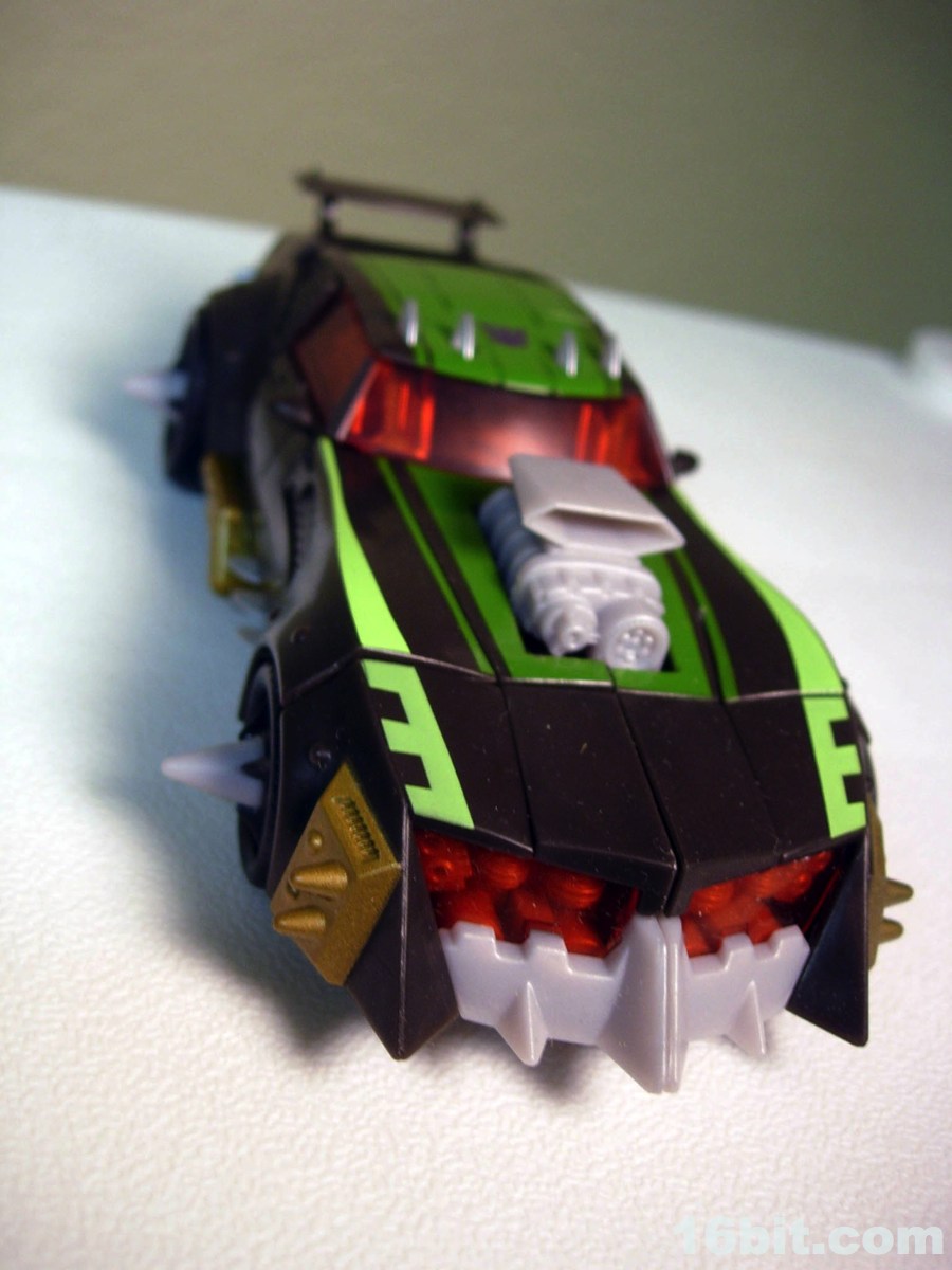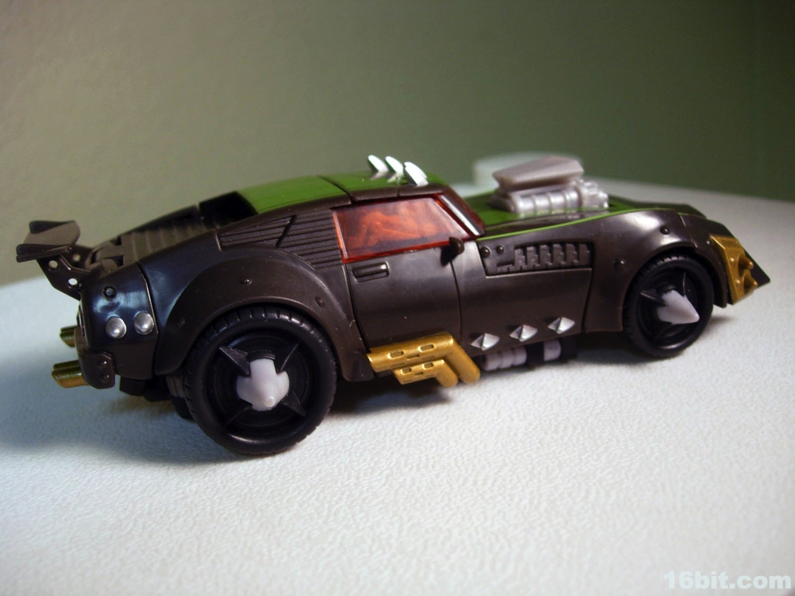 The car mode is muscle car of sorts, but covered in spikes. With a lot of green and gold, it's unlike anything anyone would ever drive and that's precisely why I love it. I've seen normal cars-- they're dull. Part of what I loved about Transformers in the 1980s was a move to "futuristic" vehicles like Hot Rod, Kup, and Blurr giving us something beyond just whatever your weird uncle drives. This car is tricked-out and mean, his spiked hubcaps could do some serious damage on the road. I admire the decision to step away from realism for a bit, and I like that Hasbro delivered something genuinely different from the dozens of Autobots I've bought over the last few years.