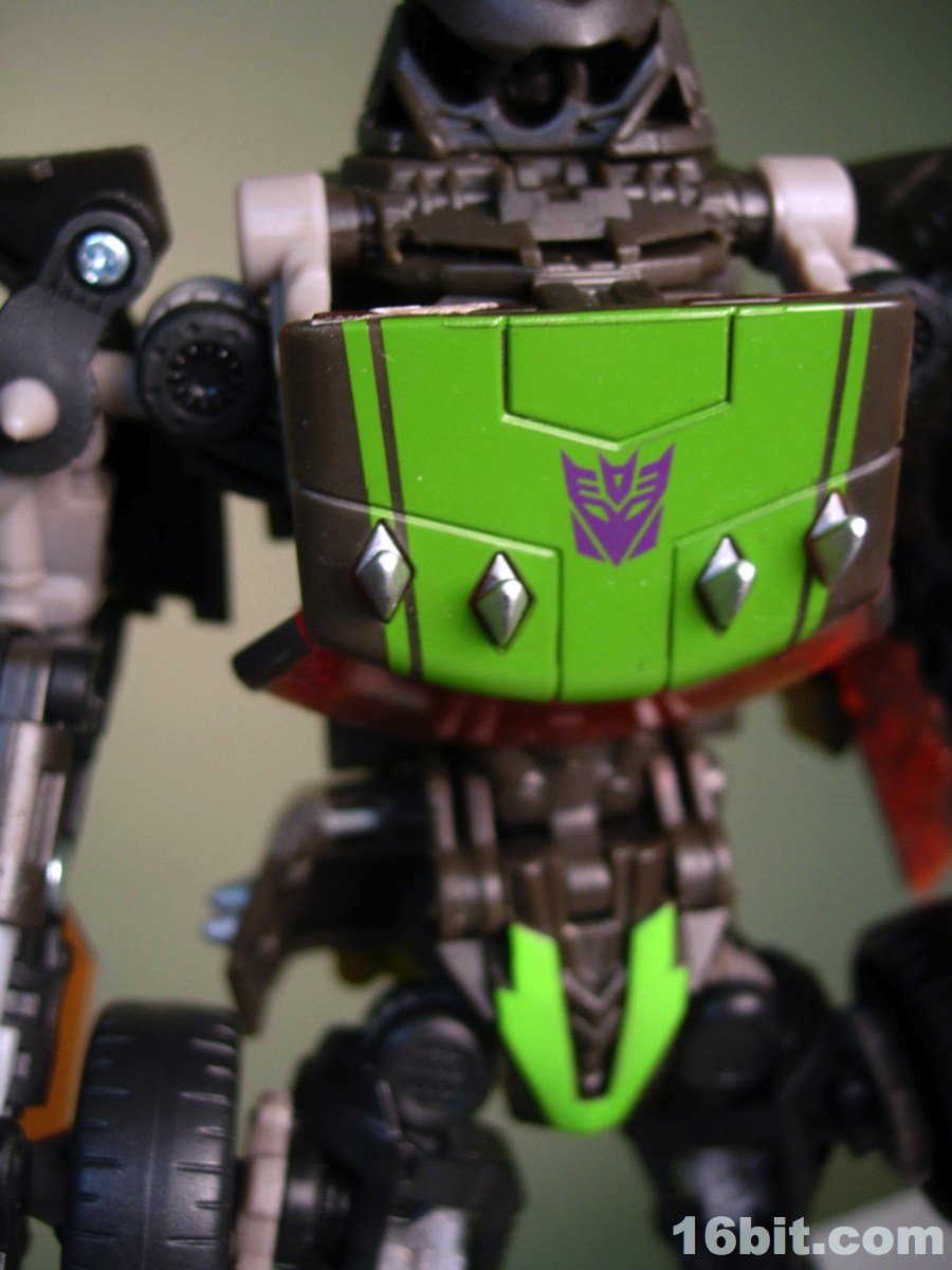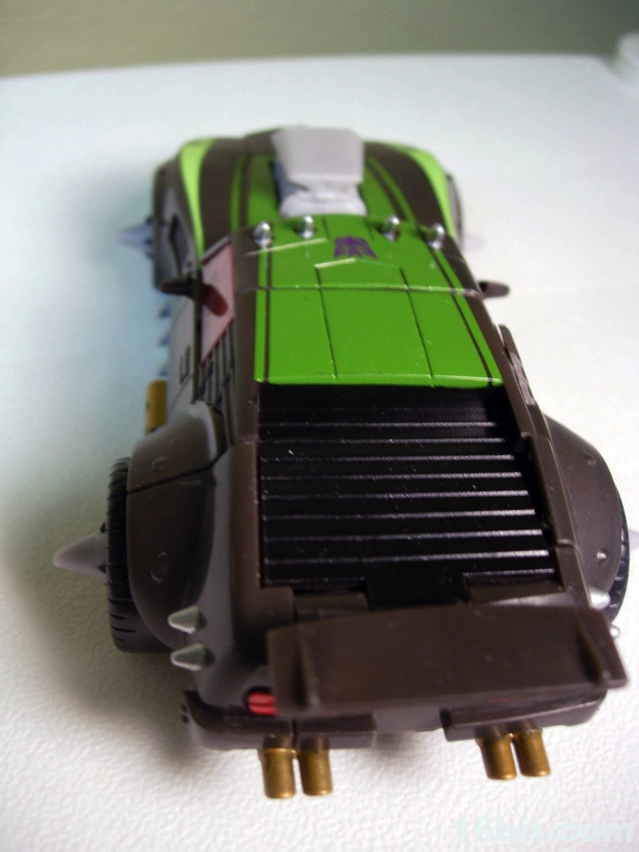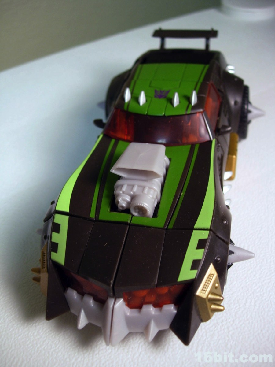 The car mode is muscle car of sorts, but covered in spikes. With a lot of green and gold, it's unlike anything anyone would ever drive and that's precisely why I love it. I've seen normal cars-- they're dull. Part of what I loved about Transformers in the 1980s was a move to "futuristic" vehicles like Hot Rod, Kup, and Blurr giving us something beyond just whatever your weird uncle drives. This car is tricked-out and mean, his spiked hubcaps could do some serious damage on the road. I admire the decision to step away from realism for a bit, and I like that Hasbro delivered something genuinely different from the dozens of Autobots I've bought over the last few years.