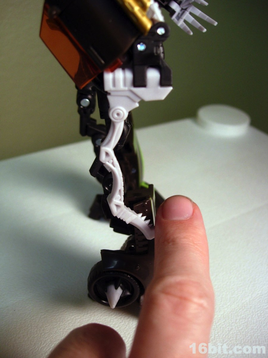 Standing 8-inches tall, this Lockdown is freakishly large just like his Transformers Animated ancestor. As deluxe toys go, he may be the largest ever. Bits of him are a little spindly, namely his legs, but aside from that he's a pretty nifty pile of parts. He doesn't have a lot of gimmicks, but a "Mech Alive" thing is embedded in his thighs-- you may notice some grey pistons and bits inside the black plastic. If you turn his knee joint, these move. And that's all he has going as spring-loaded zany battle features go.