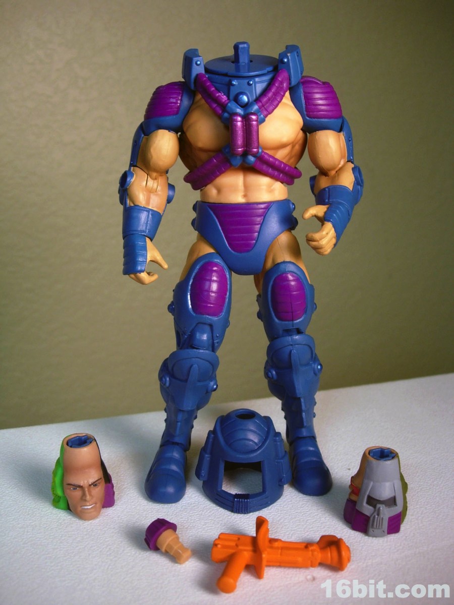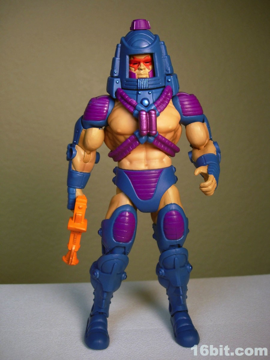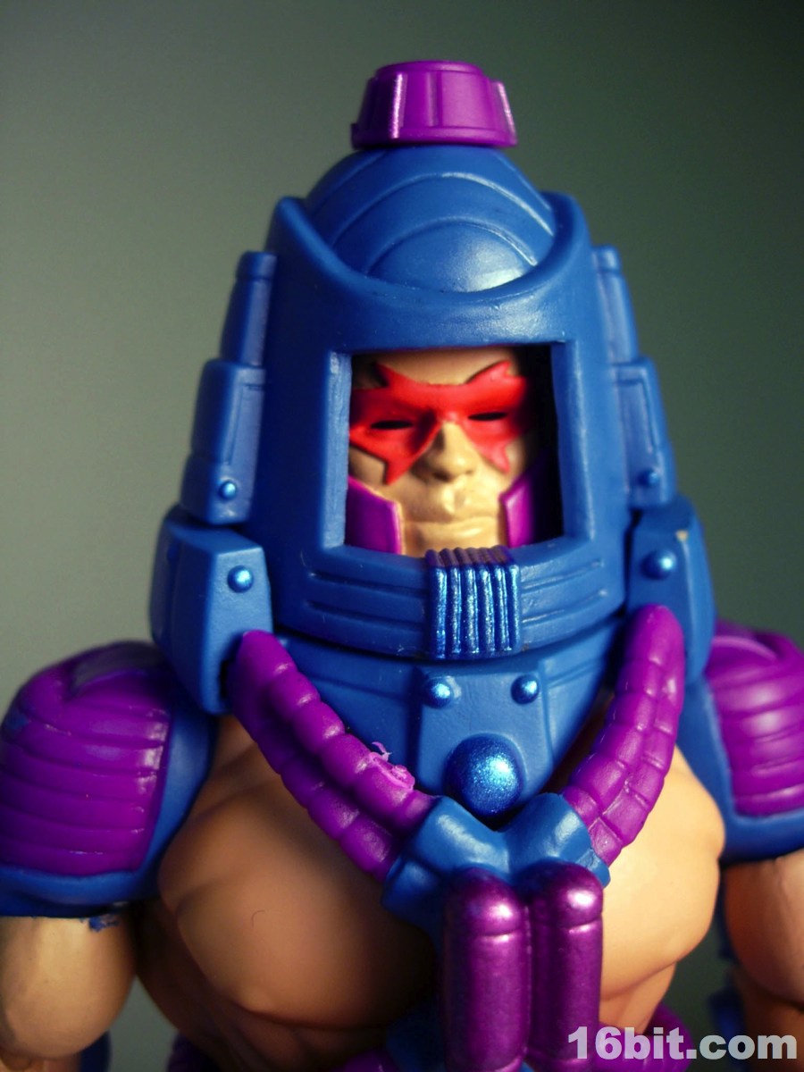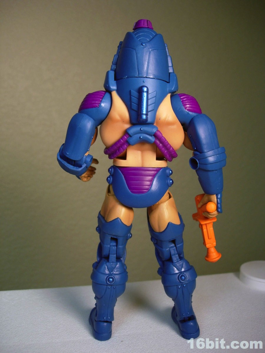 Much like another Four Horsemen-sculpted figure Metamorpho, Man-E-Faces has a dial in his helmet which lets you select between multiple heads. One option allows you to view a robot, man, or monster while the "secret accessory" features He-Man, Skeletor, and Orko. I don't think it was a particularly thrilling extra, but I admire them cramming something new in there-- I'd have been even more excited were it a preview of unannounced figures, or something even weirder. As it stands, it's a neat idea but I almost wish they did it back in the 1980s. A feature like this allows Man-E-Faces to be something of an impostor, but at the same time it would give kids a stand-in for Orko, Skeletor, or He-Man if their parents only got them the one figure. Sure, all he has is a gun, but it still looks vaguely like He-Man in a fancy helmet.