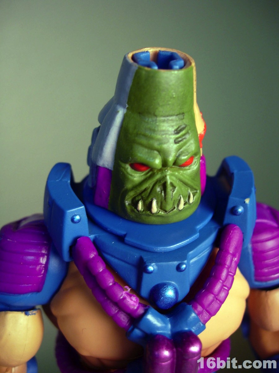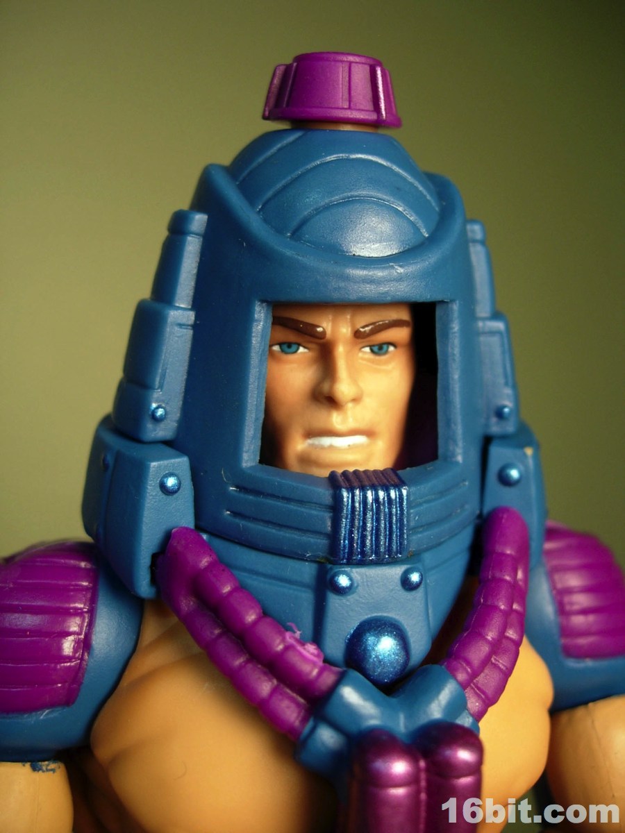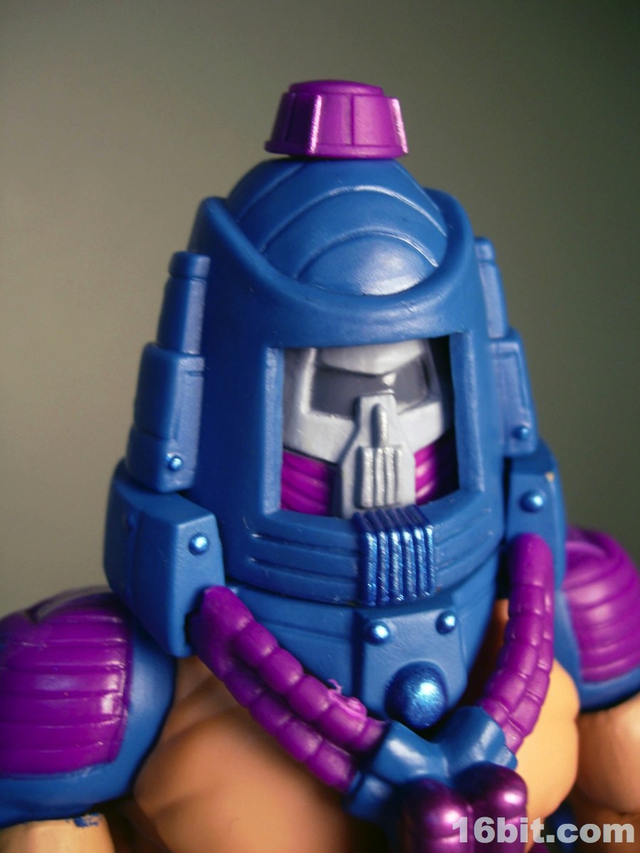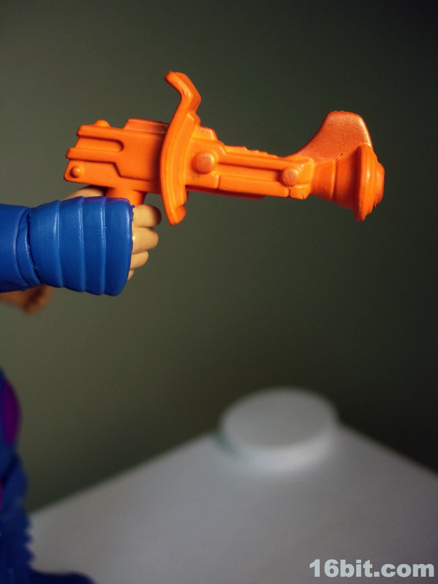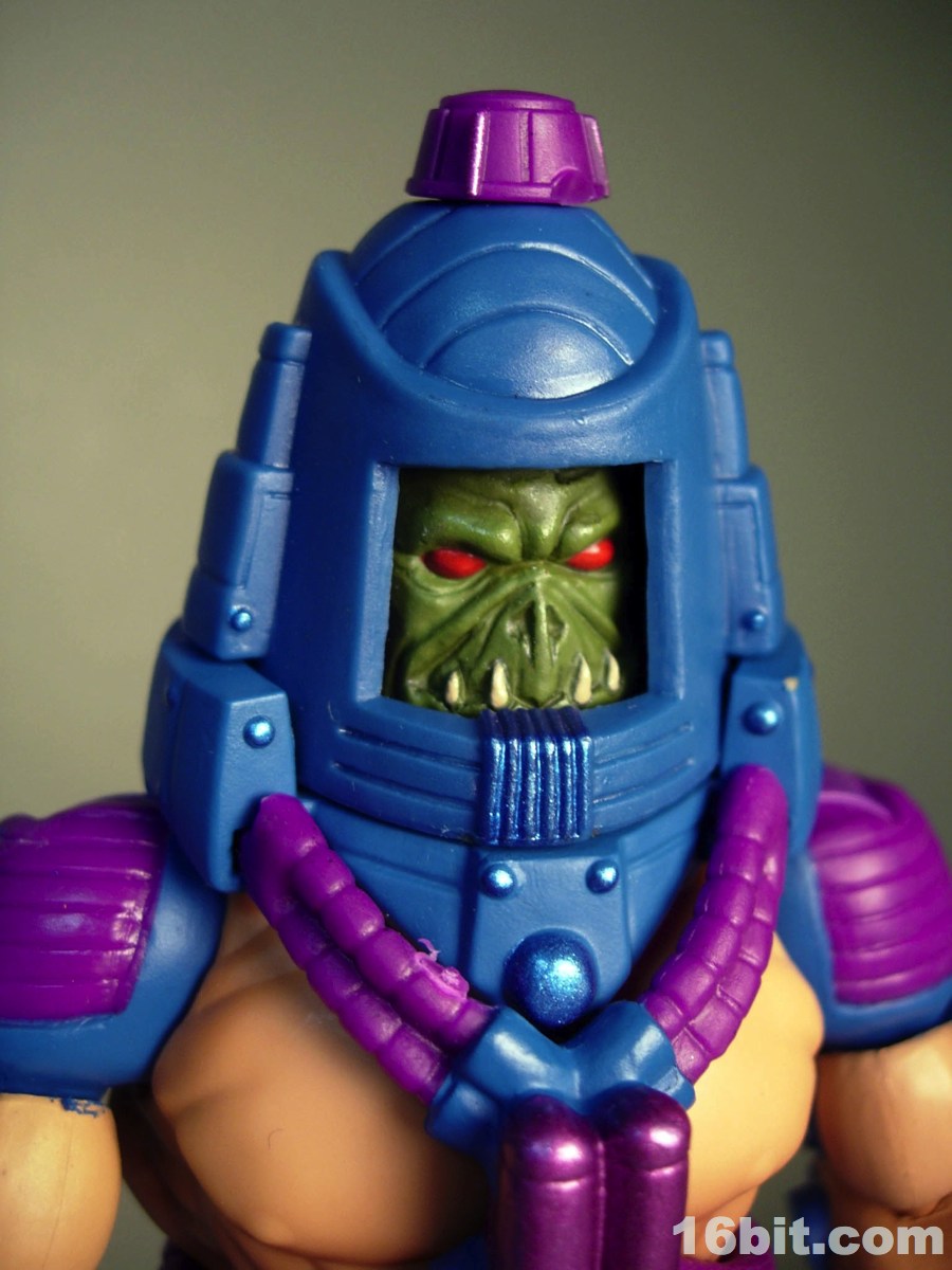 Much like another Four Horsemen-sculpted figure Metamorpho, Man-E-Faces has a dial in his helmet which lets you select between multiple heads. One option allows you to view a robot, man, or monster while the "secret accessory" features He-Man, Skeletor, and Orko. I don't think it was a particularly thrilling extra, but I admire them cramming something new in there-- I'd have been even more excited were it a preview of unannounced figures, or something even weirder. As it stands, it's a neat idea but I almost wish they did it back in the 1980s. A feature like this allows Man-E-Faces to be something of an impostor, but at the same time it would give kids a stand-in for Orko, Skeletor, or He-Man if their parents only got them the one figure. Sure, all he has is a gun, but it still looks vaguely like He-Man in a fancy helmet.