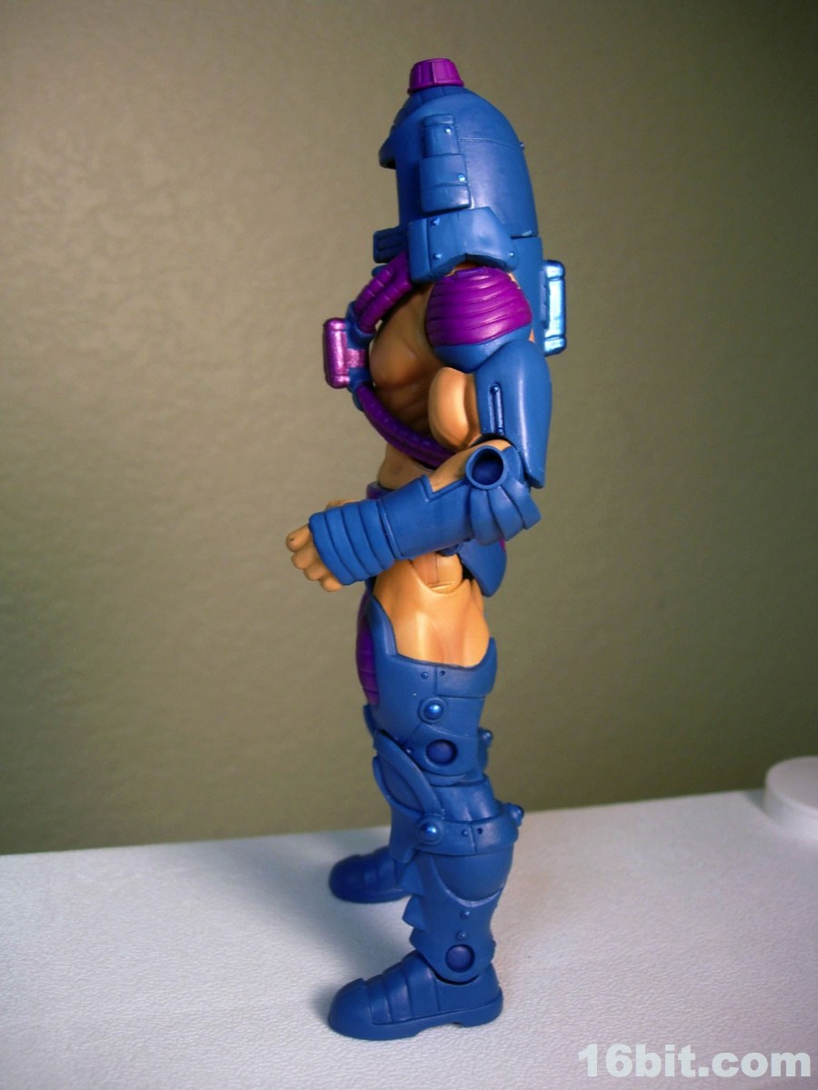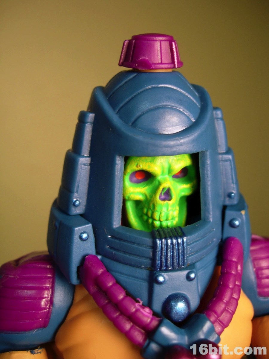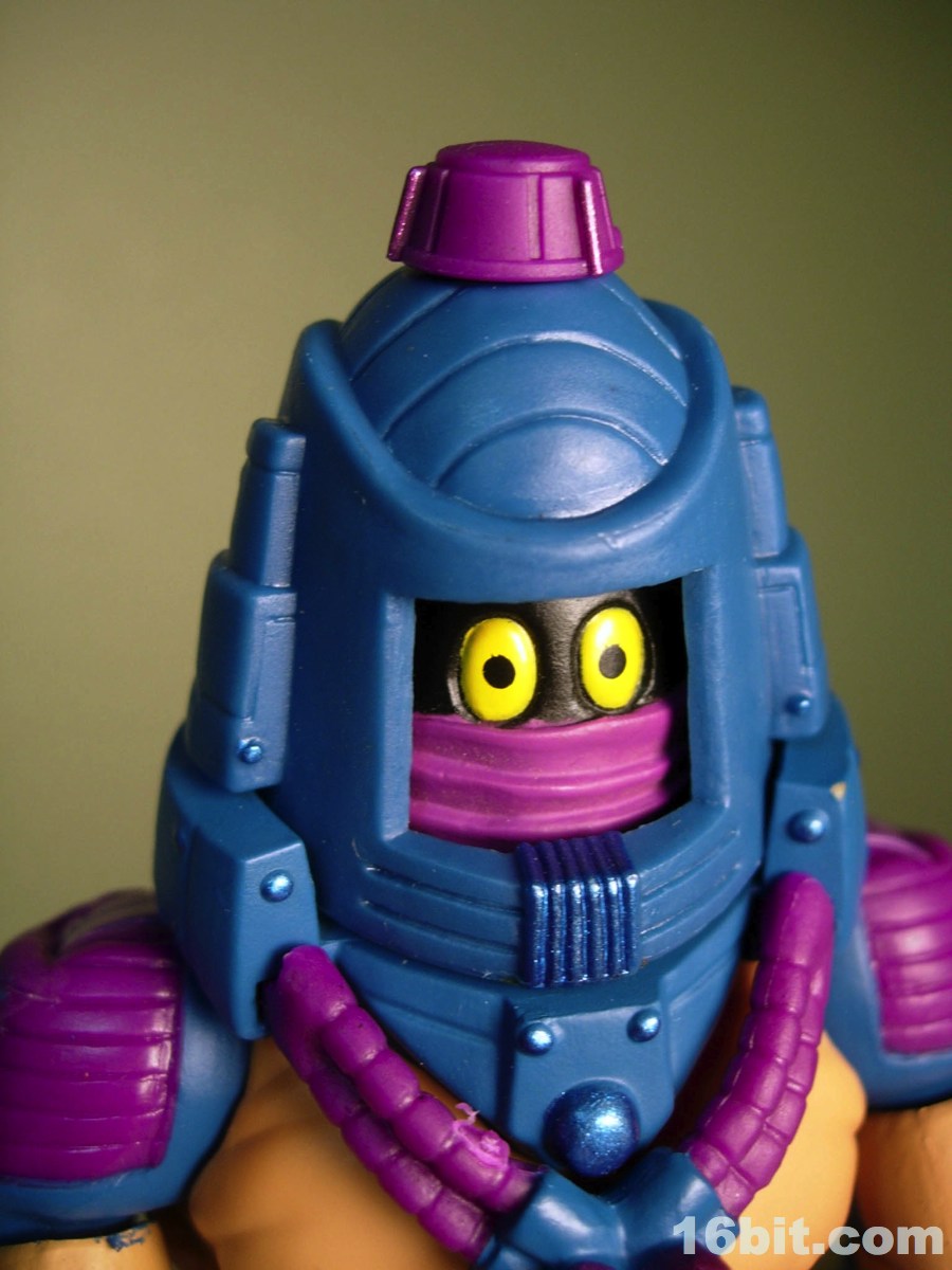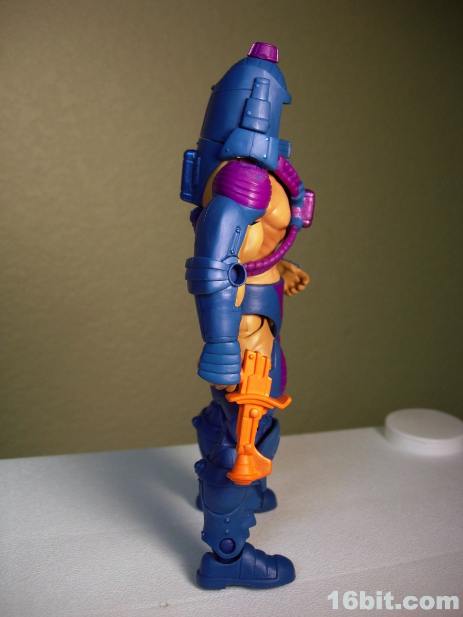Much like another Four Horsemen-sculpted figure Metamorpho, Man-E-Faces has a dial in his helmet which lets you select between multiple heads. One option allows you to view a robot, man, or monster while the "secret accessory" features He-Man, Skeletor, and Orko. I don't think it was a particularly thrilling extra, but I admire them cramming something new in there-- I'd have been even more excited were it a preview of unannounced figures, or something even weirder. As it stands, it's a neat idea but I almost wish they did it back in the 1980s. A feature like this allows Man-E-Faces to be something of an impostor, but at the same time it would give kids a stand-in for Orko, Skeletor, or He-Man if their parents only got them the one figure. Sure, all he has is a gun, but it still looks vaguely like He-Man in a fancy helmet.